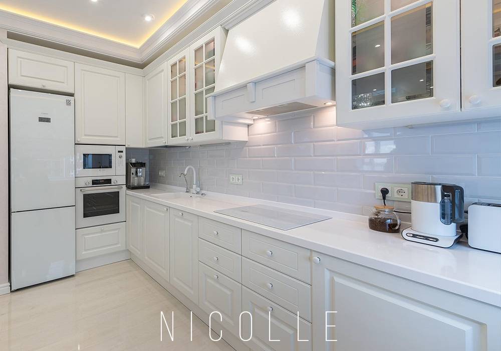 - Total white: фасады из МДФ с покрытием матовой эмалью оттенка «античный белый», столешница из искусственного камня Corian и даже ручки на дверцах в таком же цвете.