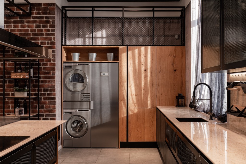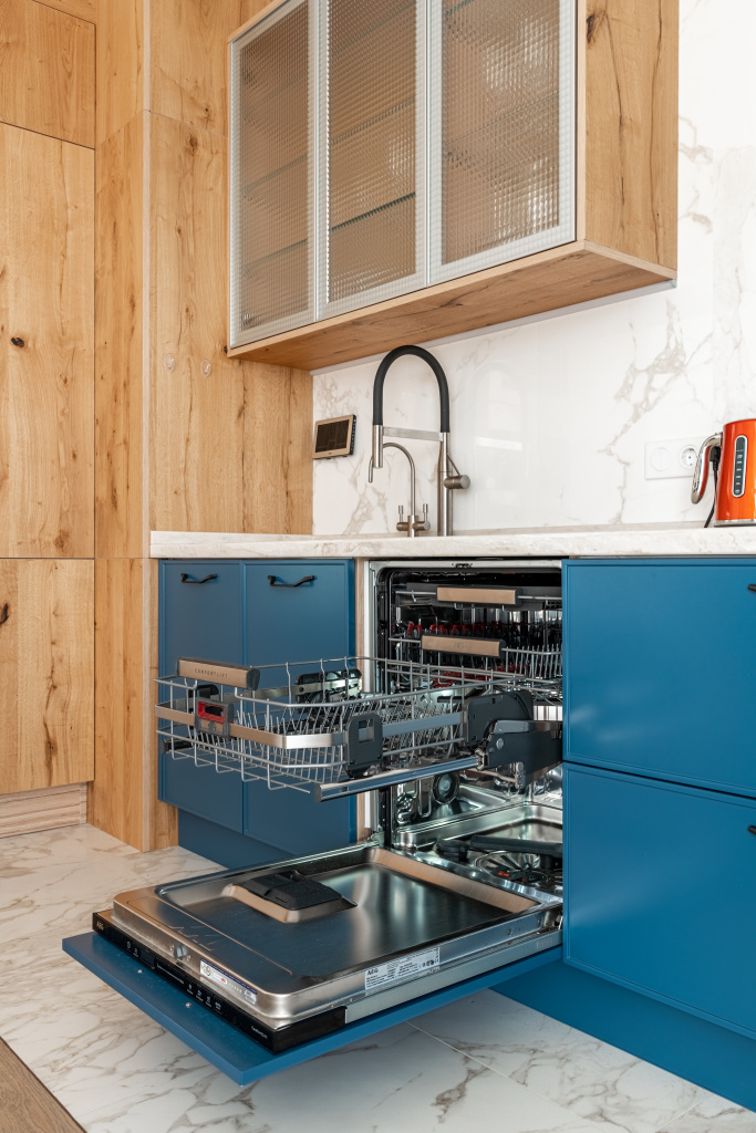 - Стиральная и посудомоечная машины. Посудомоечную машину удобно встраивать рядом с мойкой – это упрощает подвод воды и подключение к канализации, кроме того, пользоваться ею в этом случае проще. Встроить стиральную машину, наоборот, лучше подальше от основной рабочей зоны на кухне.