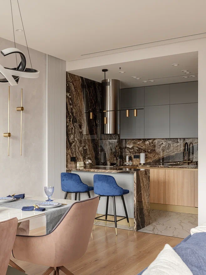 Кухня, разработанная для телеведущего Андрея Разыграева, стала просто кладезем полезных «фишек» и нестандартных решений. Использовали специальные механизмы и сделали небольшие отсеки для хранения.