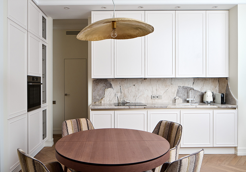 Верхние шкафы размещают на высоте, удобной для хозяев: стоящий человек должен без труда дотягиваться до нижней полки. Как правило, это 135–150 см от нижней кромки шкафчика до уровня пола. Стандартная высота столешницы — 85 см, то есть между ней и дном навесного шкафа останется 45–65 см свободной стены, которые нужно закрыть фартуком. Если хозяева решат отказаться от стандартов и повесят шкафы выше или ниже, соответственно, изменится и размер фартука. Иногда верхние шкафы размещают под самым потолком или совсем не используют навесные шкафы. В этом случае высота кухонного фартука может увеличиваться до 115 см + 2 см на припуск.