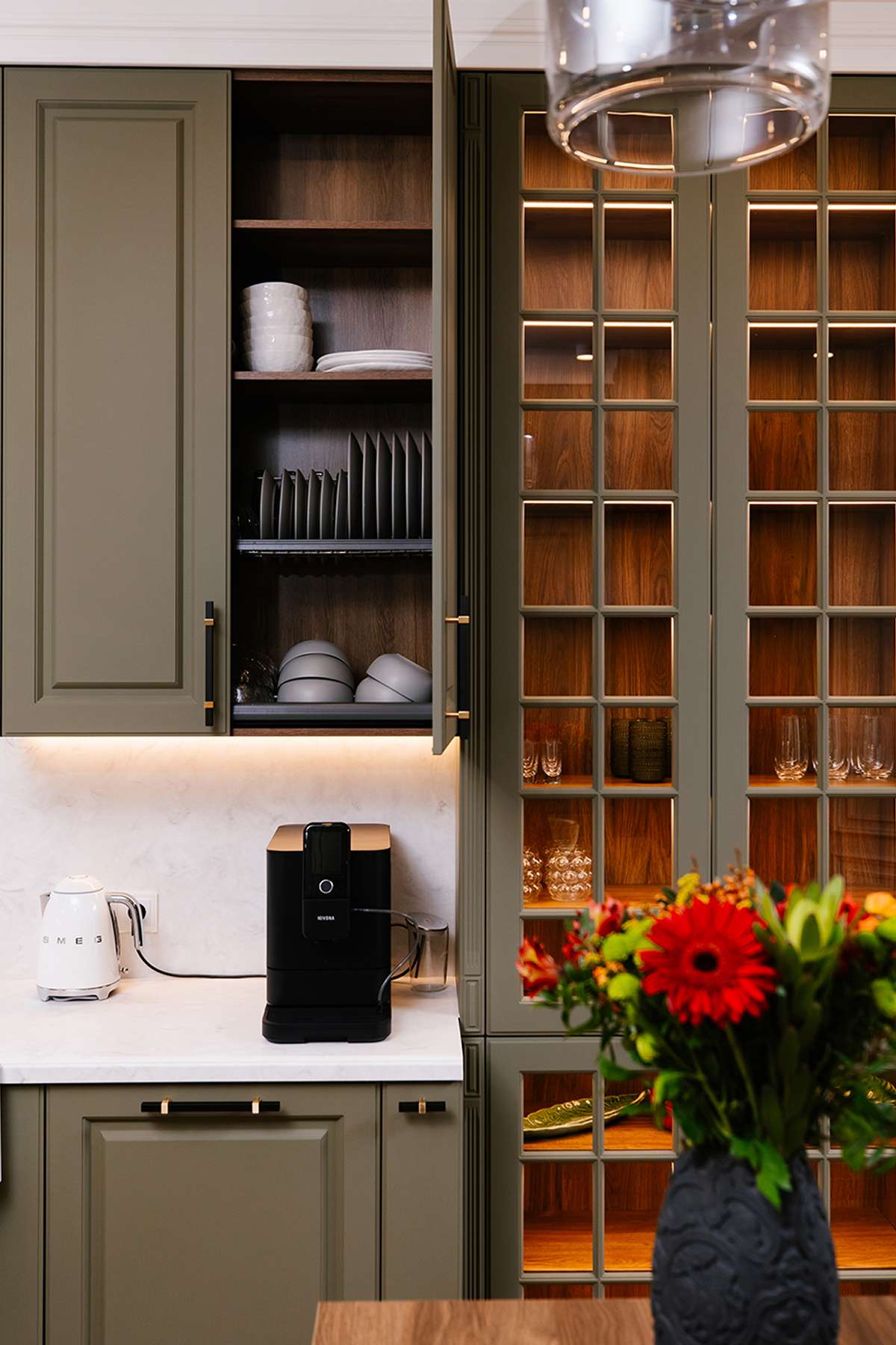 Настоящим украшением пространства стали шкафы-витрины с эффектной внутренней подсветкой. Они добавляют интерьеру воздушности, игры света, а вечером позволяют создать уютную камерную атмосферу. Агата подходит к наполнению этих шкафов с особым чувством, как к созданию личной коллекции. «Пока еще не все заполнили, но специально не тороплюсь, — делится она. — Хочется, чтобы здесь были только красивые и памятные вещи». Каждая секция постепенно станет маленьким музеем — местом для дорогой посуды и подаренных друзьями сервизов, где каждая деталь имеет значение и несет в себе особые эмоции и приятные воспоминания.