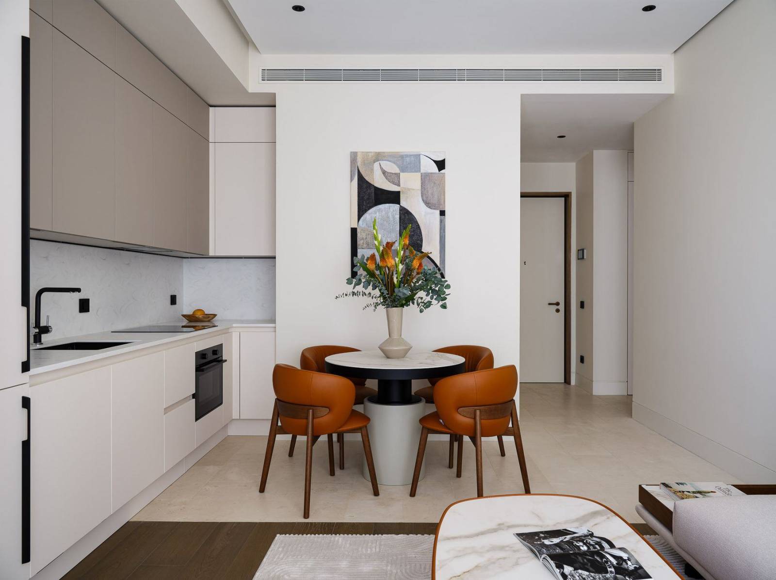 Акцентные терракотовые кресла с кожаной отделкой — отличное завершение образа светлой кухни, превращающее её в арт-объект.