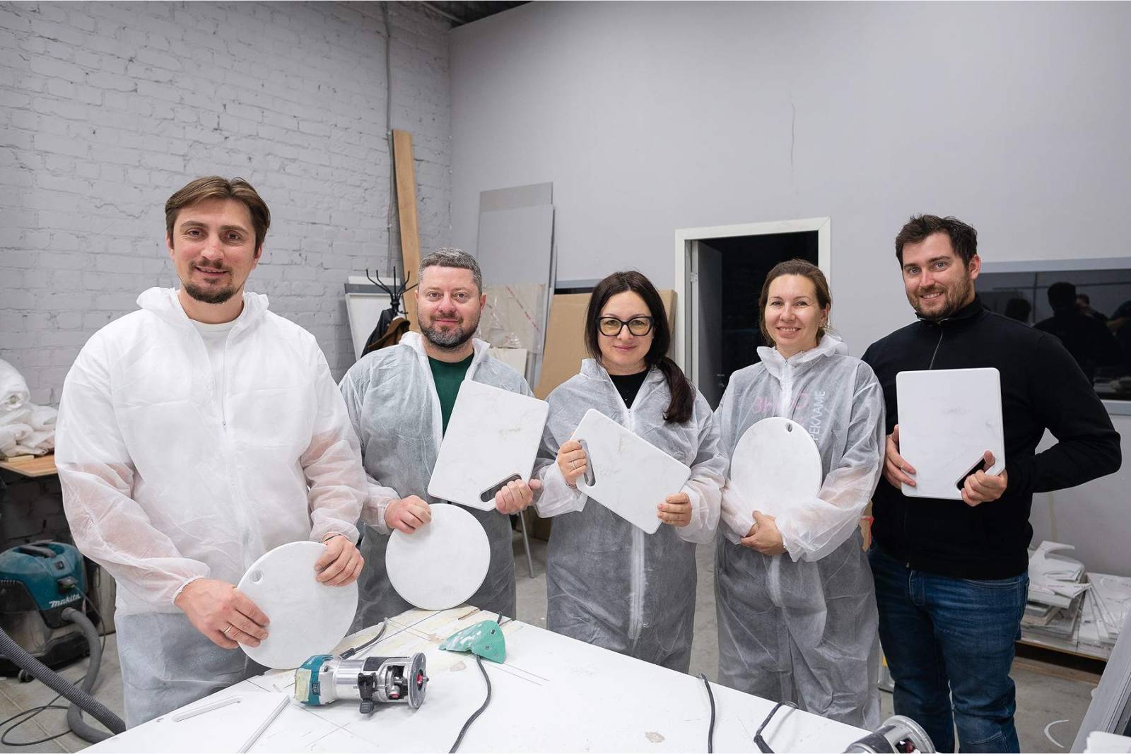 В завершение экскурсии гости приняли участие в нашем фирменном интерактиве — мастер-классе по работе с искусственным камнем. Они самостоятельно изготовили разделочные доски, сувениры на память о посещении фабрики.