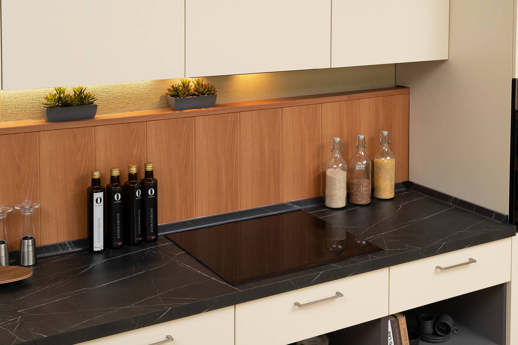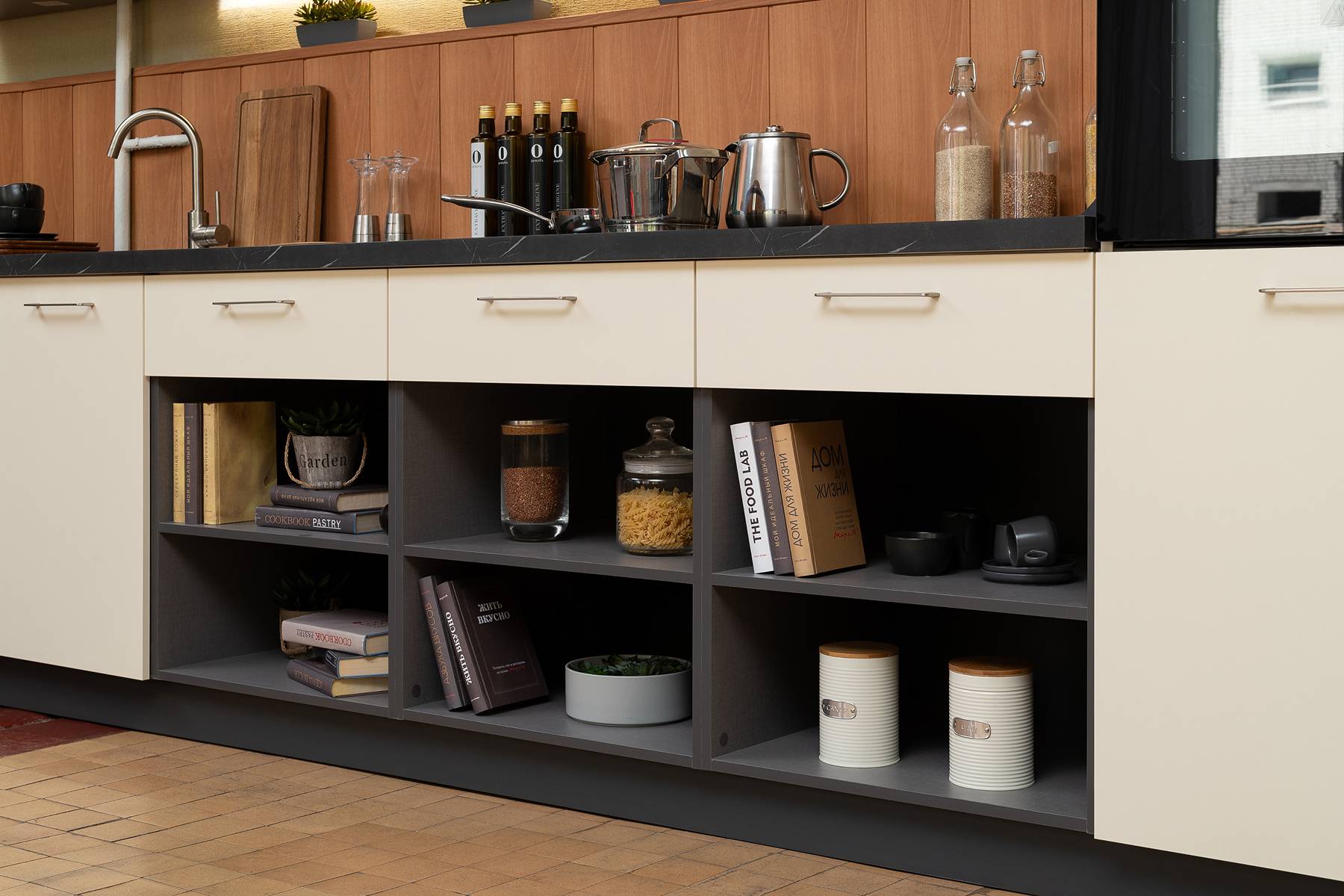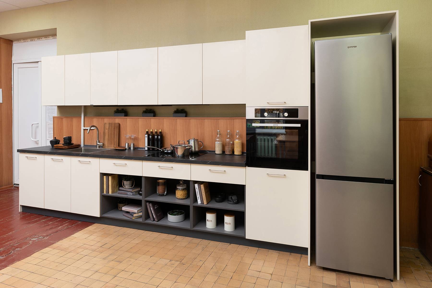 Мебель для учебного класса была изготовлена по индивидуальному дизайн-проекту. Специалисты «Марии» учли все нюансы планировки классного помещения и предусмотрели возможность для комфортной коллективной работы ребят. Для реализации задачи идеально подошла лаконичная модель Tokyo. Практичные немаркие фасады цвета «слоновая кость» из надежной ДСП с ламинированным покрытием не требуют сложного ухода, а столешница трендового оттенка «камень пьетра черный» придают кухне стильность. Пространство организовано максимально рационально: выдвижные ящики, сушилка для посуды, лоток для столовых приборов, встроенное ведро для мусора и подсветка рабочей зоны обеспечивают порядок и удобство.