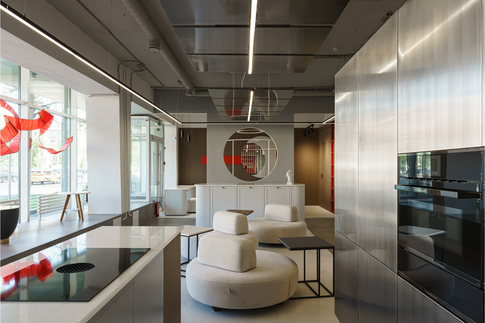 В новом флагманском шоуруме на площади 434 кв. м, представлены не только кухни – визитная карточка бренда, но и шкафы, гардеробные, мебель для ванных и прачечных, диваны и кровати. В шоуруме есть традиционное пространство выставочных образцов, дизайн-лаборатория с технической кухней и идеальным шкафом. Экскурсию по студии для гостей провел Денис Юдин, креативный директор Компании «Мария». Особое внимание уделили арт-апартаментам Максима Кашина. Необычное пространство, названное автором «Мечты русского авангарда», реализовывает идеи супрематистов в интерьере. Оригинальный интерьер стал продолжением проекта поддержки российского дизайна «Иммерсивные апартаменты»: специалисты «Марии» строят в своих шоурумах квартиры по проектам российских дизайнеров и архитекторов, давая им возможность реализовать творческие идеи и показать работу широкой аудитории, фабрике – продемонстрировать свои возможности в комплексном проектировании, клиентам —найти вдохновение для создания интерьера в собственном доме.