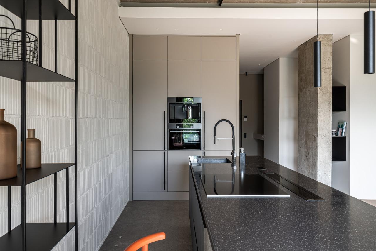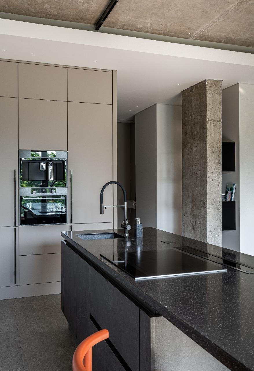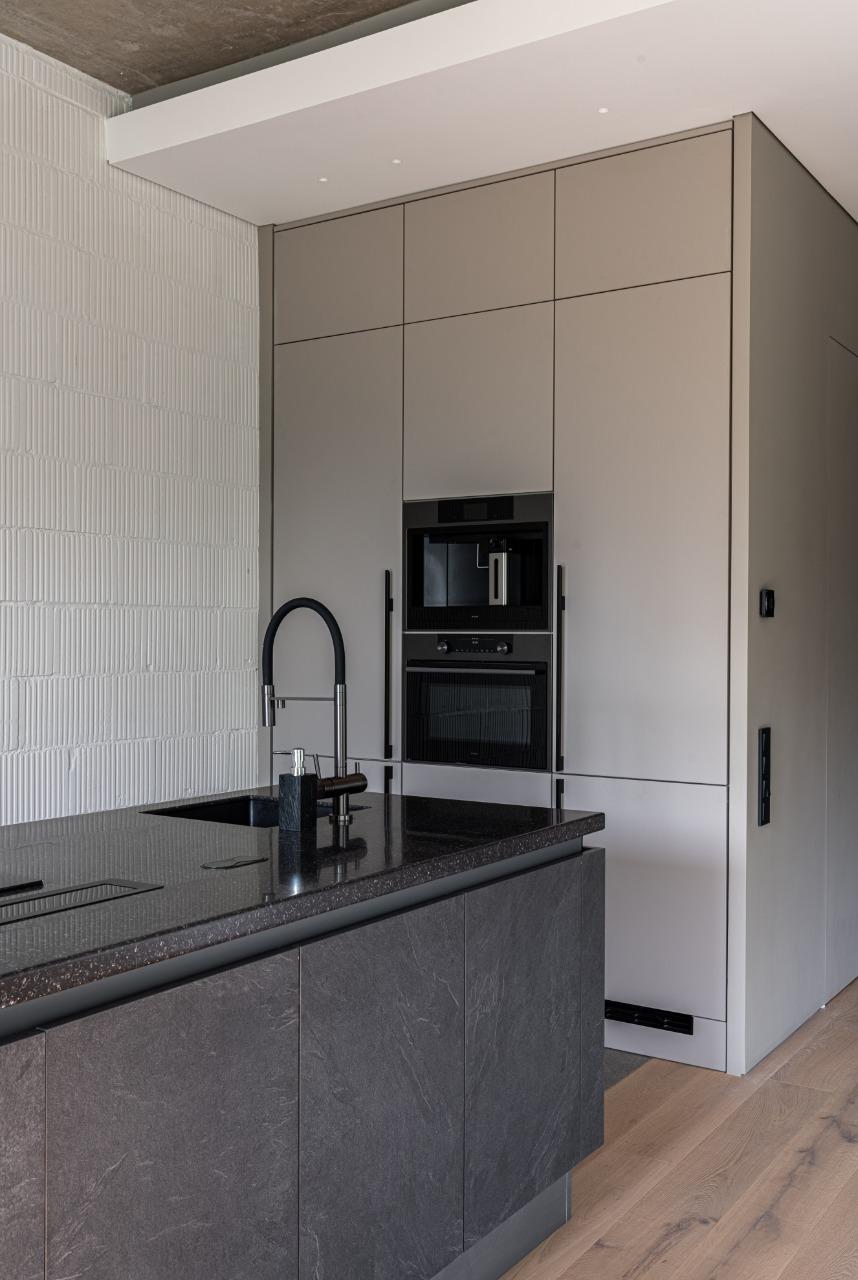 Для реализации дизайна кухни для звезды были выбраны две модели: Vector и Ice. Центром композиции стал остров, облицованный фасадами Vector в глубоком оттенке «сланец графит». А для высоких колонн, где хранится вся кухонная утварь, использовали модель Ice в цвете «шёлк графитовый».
