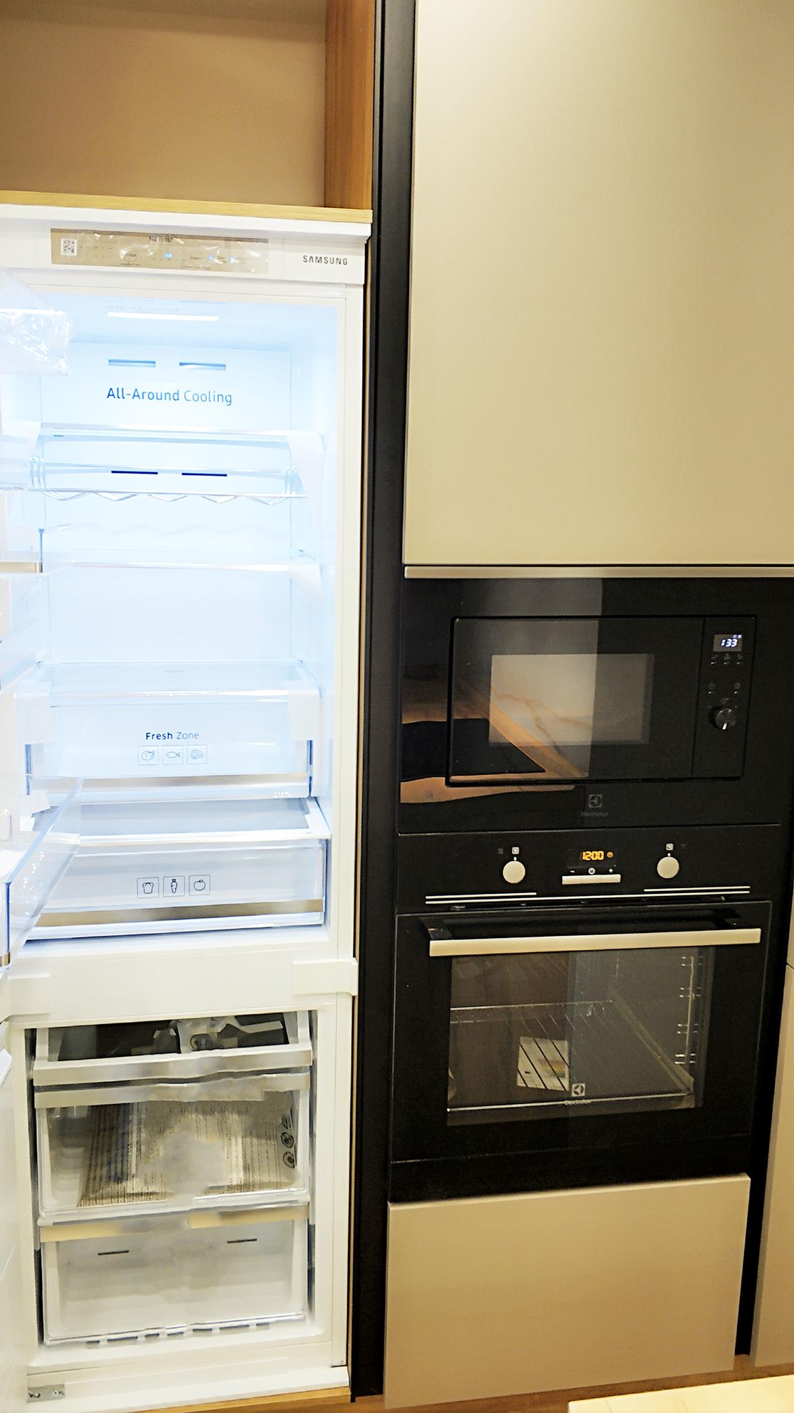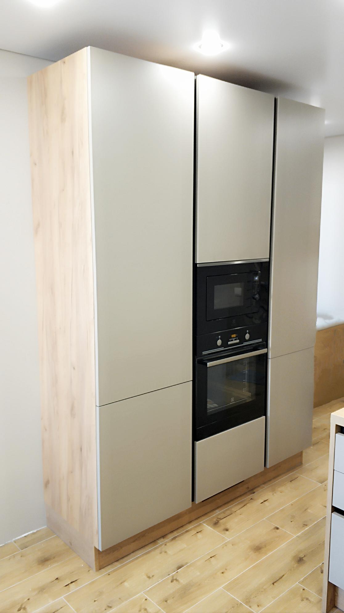 О проектеОписаниеНебольшой кухонный гарнитур получился очень стильным, ярким и максимально функциональным для своих размеров. Мы выстроили грамотную геометрию рабочего треугольника, спроектировали достаточное количество секций для хранения продуктов и кухонной утвари и встроили всю необходимую для клиента технику. Для этого мы также отдельно разработали вместительные секции-колонны, в которые разместили встроенный холодильник, СВЧ-печь и духовой шкаф. Также у нас получилось очень удачно декорировать гарнитур: для этого мы использовали витражные секции модели Intuit со стеклом Vega, которые украсили подсветкой.