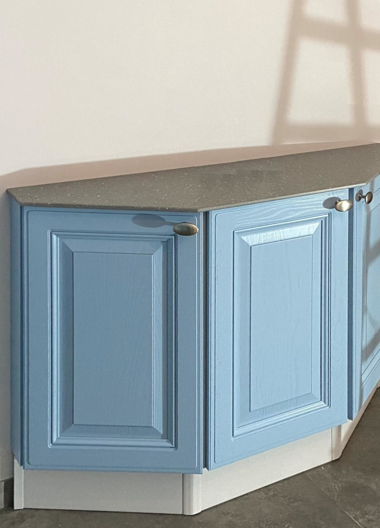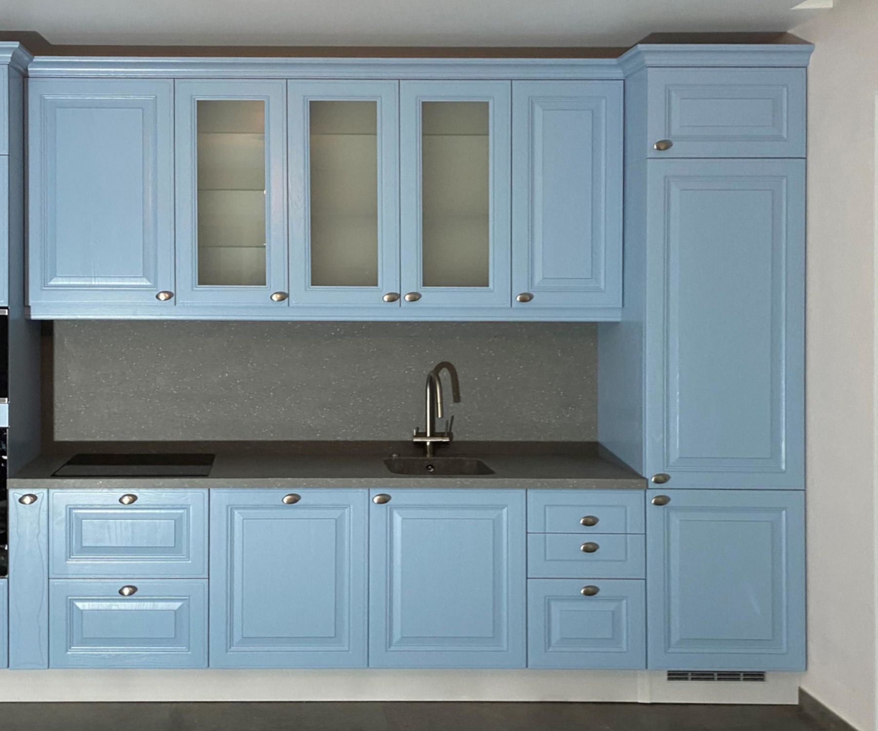 О проектеОписаниеОттенок для покраски фасадов из ясеня выбирали индивидуально из веера NCS (S-2020-B). Сочный и свежий голубой оттенок подчеркивает серо-бежевая столешница и стеновая панель из искусственного камня.* Стекло "пунто" вышло из производства, но наши специалисты с удовольствием подберут для вас максимально похожи и оптимальный вариант.