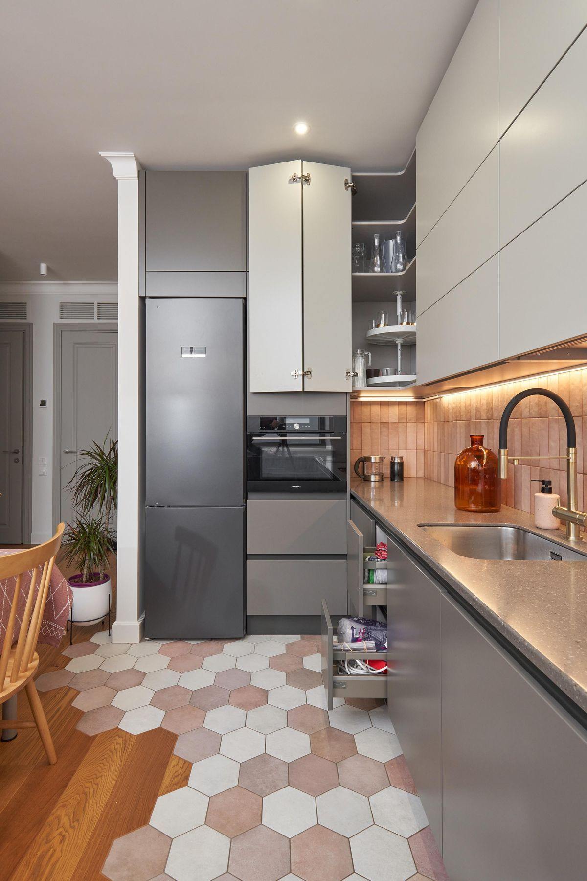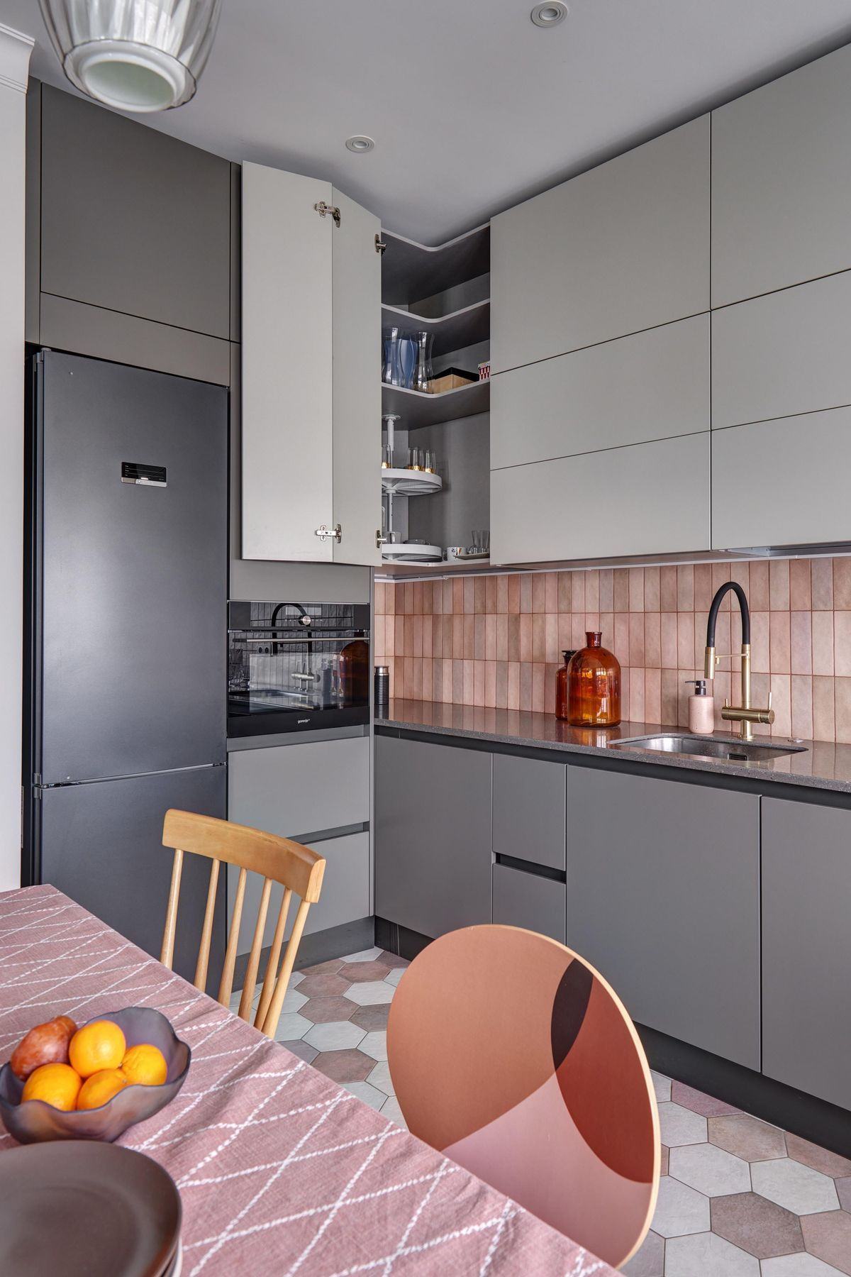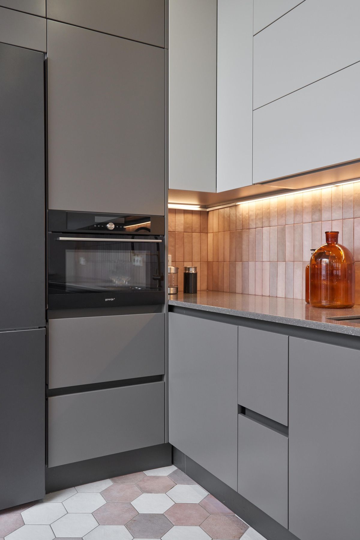 Цветовой акцент: В качестве персонализированной детали мы добавили нежный розовый подтон для верхних шкафов. Это смягчило строгий серый цвет и добавило интерьеру теплоты, которую хотела клиентка.