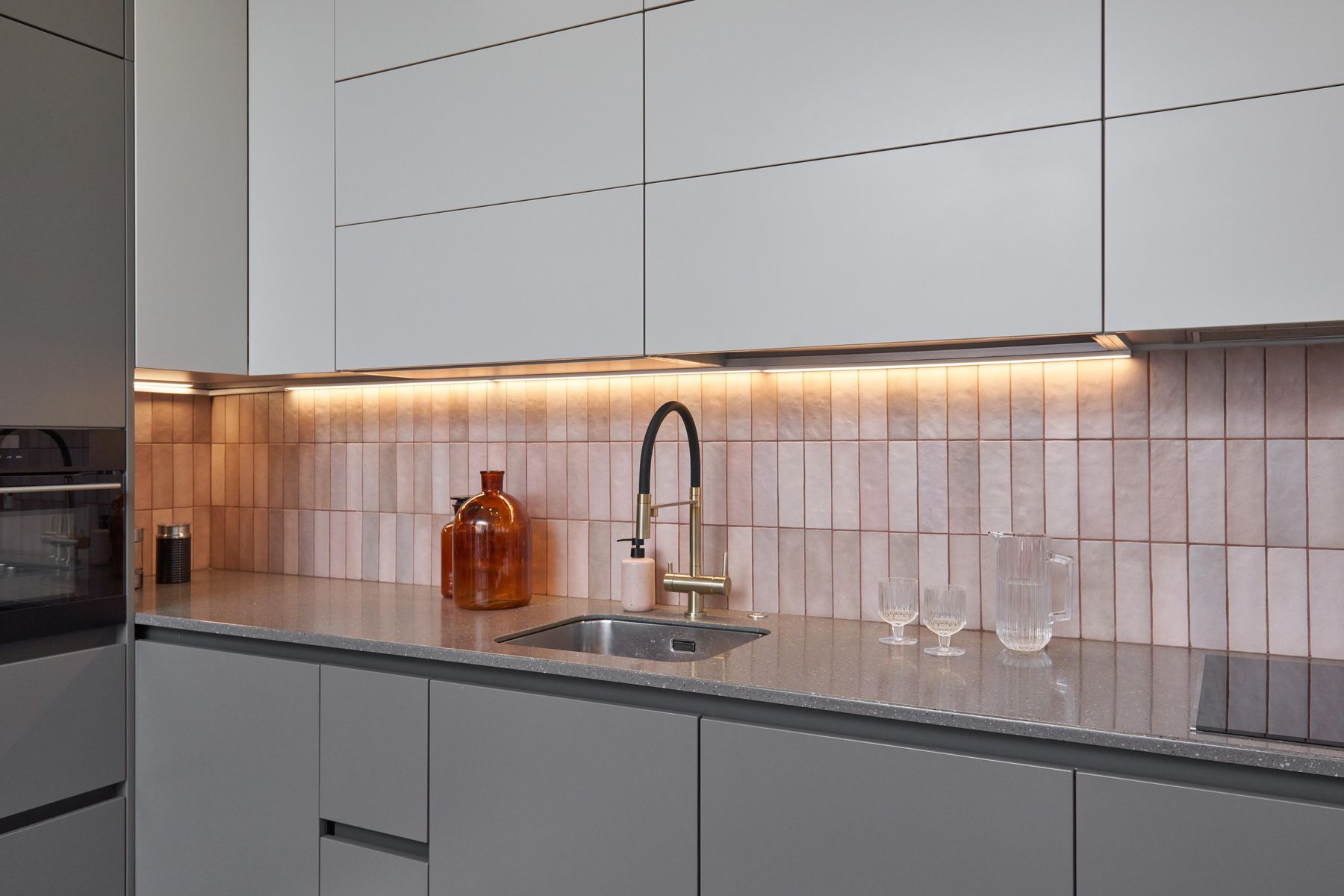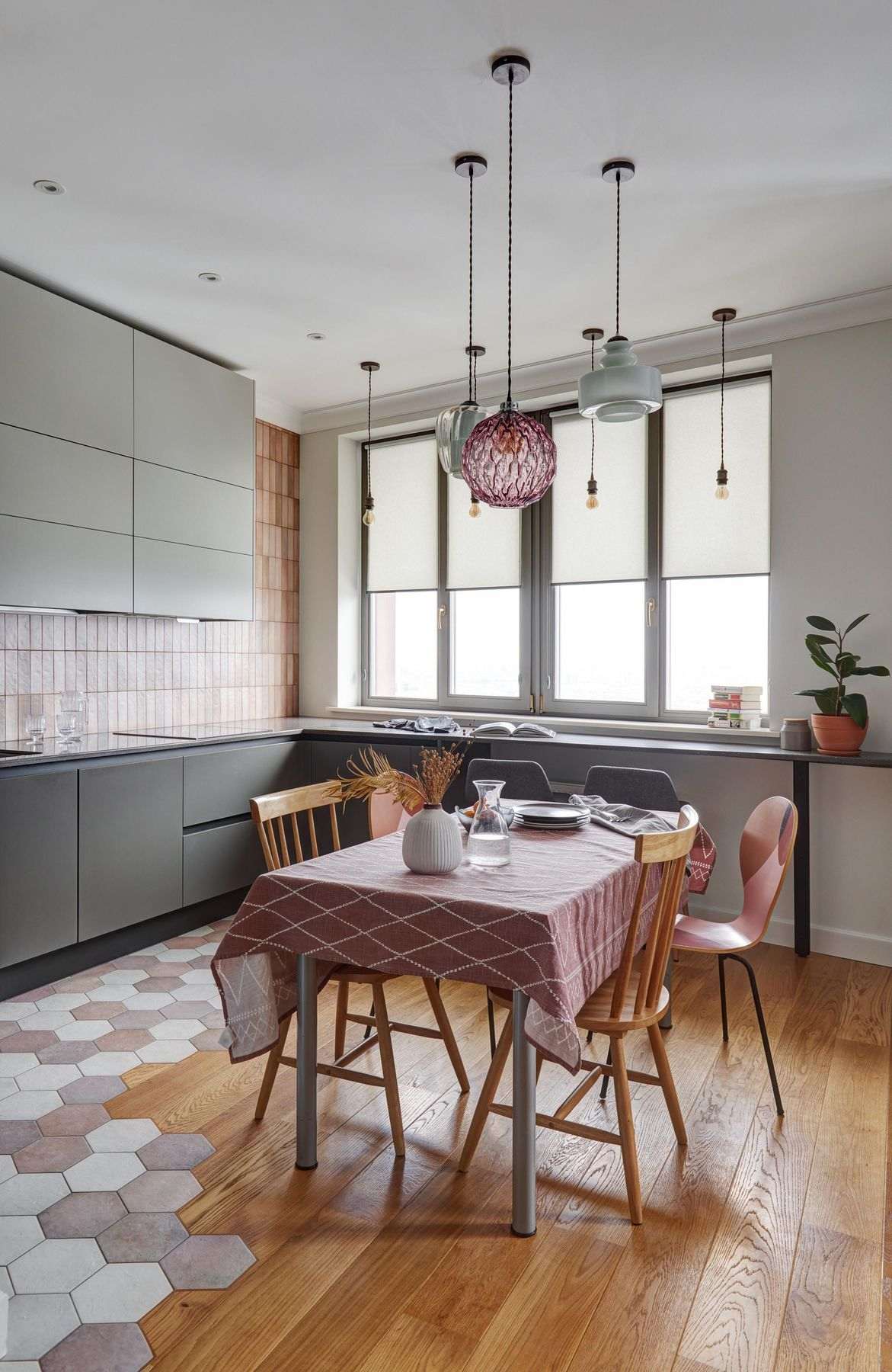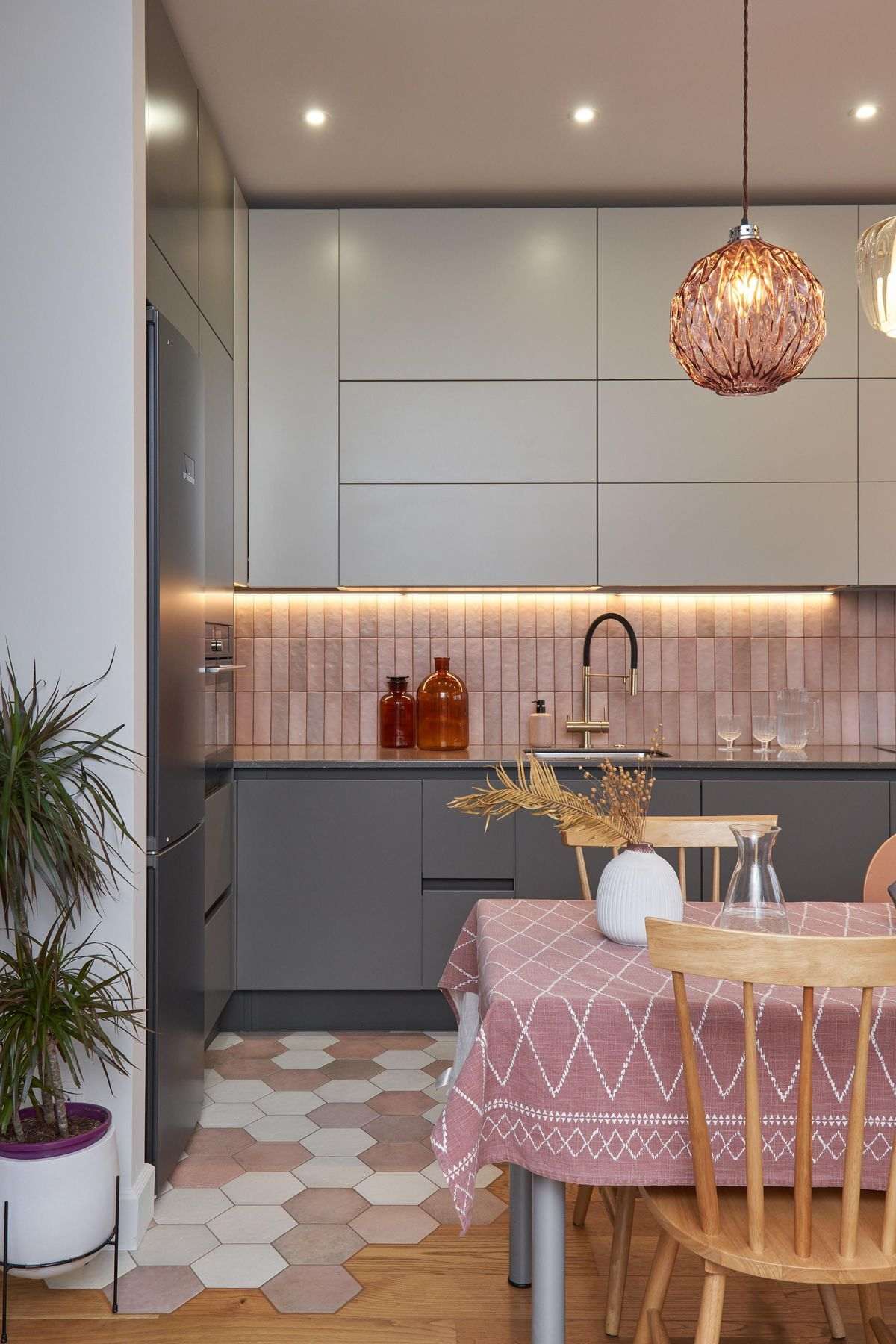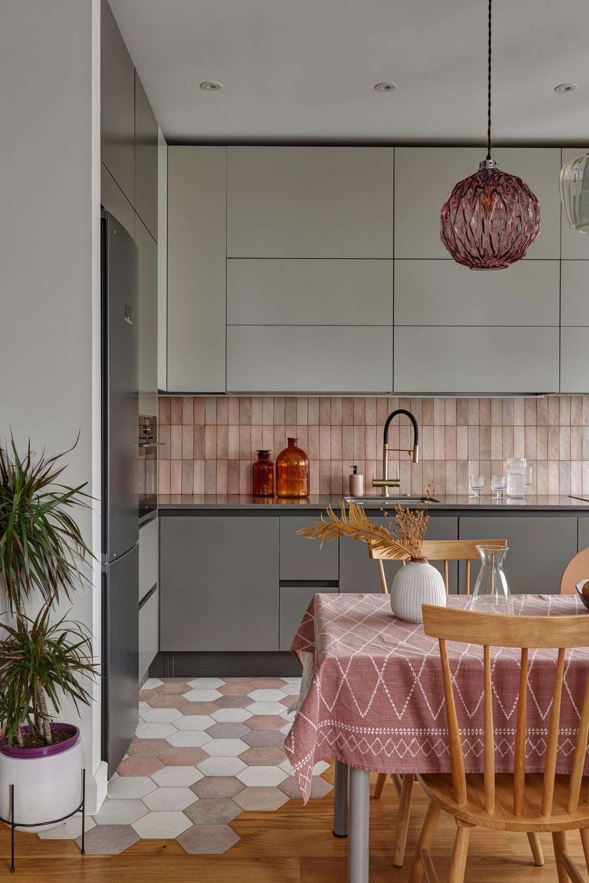 Цветовой акцент: В качестве персонализированной детали мы добавили нежный розовый подтон для верхних шкафов. Это смягчило строгий серый цвет и добавило интерьеру теплоты, которую хотела клиентка.