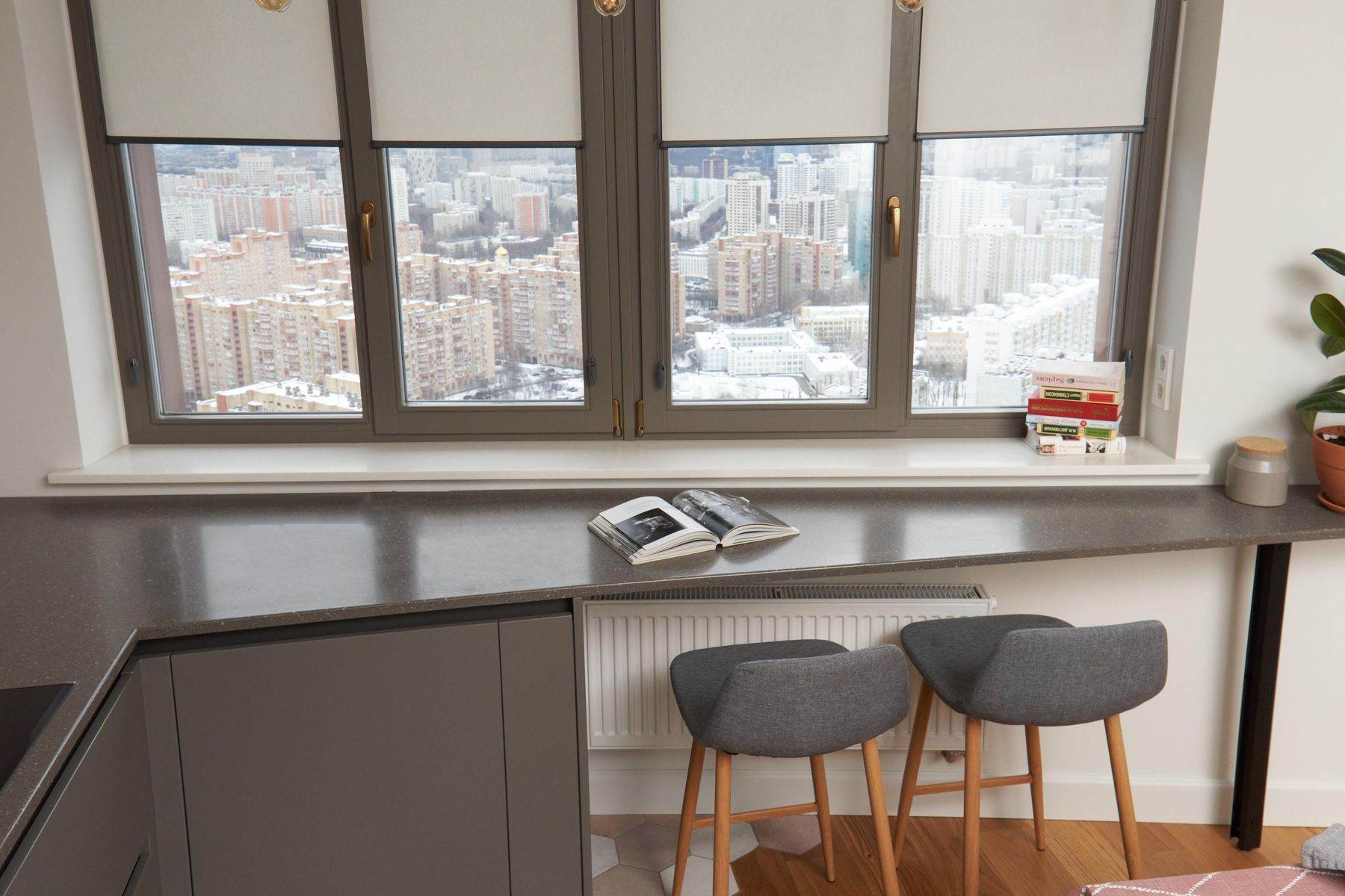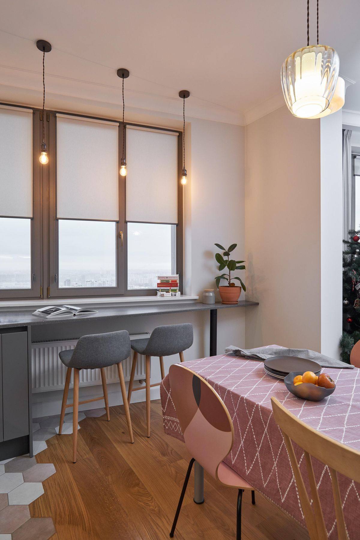 Барная стойка у окна: Мы спроектировали барную стойку, обращенную к окну. Теперь она служит не только местом для завтраков, но и лучшей зоной в доме, чтобы любоваться панорамой города.
