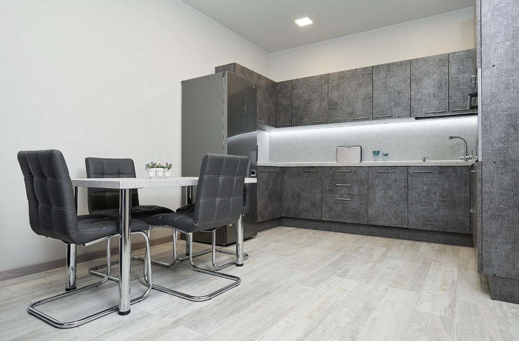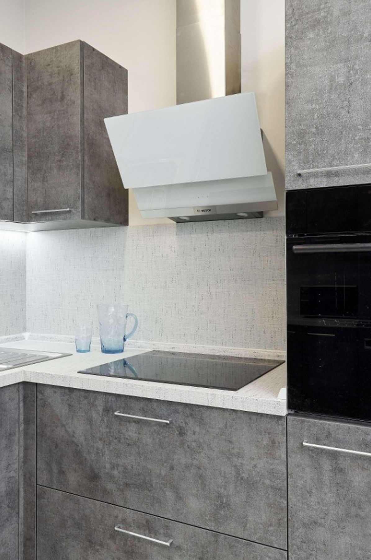 Современный кухонный гарнитур модели Микс 22 привлекает внимание необычным дизайном фасадов. Вместо привычного глянца или древесной текстуры здесь использовано покрытие с эффектом штукатурки – это создает ощущение фактурной стены, придавая интерьеру глубину и индивидуальность. Ключевое преимущество проекта – большая рабочая поверхность, которая объединяет все три стороны гарнитура. На такой столешнице удобно готовить сложные блюда, не беспокоясь о нехватке места.