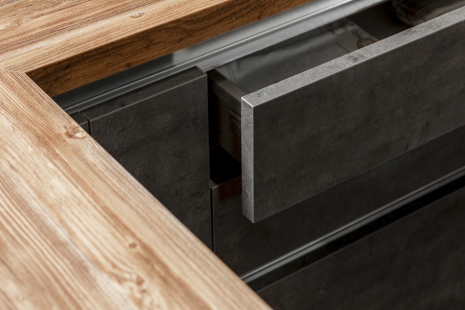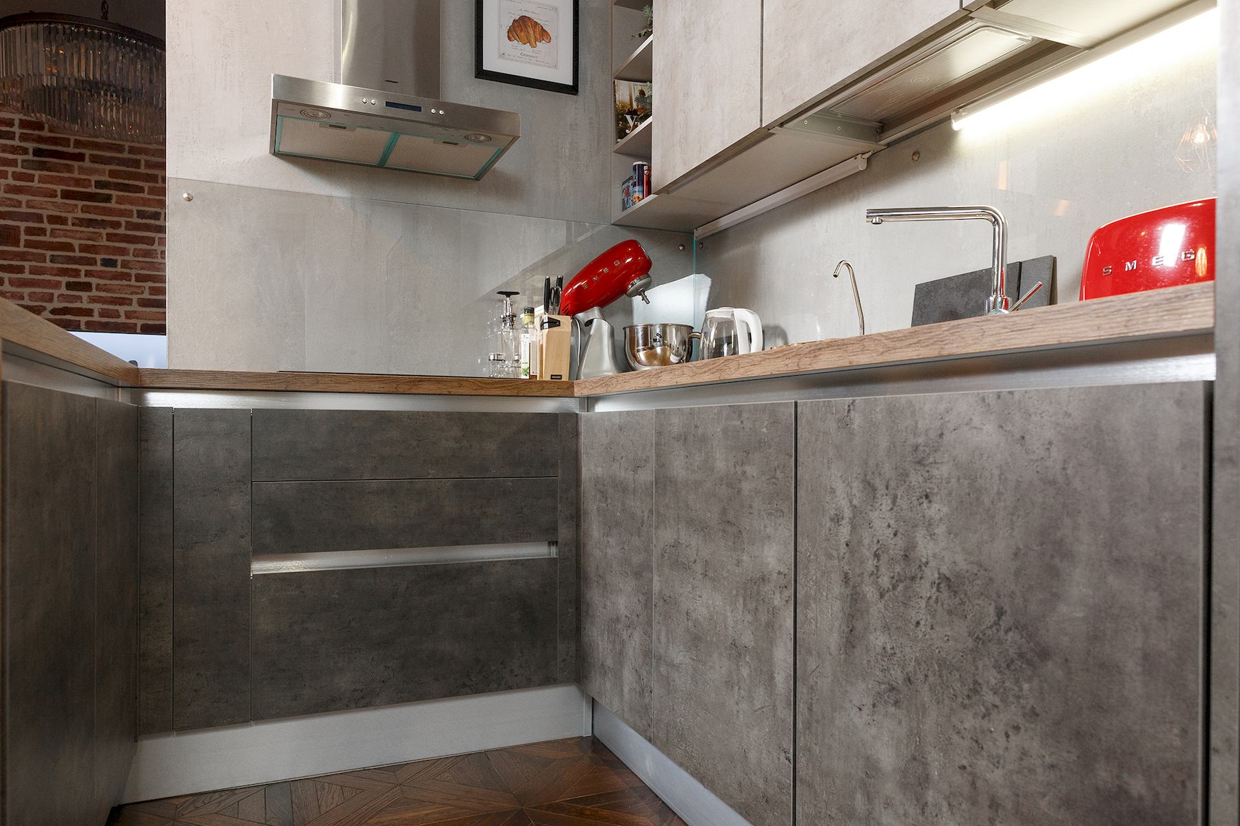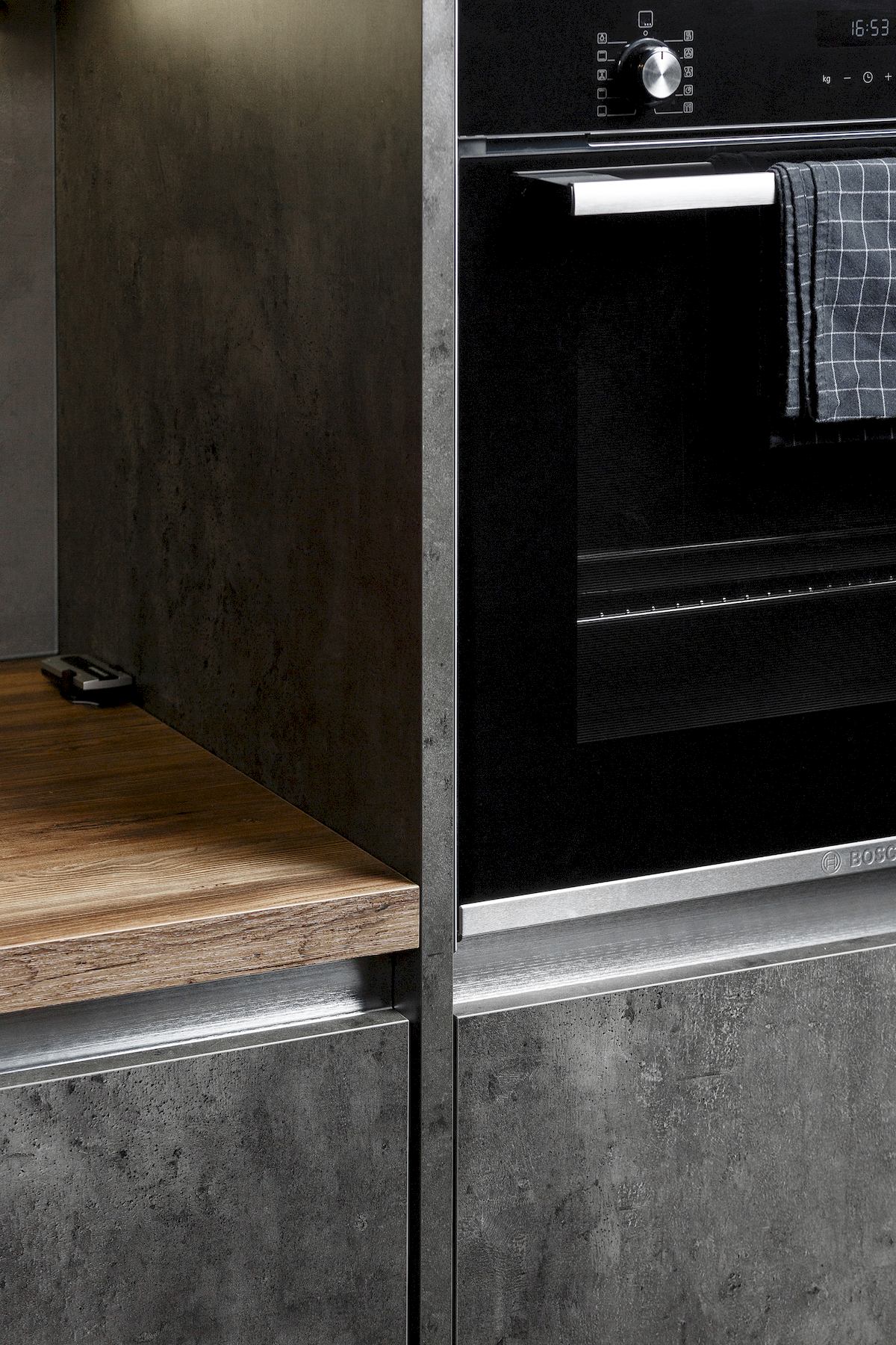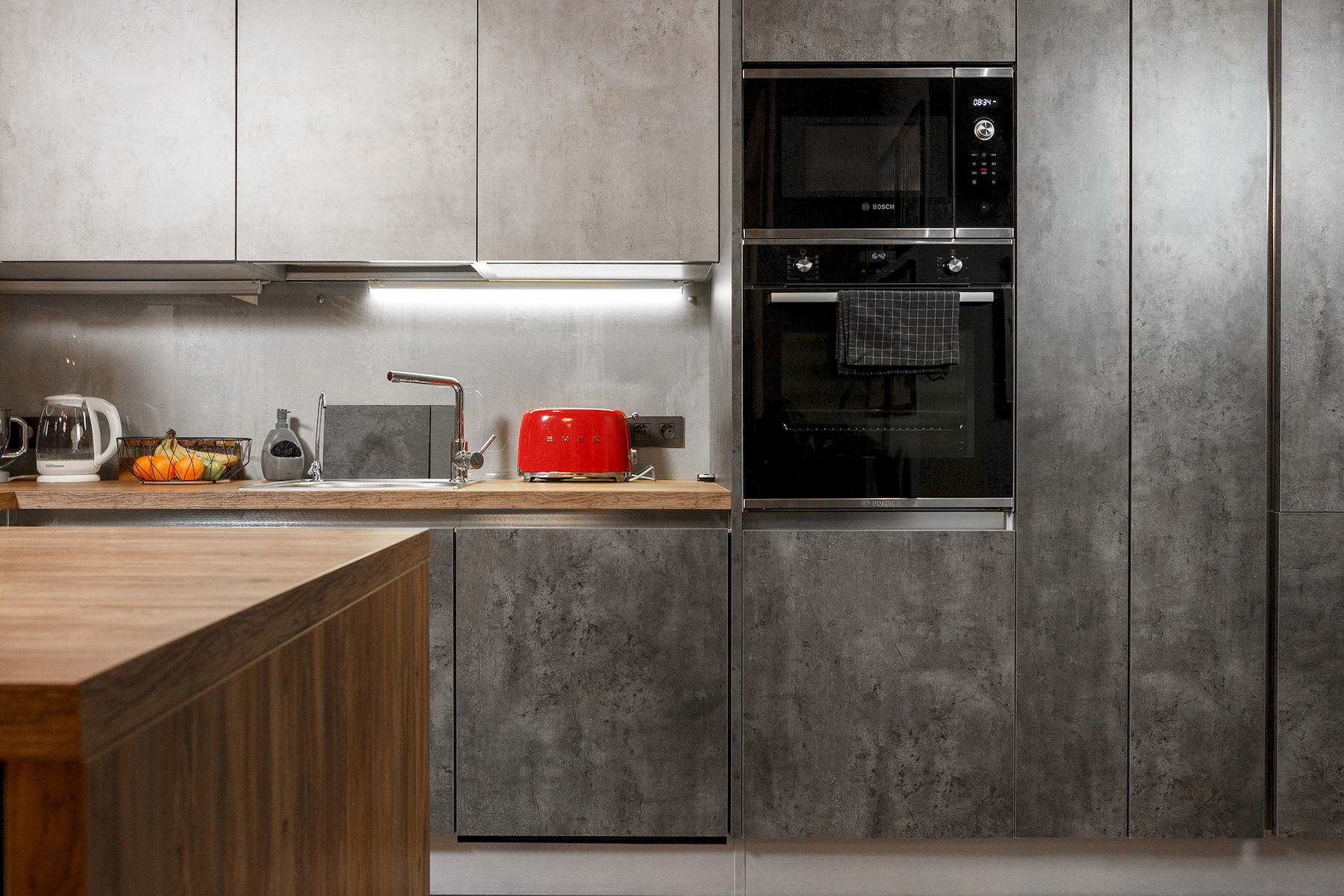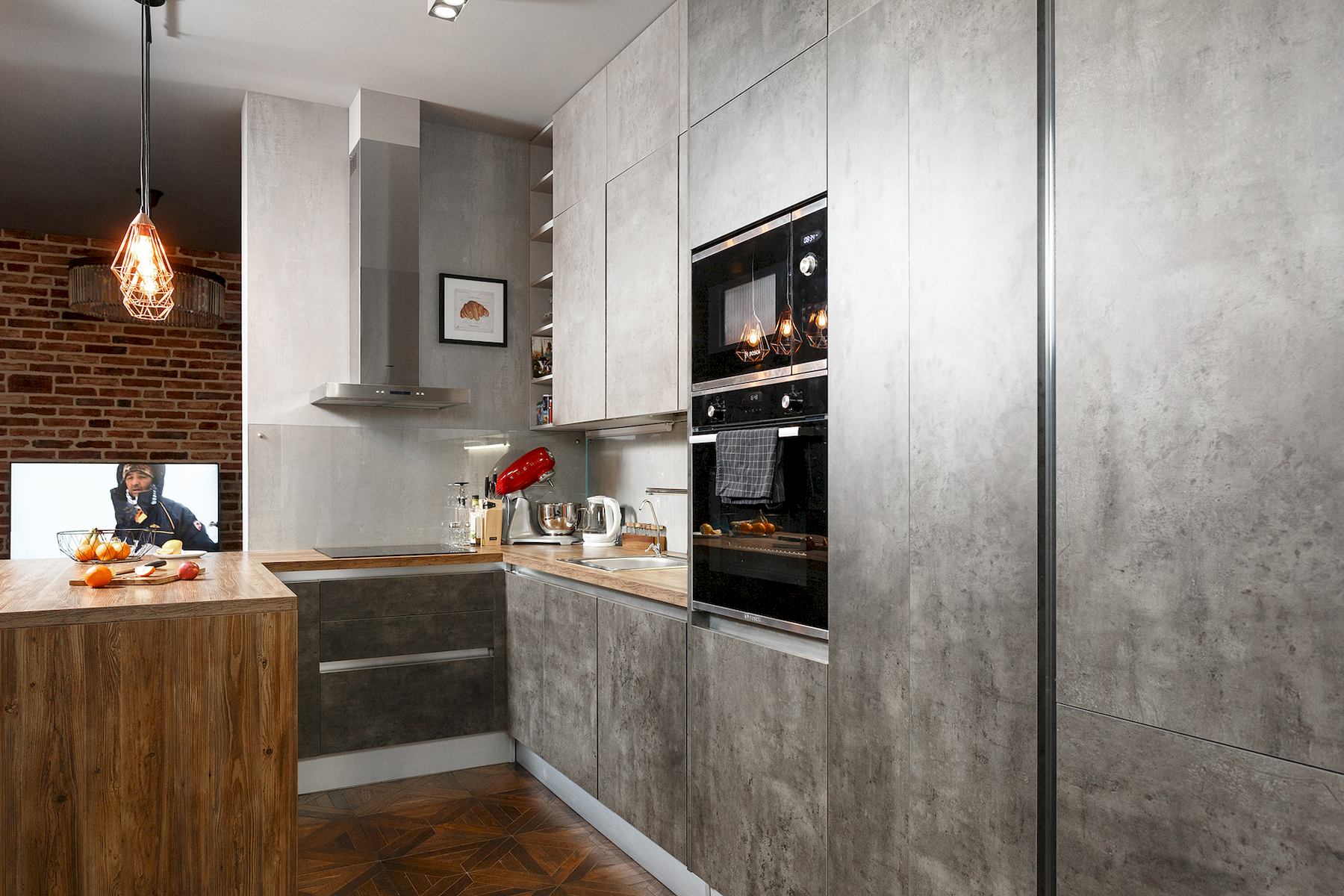 • Брутальный бетон: Высокие шкафы без ручек с покрытием «под бетон» создают ощущение надежности и индустриальной эстетики.