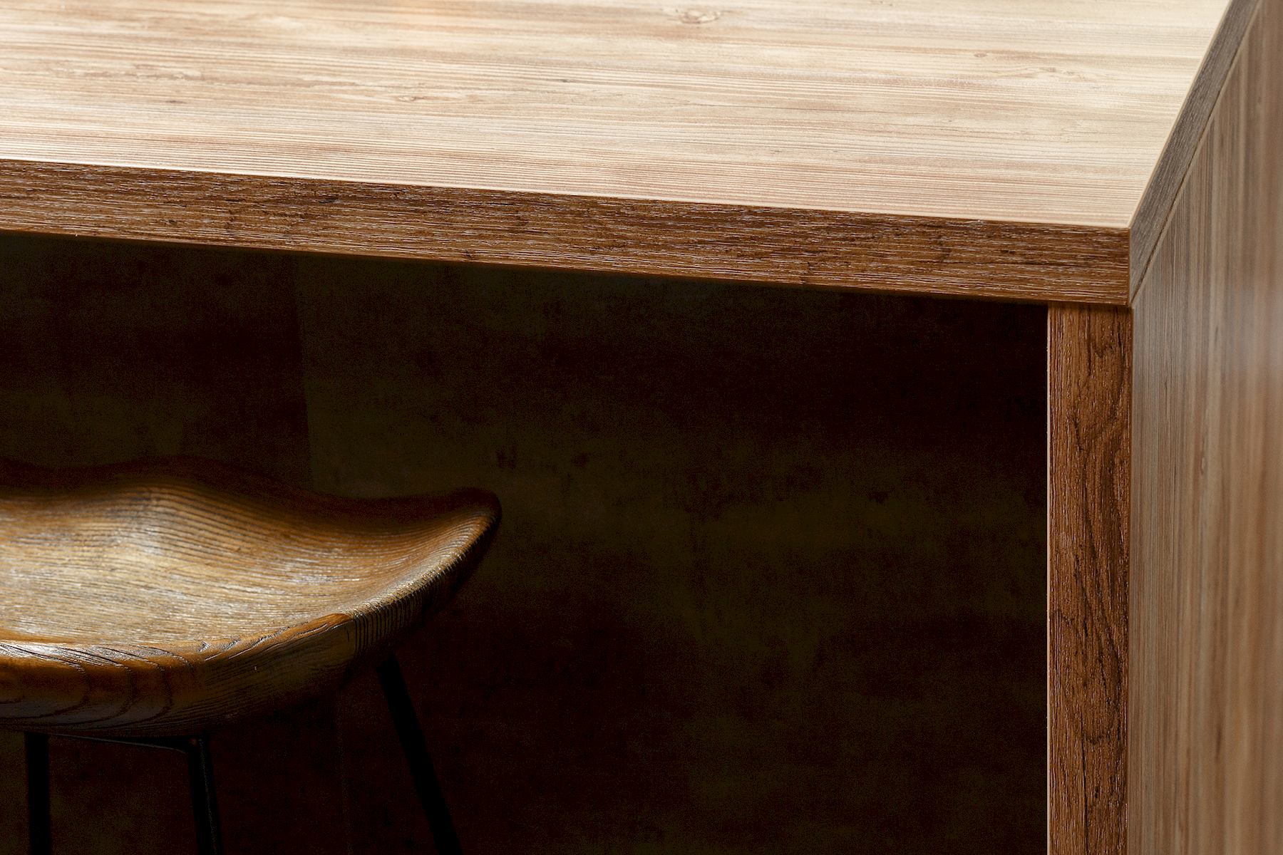 • Теплое дерево: Массивная столешница, будто высеченная из цельного куска дерева, добавляет интерьеру тепла и уюта, смягчая холодность бетона.