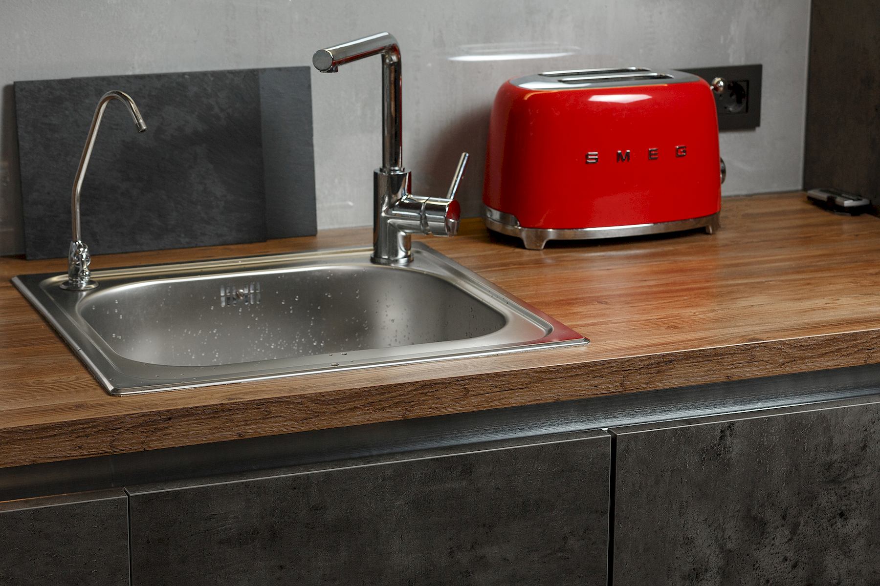 • Простая рабочая зона: Здесь удобно готовить благодаря интегрированной варочной панели и квадратной мойке.