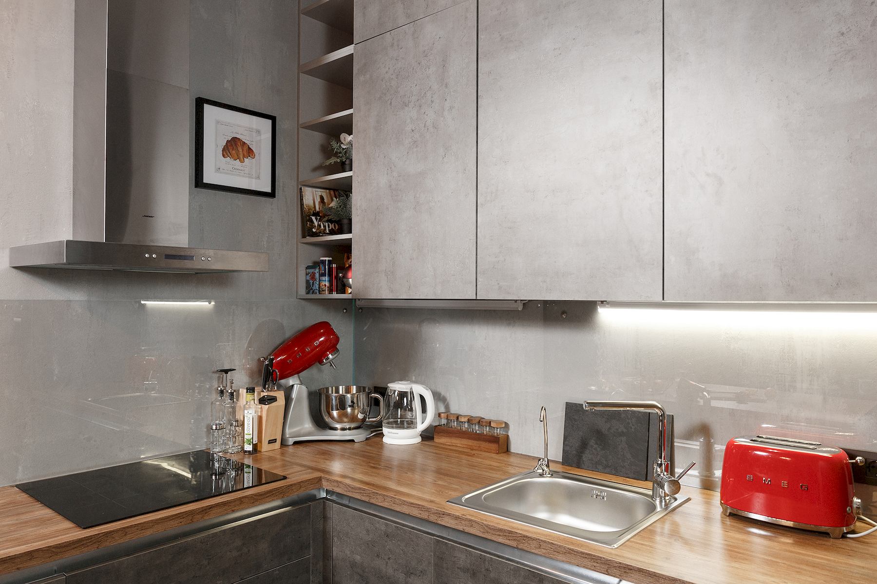 • Яркие акценты: Сочетание нейтральной палитры с ярко-красной бытовой техникой (миксер, тостер) добавляет помещению динамики и индивидуальности, отражая характер владельцев.
