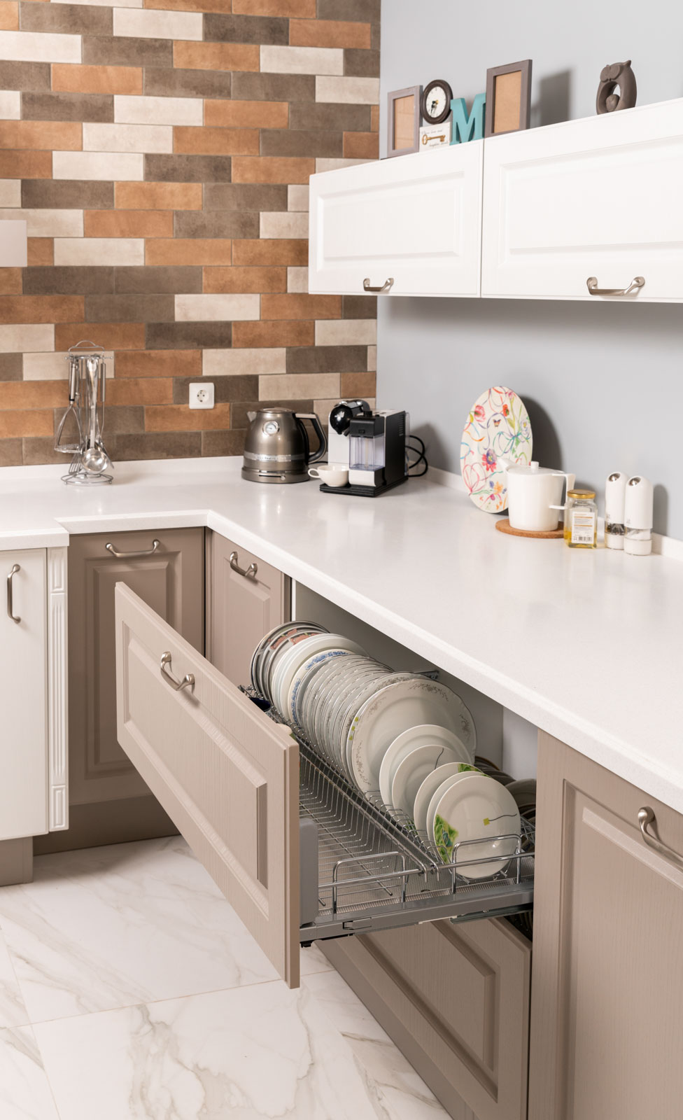 Мойка с видом на сад: Реализация желания клиента иметь мойку у окна потребовала инженерной точности. Мы не только аккуратно спрятали все трубы, но и обеспечили правильную вентиляцию, предусмотрев решетки в цоколе.