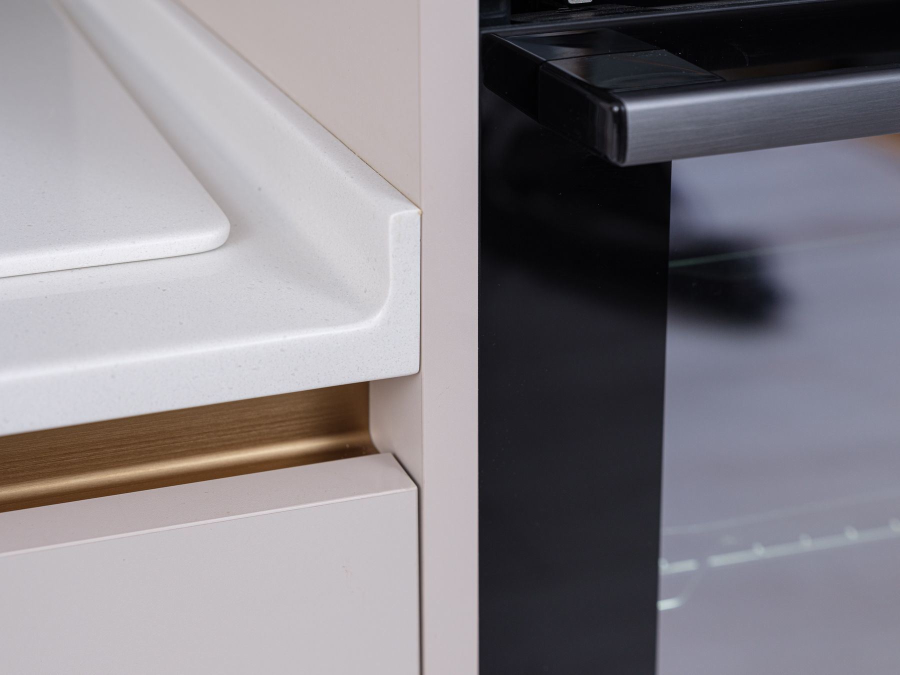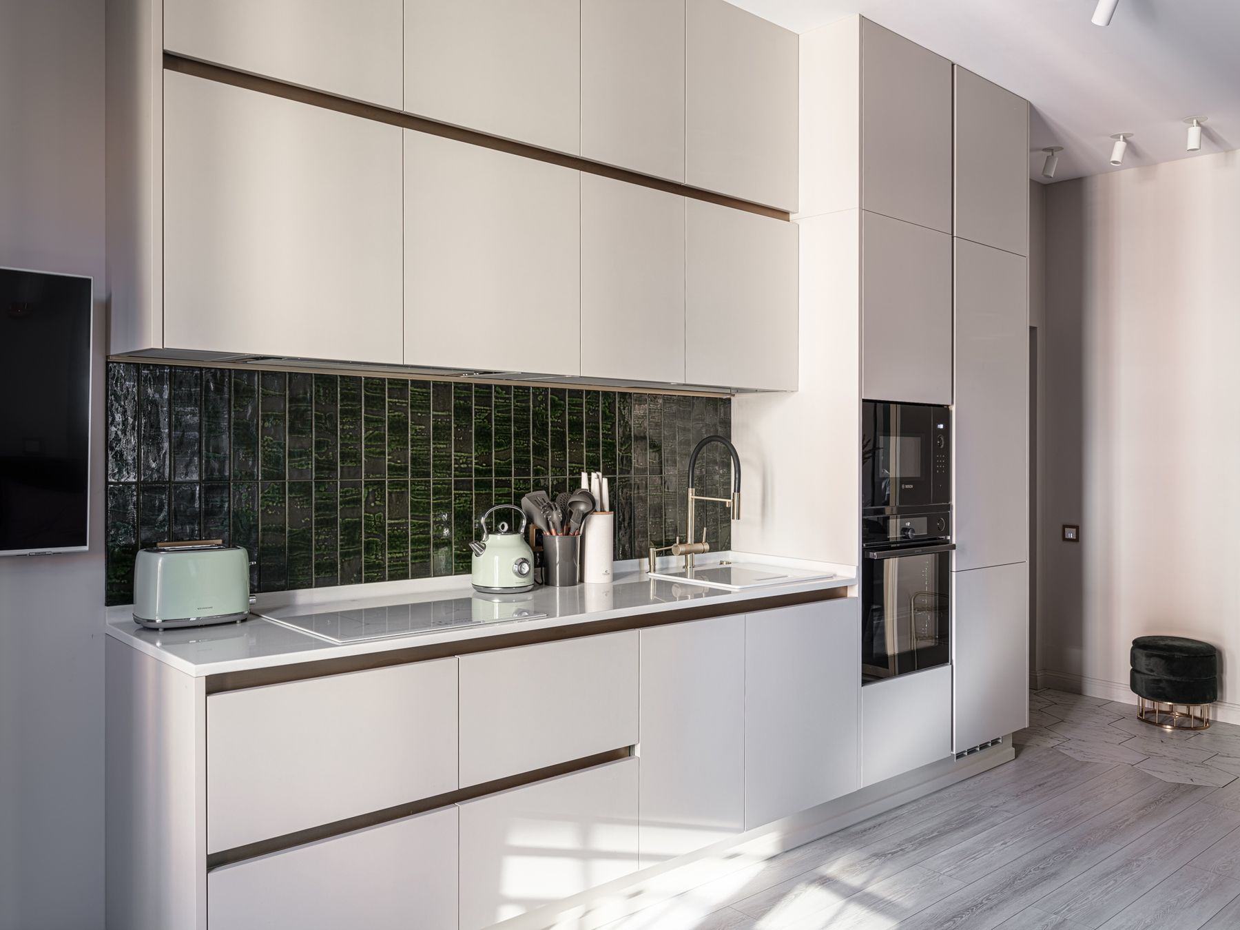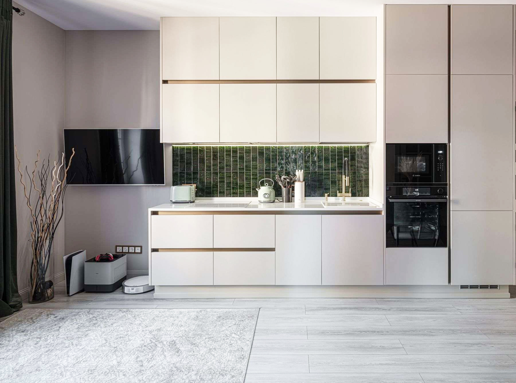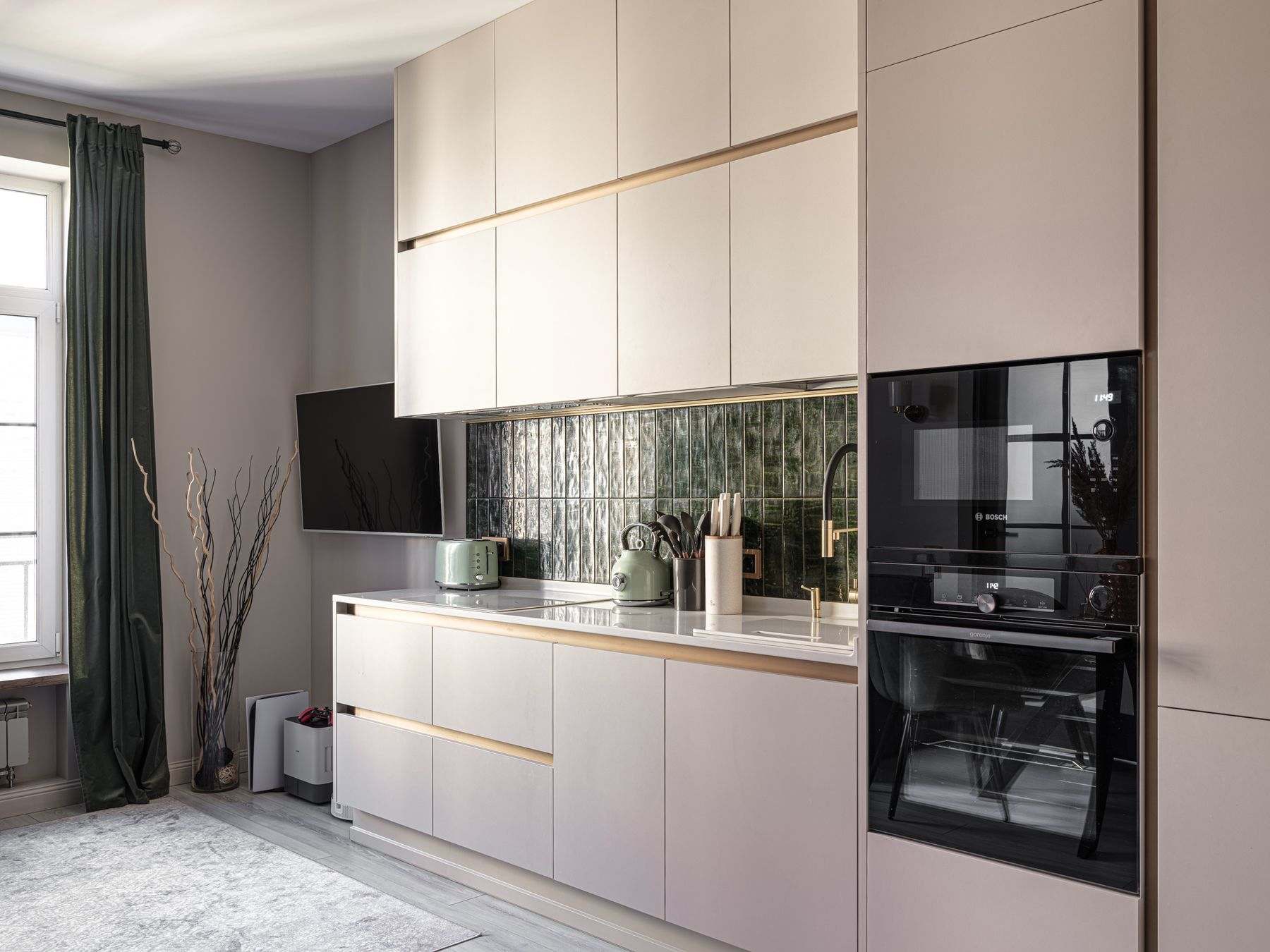 А изюминка — нестандартные решения: профиль Gola на верхних секциях и классический цоколь, которые придают современной кухне индивидуальность.