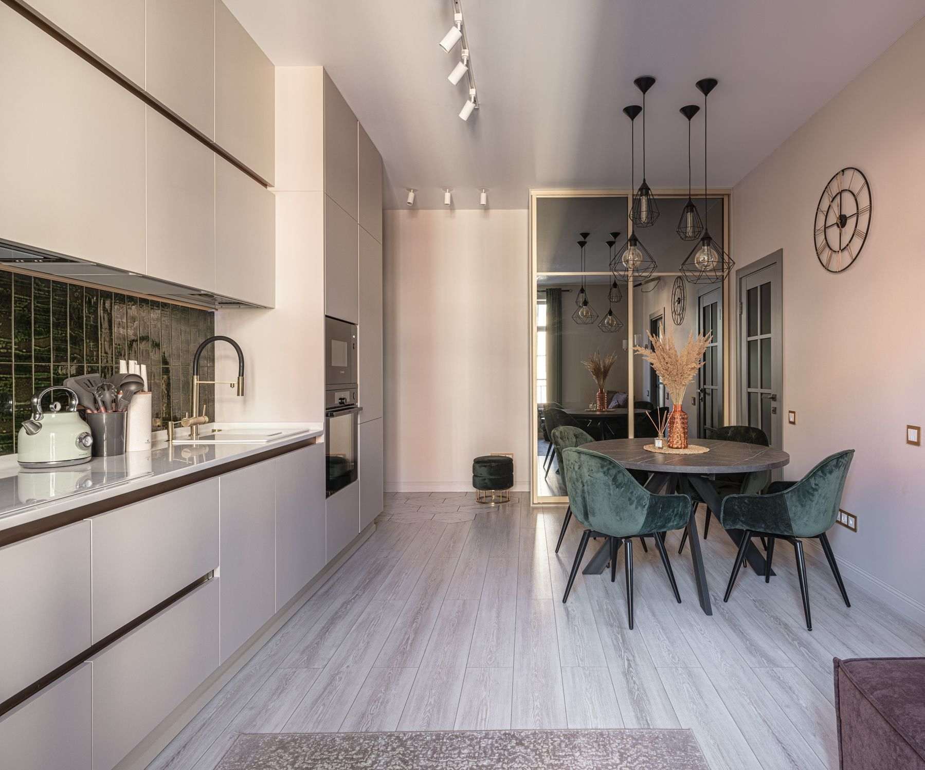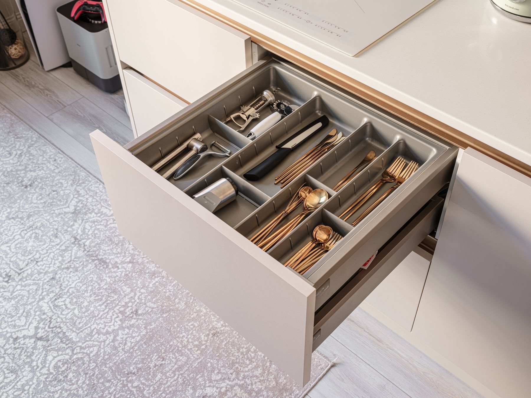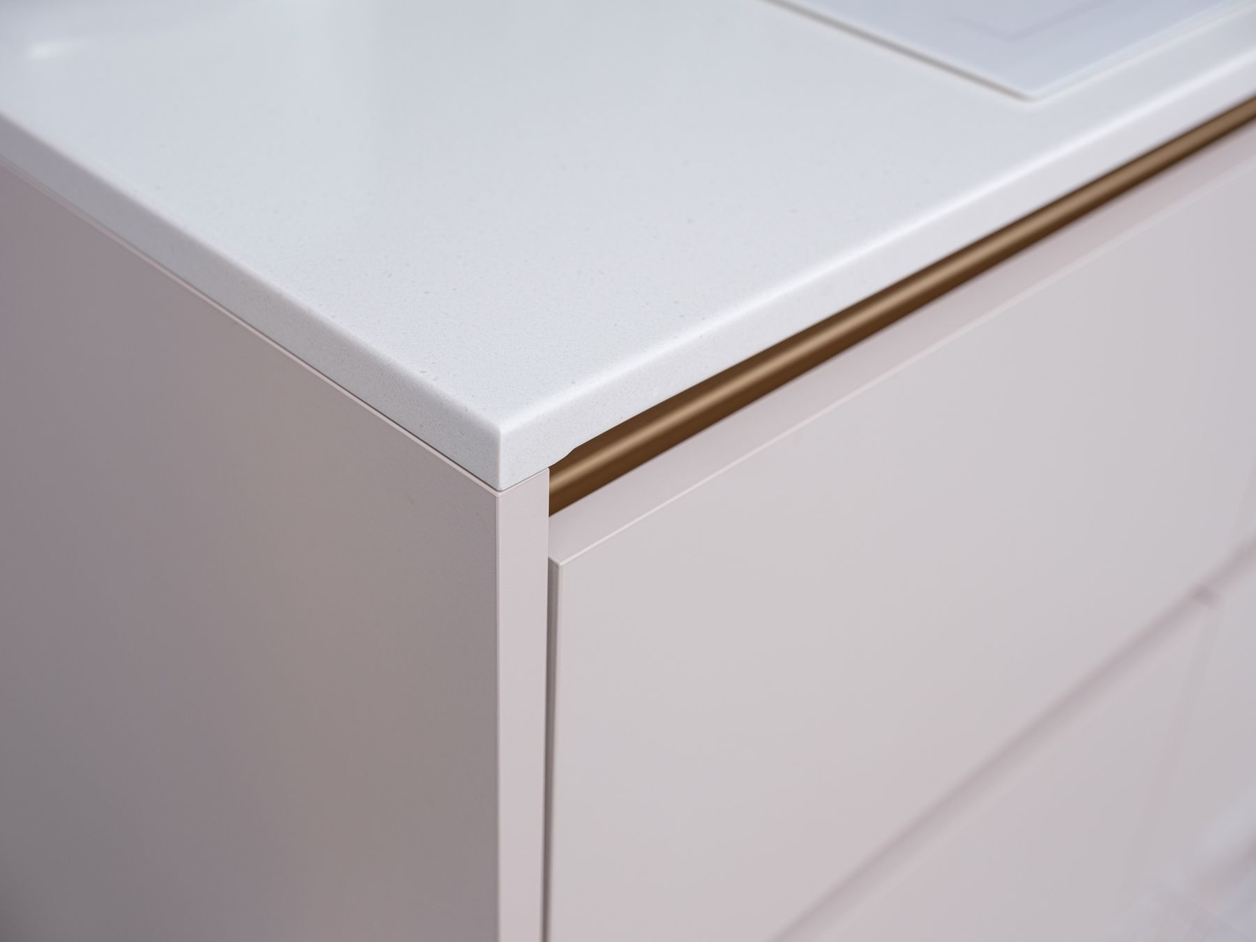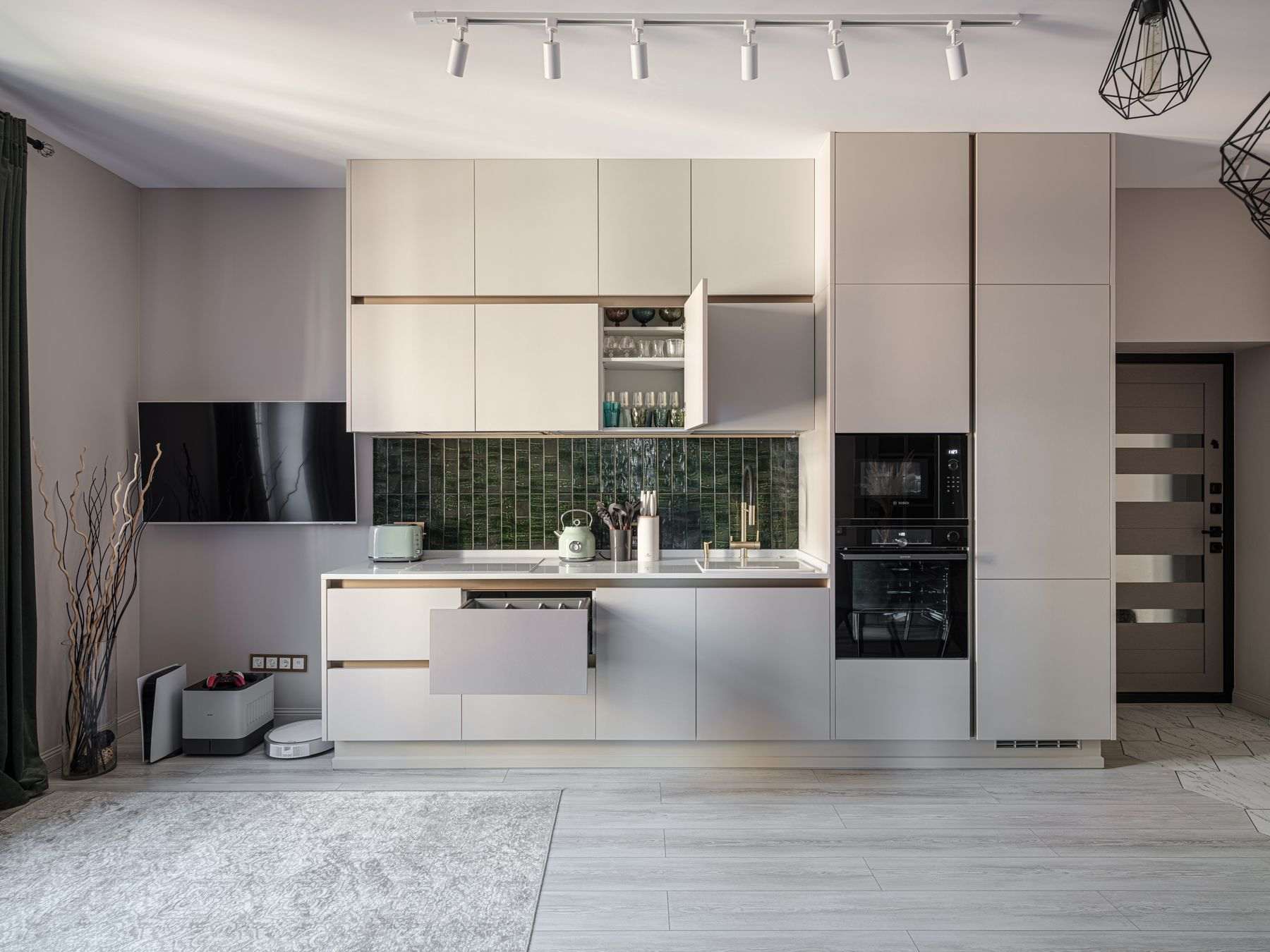 А изюминка — нестандартные решения: профиль Gola на верхних секциях и классический цоколь, которые придают современной кухне индивидуальность.