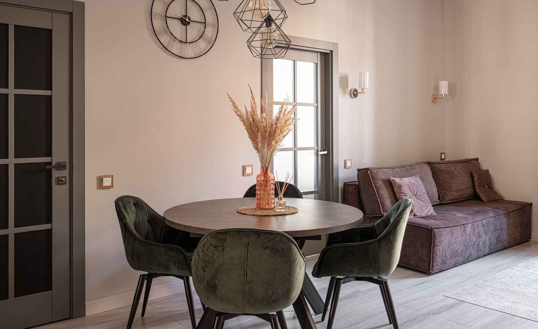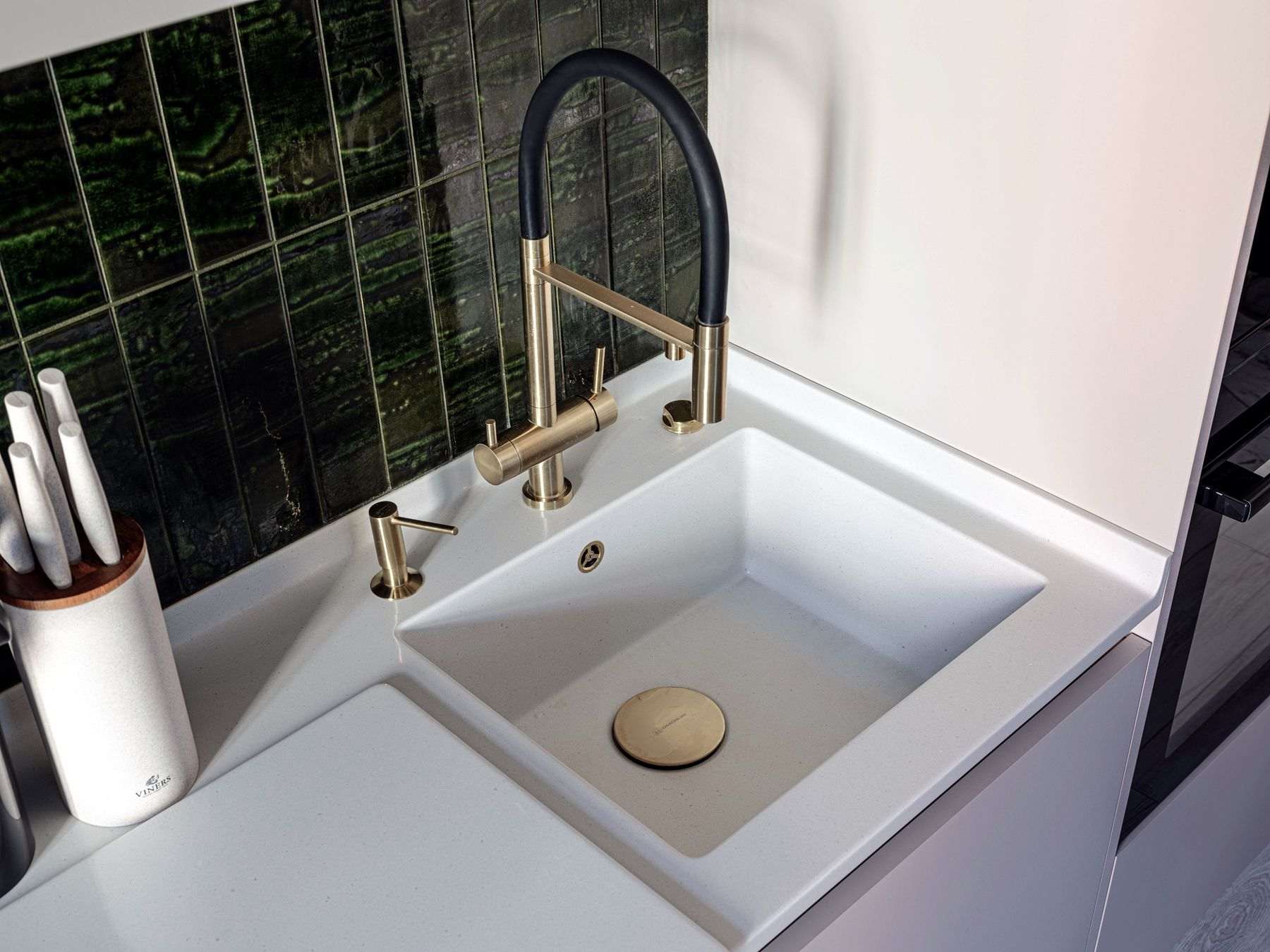 Главный акцент — смелое сочетание темного фартука с зеленоватым оттенком и роскошных золотых деталей.