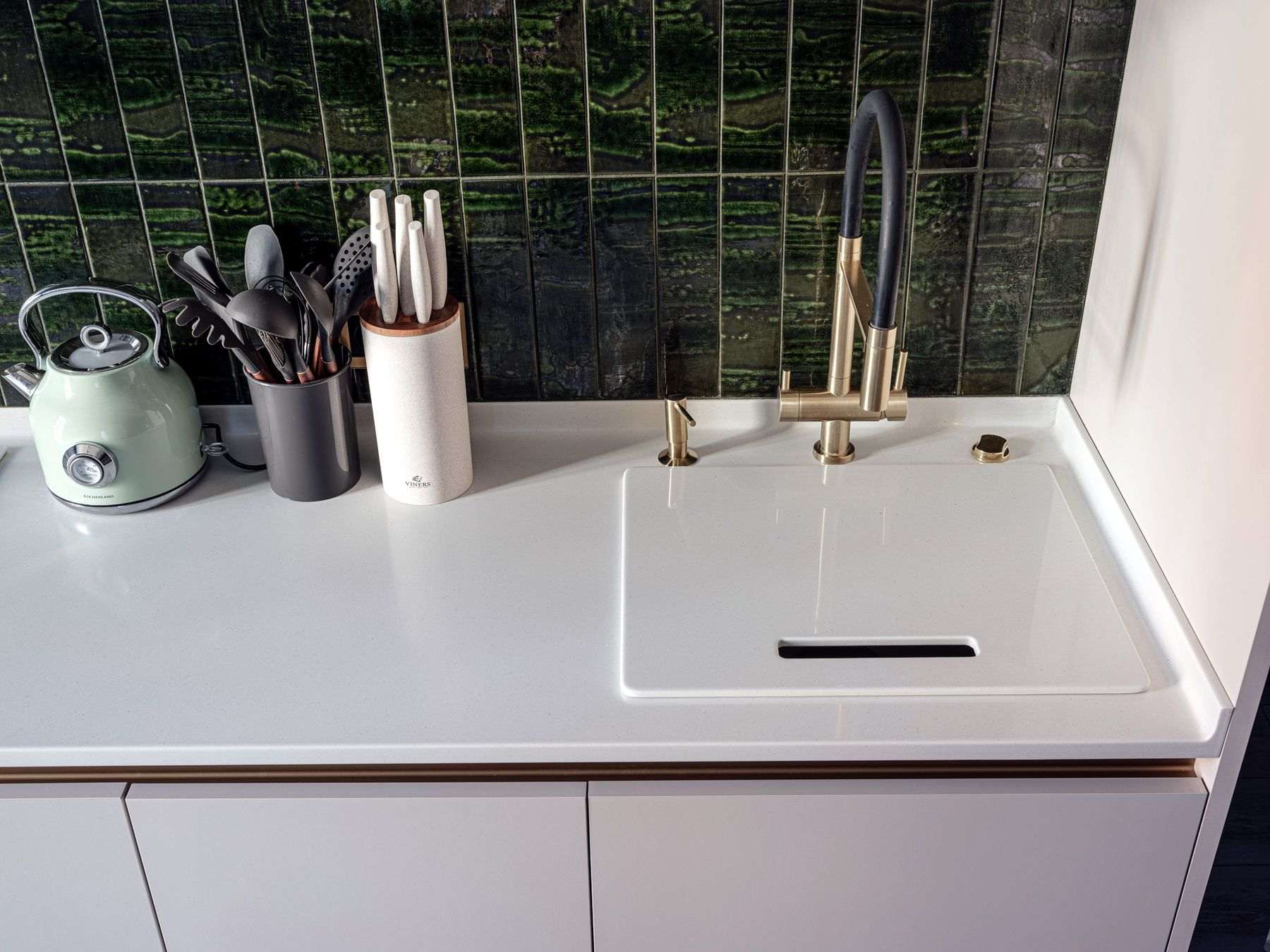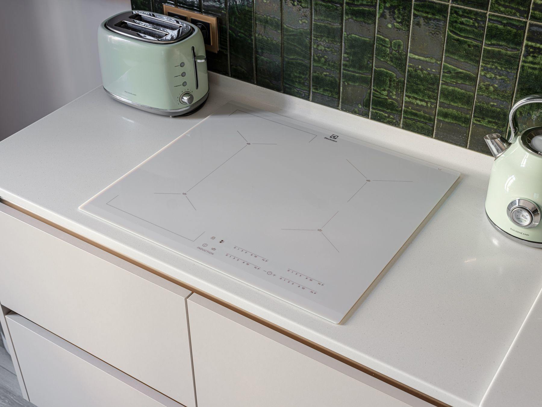 Стены идеально подобраны в цвет белых фасадов, что зрительно увеличивает пространство.