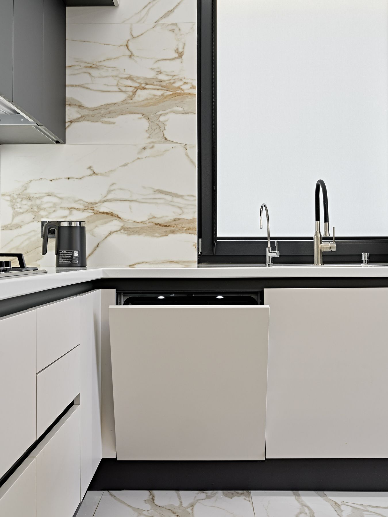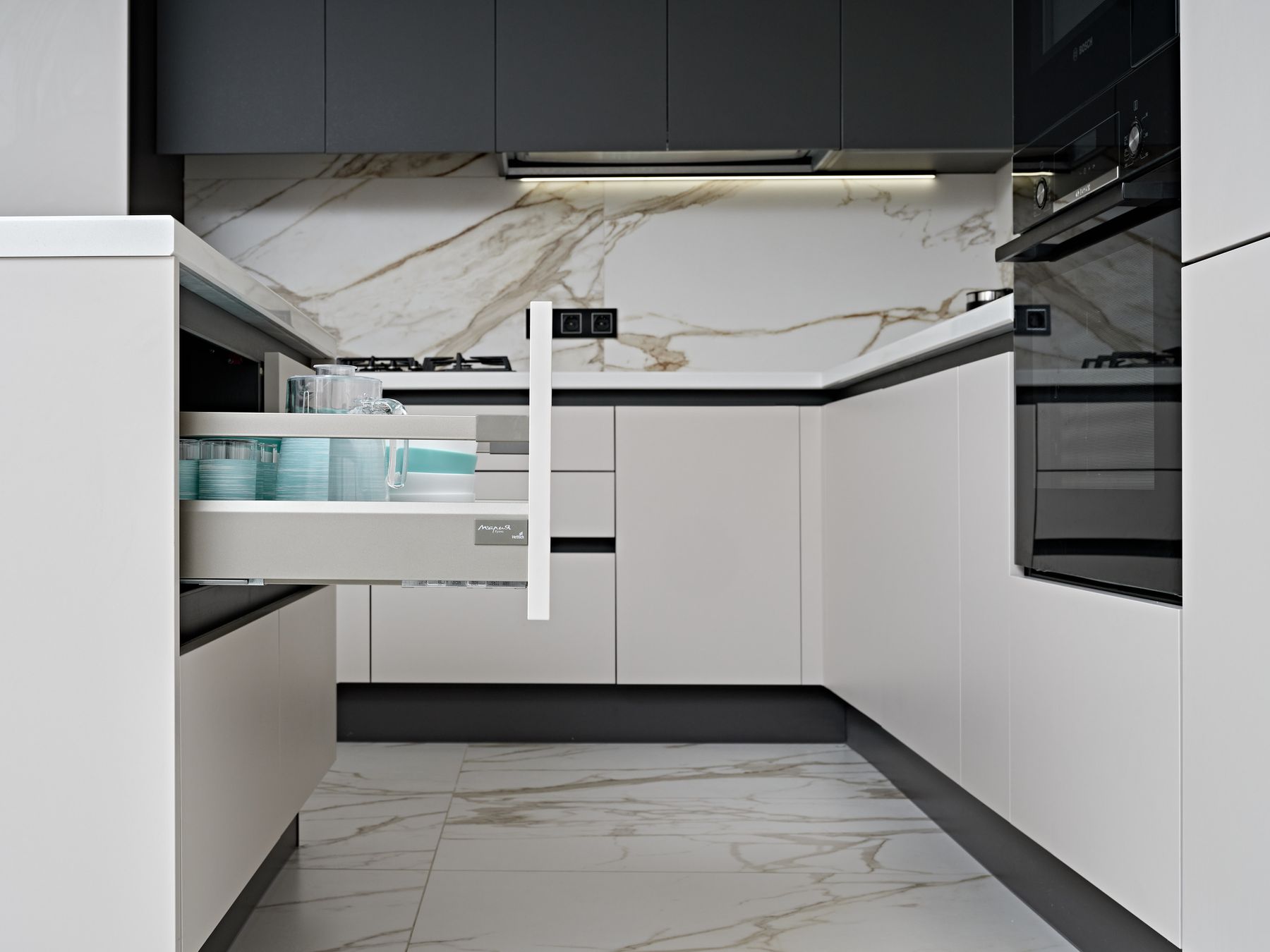 За лаконичность формы отвечает и цветовое решение. Основной цвет фасадов — «Кашемир» — создает светлую и умиротворяющую атмосферу. Акценты цвета «Антрацит» добавляют интерьеру глубины и графичности, делая его завершенным.