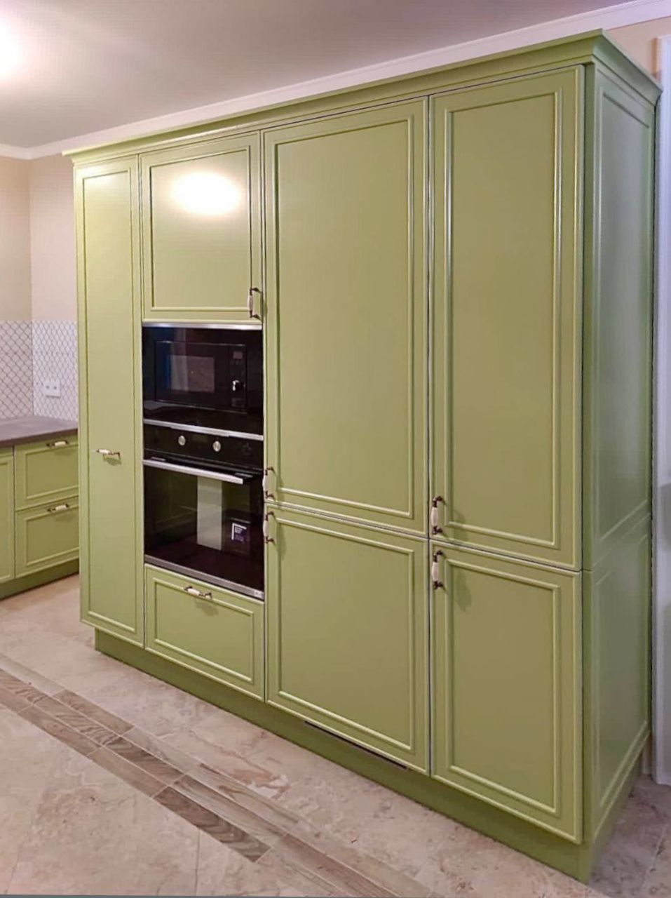 О проектеОписаниеЗдесь представлена неоклассическая кухня в трендовом оливковом цвете. Гарнитур выполнен в угловом варианте, колонны со встраиваемой техникой установлены на отдельной стене. Фасады оснащены доводчиками бренда Hettich.