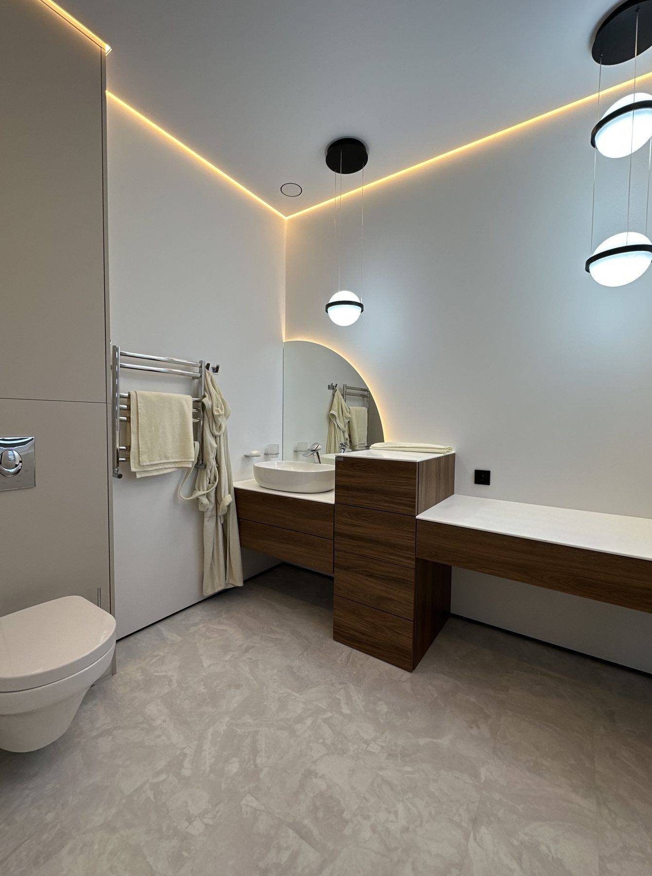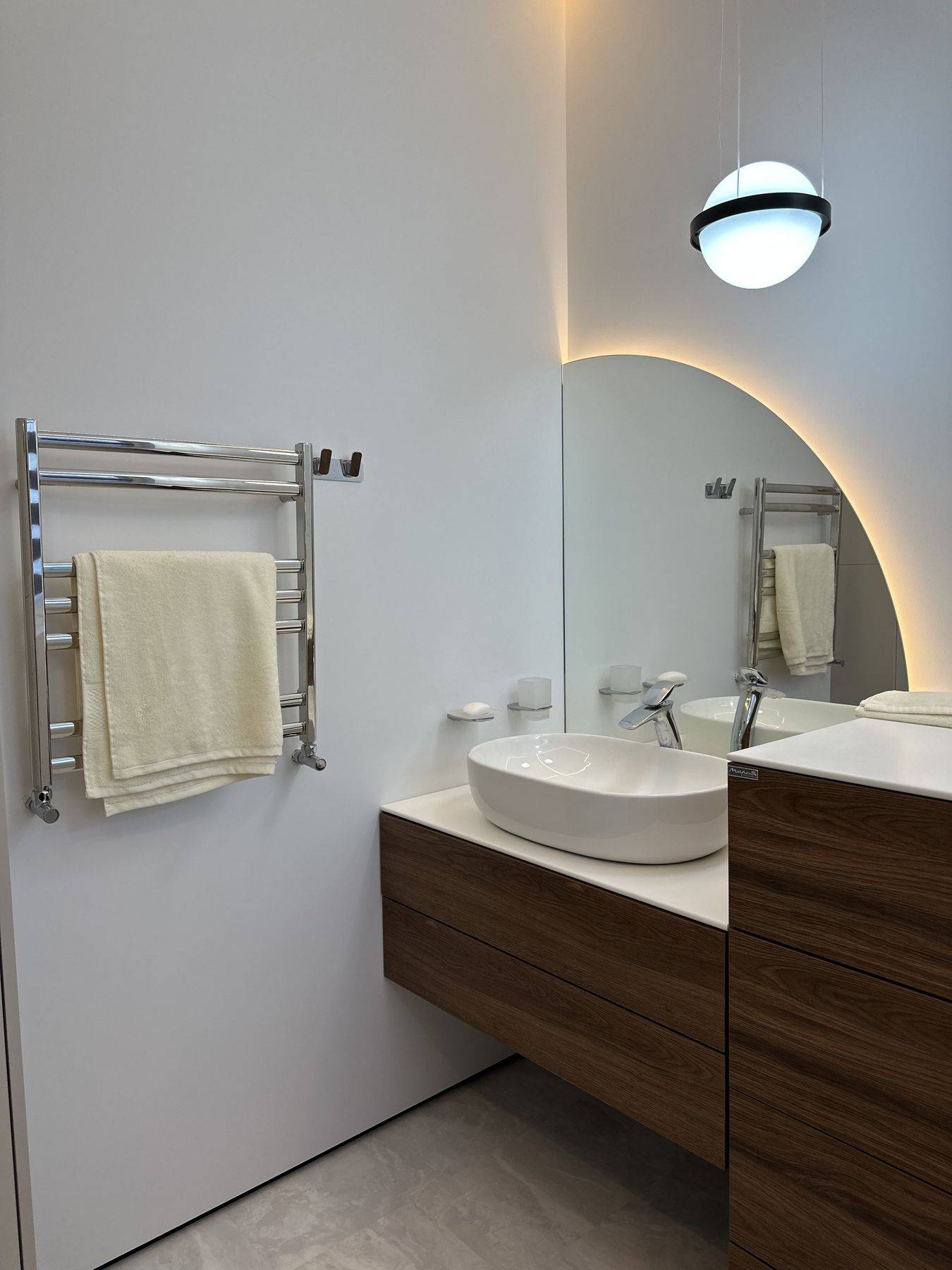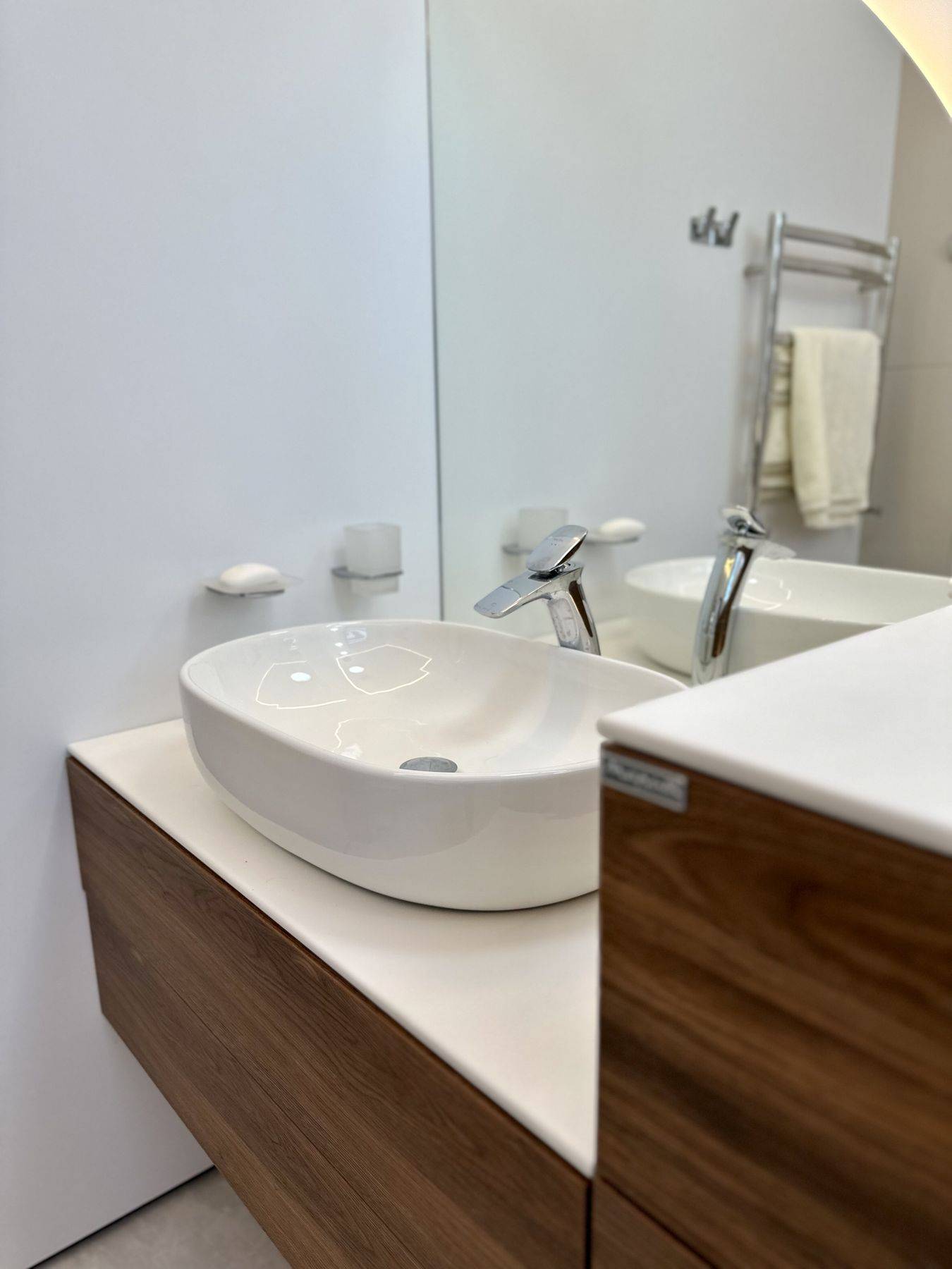 Во всех влажных зонах — в кухонном гарнитуре и в ванной комнате — мы установили столешницы из искусственного камня толщиной 12 мм. Белый цвет и тонкий профиль визуально облегчили массивные конструкции, подчеркнули современный стиль и поддержали светлую тональность всего интерьера, добавив в него ощущение простора и чистоты.