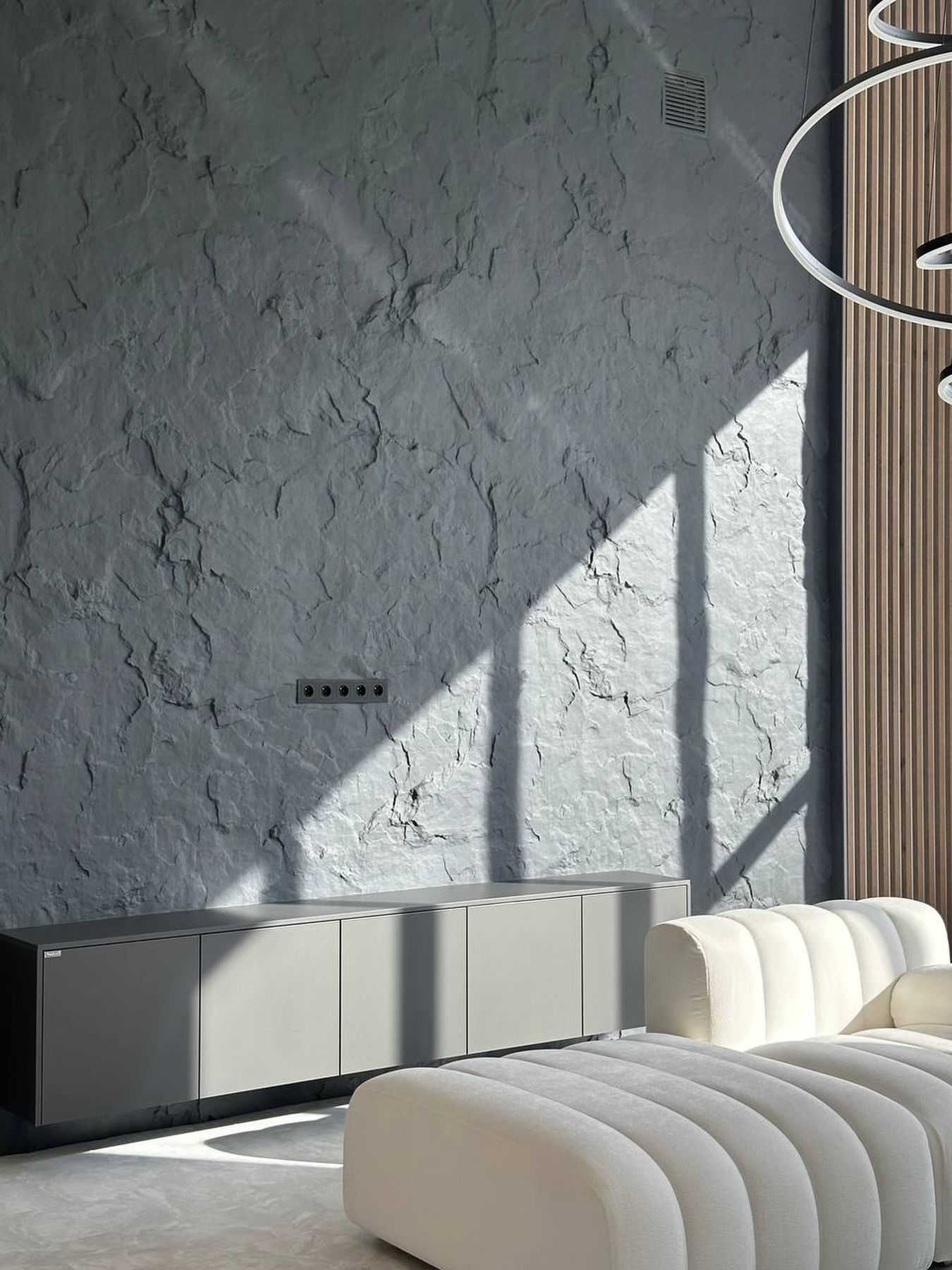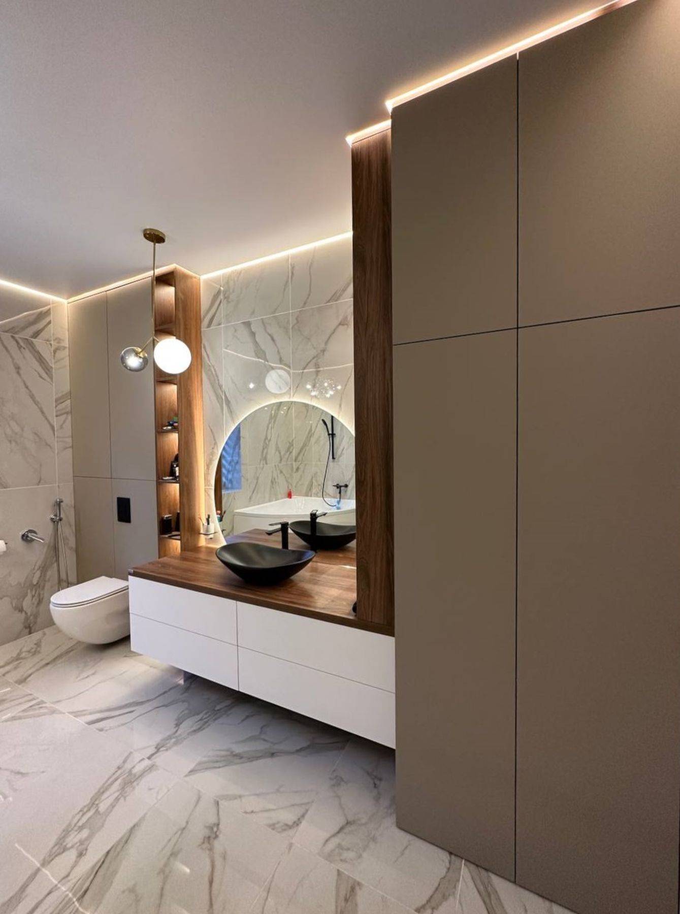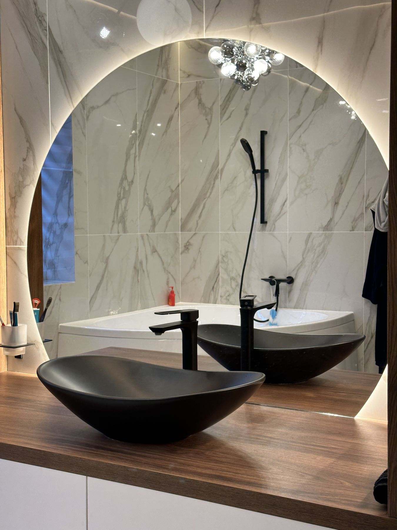 Во всех влажных зонах — в кухонном гарнитуре и в ванной комнате — мы установили столешницы из искусственного камня толщиной 12 мм. Белый цвет и тонкий профиль визуально облегчили массивные конструкции, подчеркнули современный стиль и поддержали светлую тональность всего интерьера, добавив в него ощущение простора и чистоты.