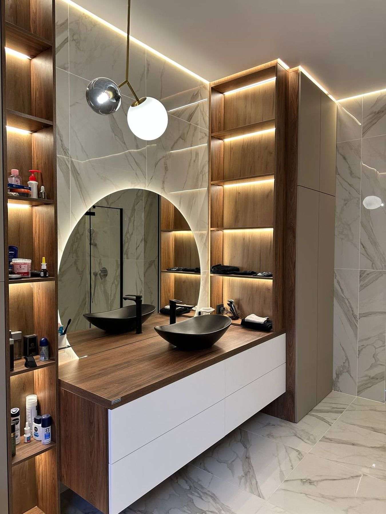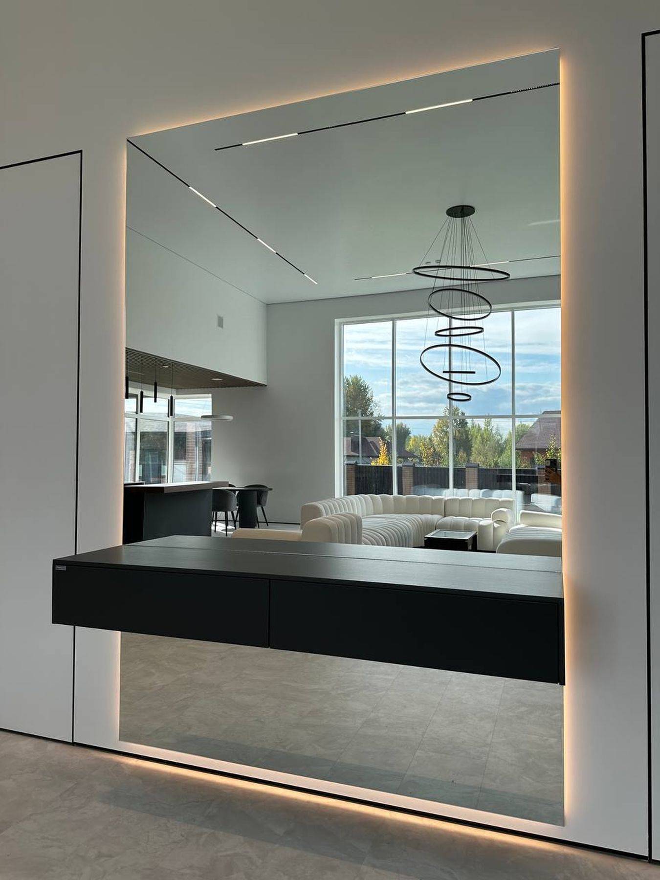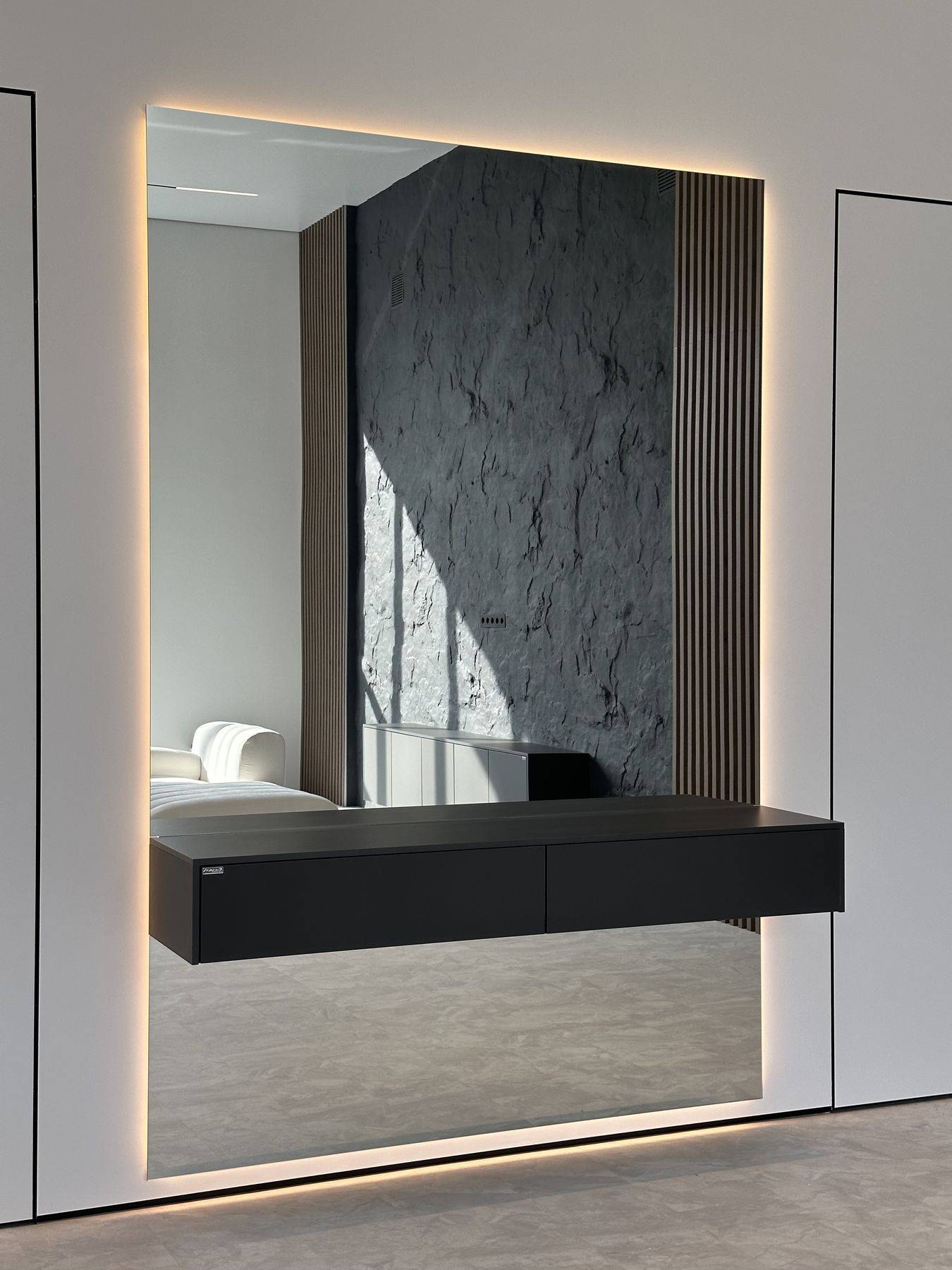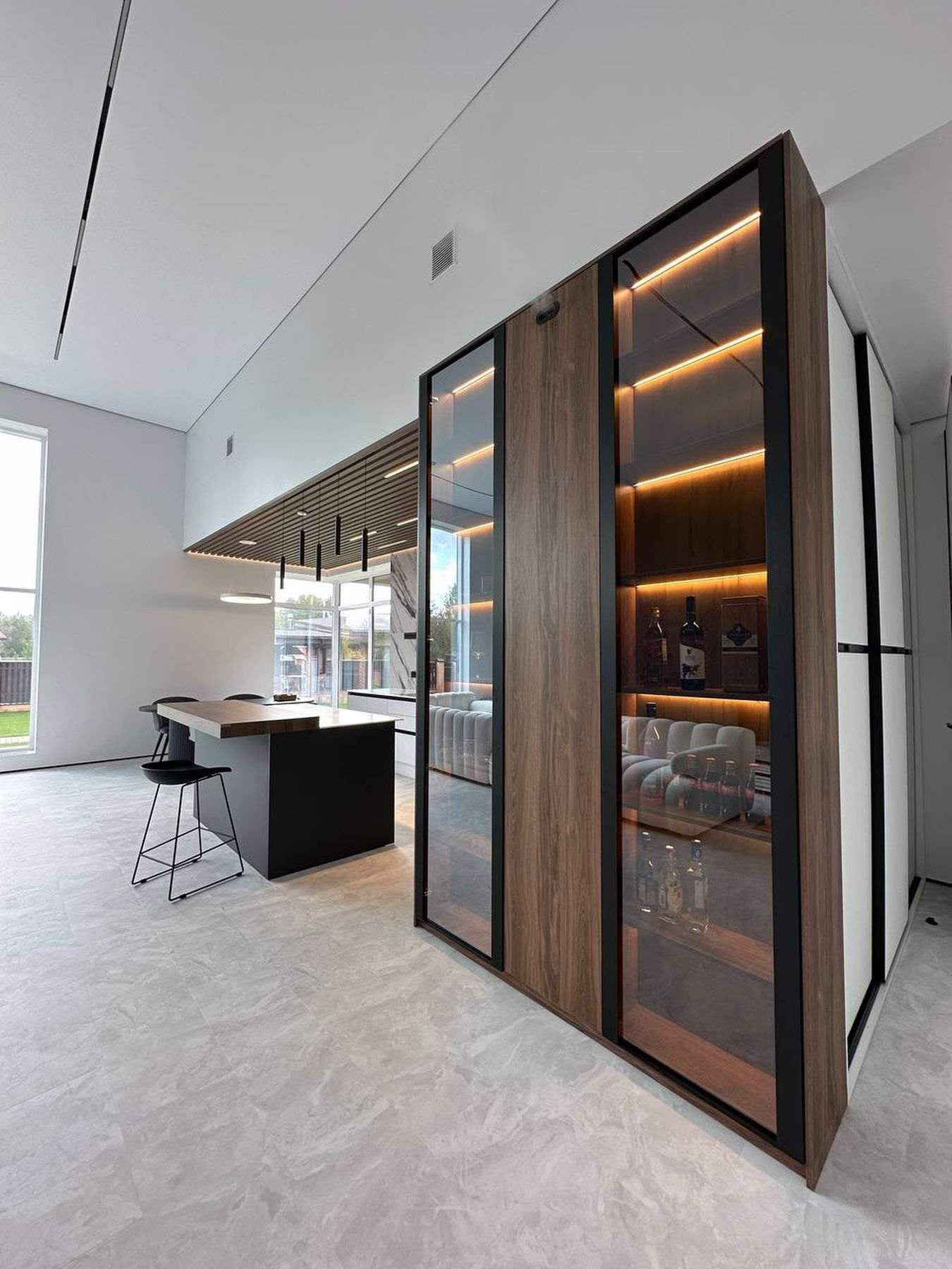 • Гардеробные и шкафы-купе: Система Nova со вставками Jazz. Это решение добавило интерьеру динамики и графичности, сохранив общую лаконичную эстетику.