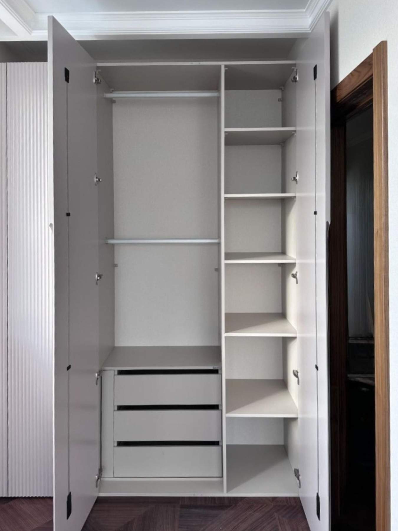 О проектеОписаниеШкаф для дочери заказчика выполнен в нежном жемчужно-розовом матовом цвете, что придает ему изысканность и легкость.