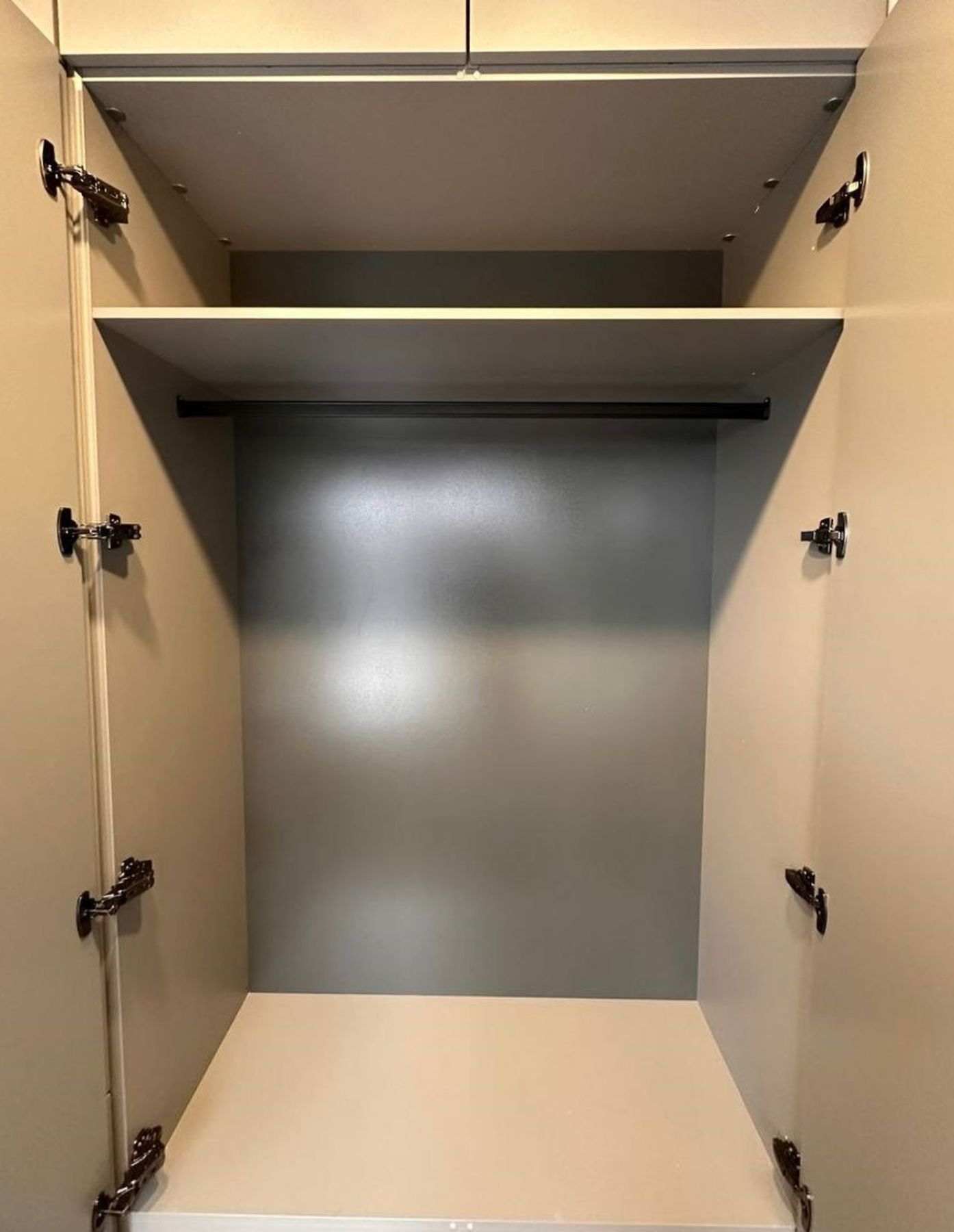 Интегрированные стильные ручки позволяют легко и удобно открывать дверцы. Внутреннее пространство шкафа разделено на удобные секции для хранения верхней одежды, аксессуаров и других вещей.
