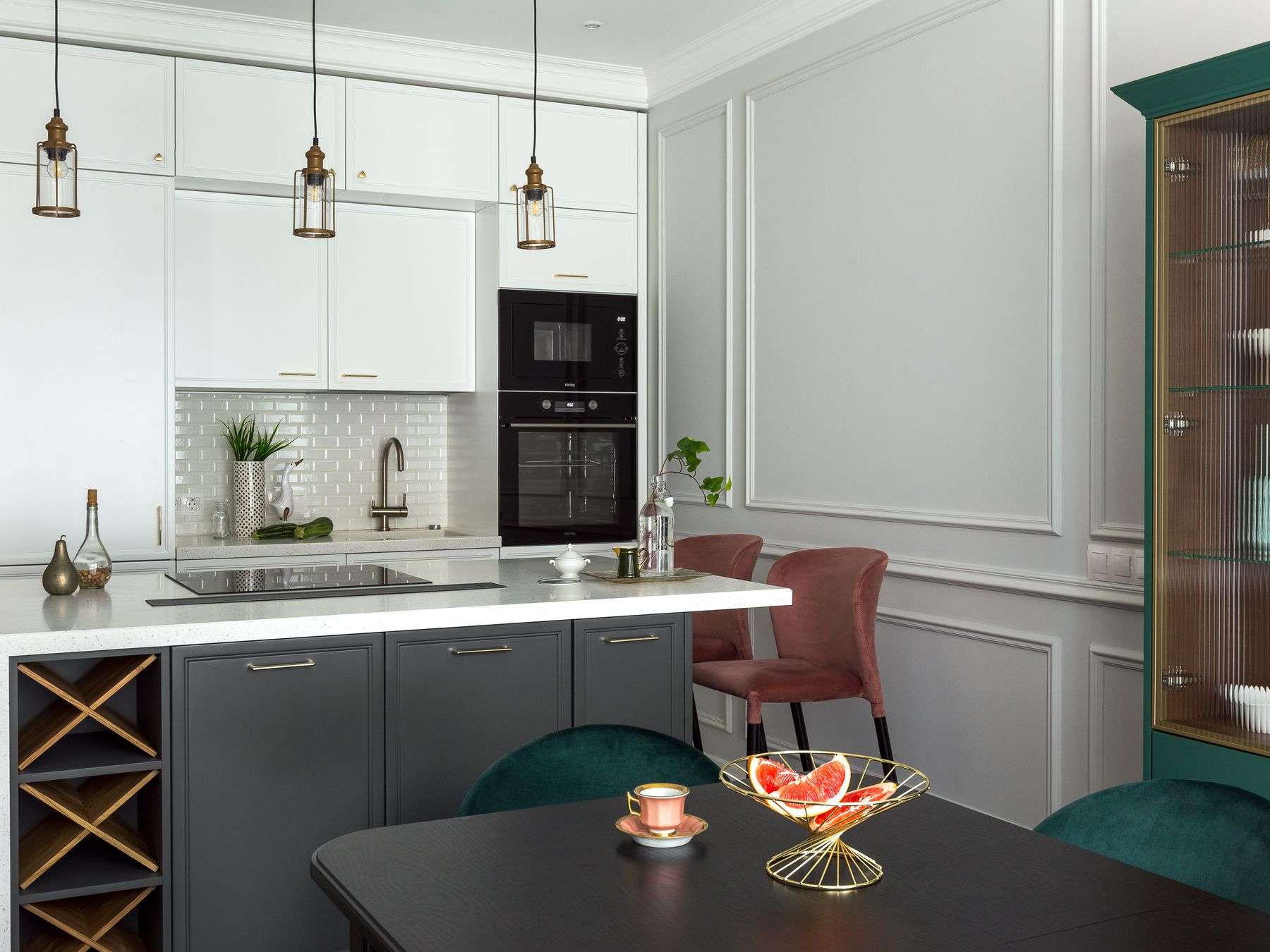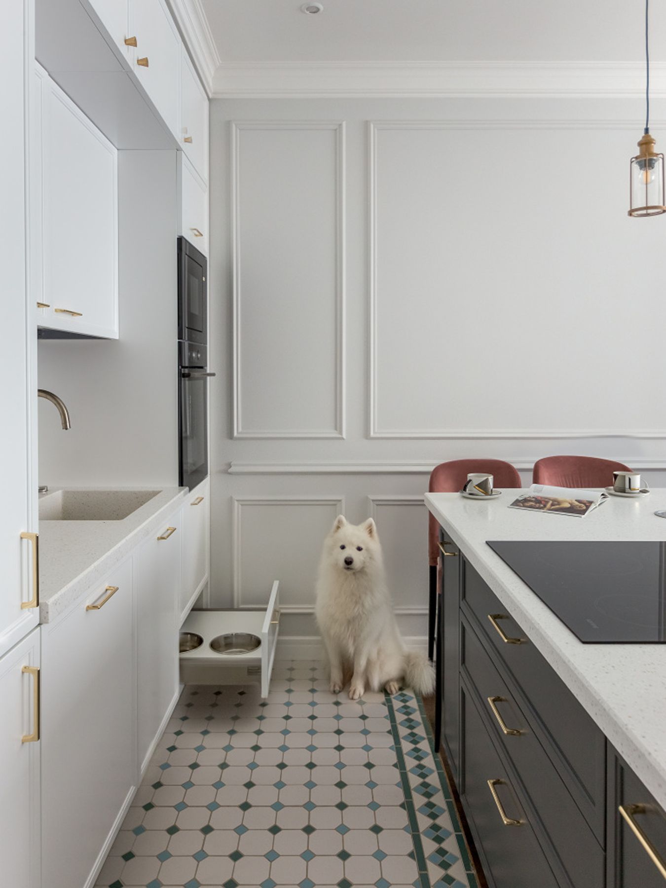 «В концепцию интерьера этой квартиры в стиле современной классики идеально вписалась модель Camelia. Как только она появилась в линейке «Марии», я очень ждала подходящего момента, чтобы ее использовать, – рассказывает автор проекта, дизайнер Альбина Алиева. Главная фишка кухни – это выдвижной ящик с мисками для корма и воды собаки. Я напрасно переживала, что с этим пожеланием клиентов могут возникнуть трудности. Менеджер студии Наталья собрала всю нужную техническую информацию, и вместе мы успешно проработали дизайн и реализацию этого необычного элемента кухни. Получилось удачное решение, удобное как для хозяев, так и для их питомца. Есть собака приучена по расписанию, а попить воды она может в любое время из миски в другой комнате».