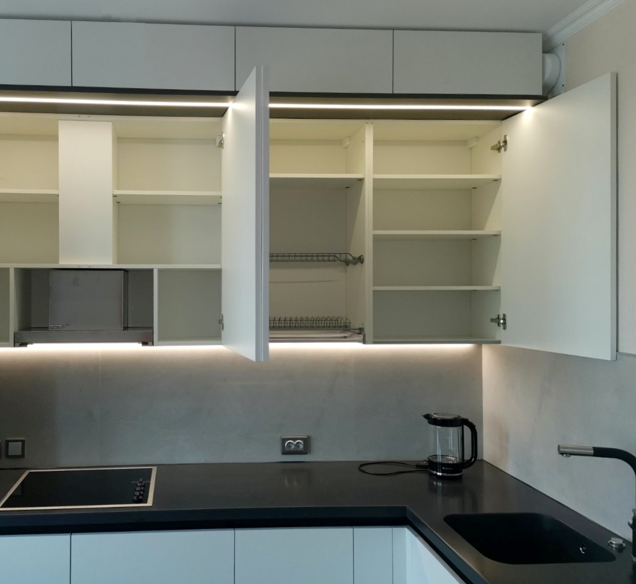 Реализовали мечту о функциональной и лаконичной кухне: линейные светильники, стеклянные витрины и врезной светильник WING, который визуально облегчил антресоли.