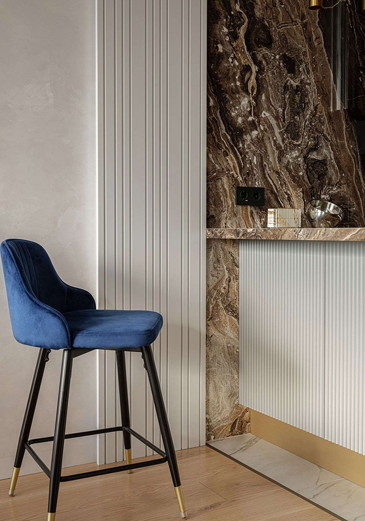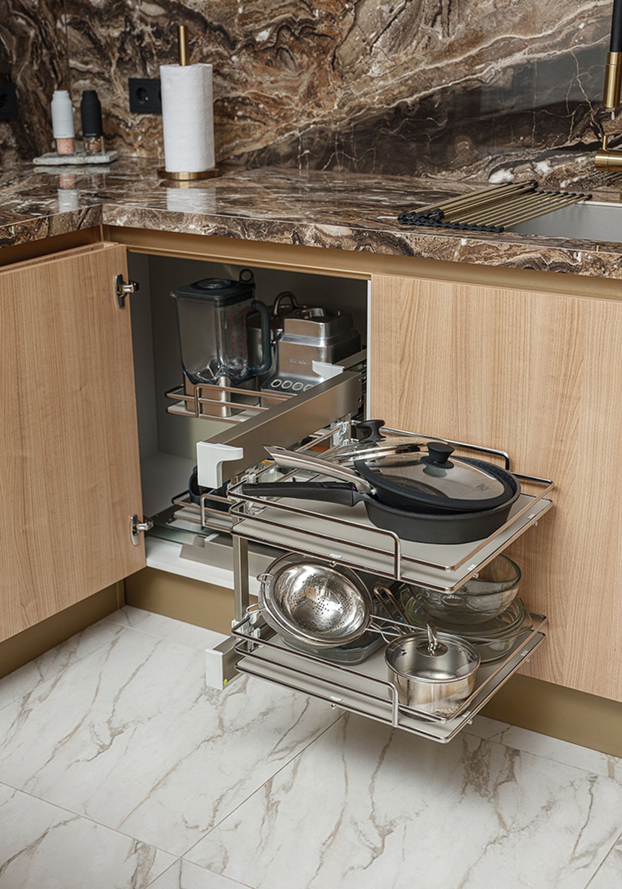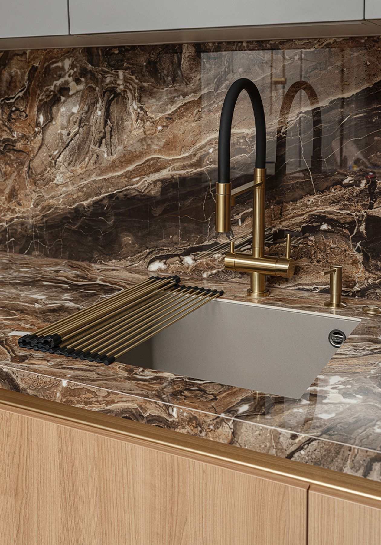 - Столешница: Роскошная столешница из кварца, чья фактура дополняет общую эстетику.