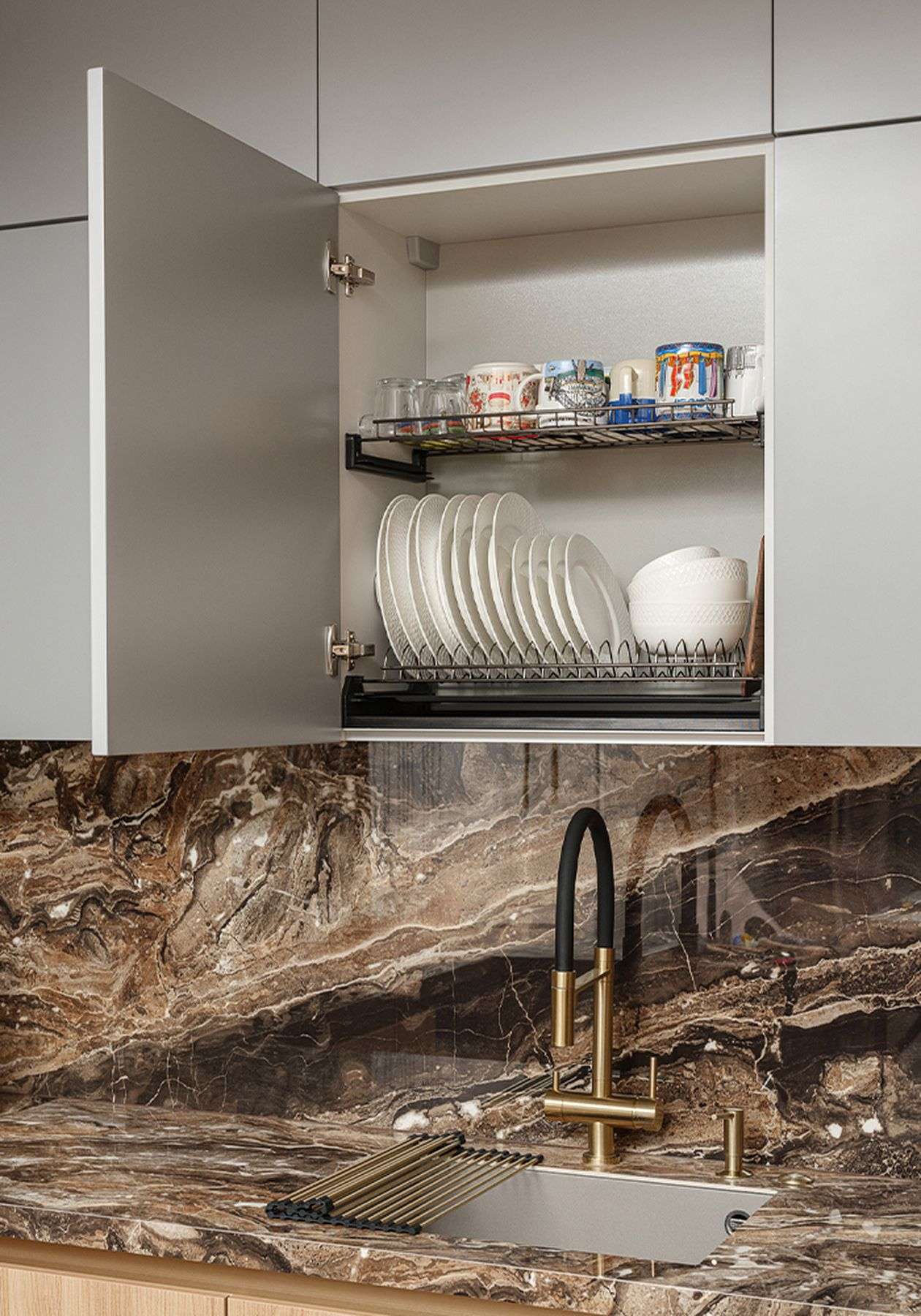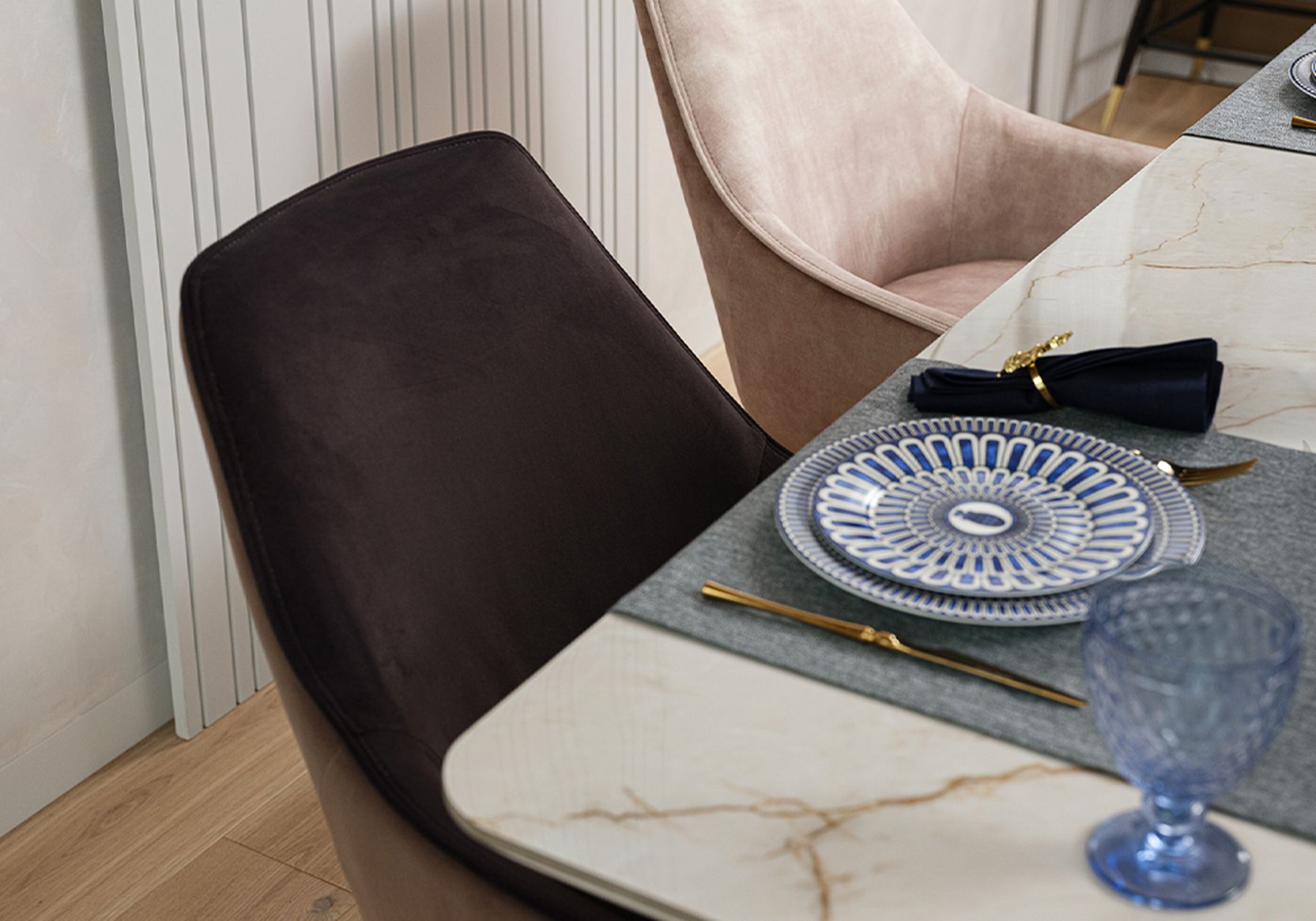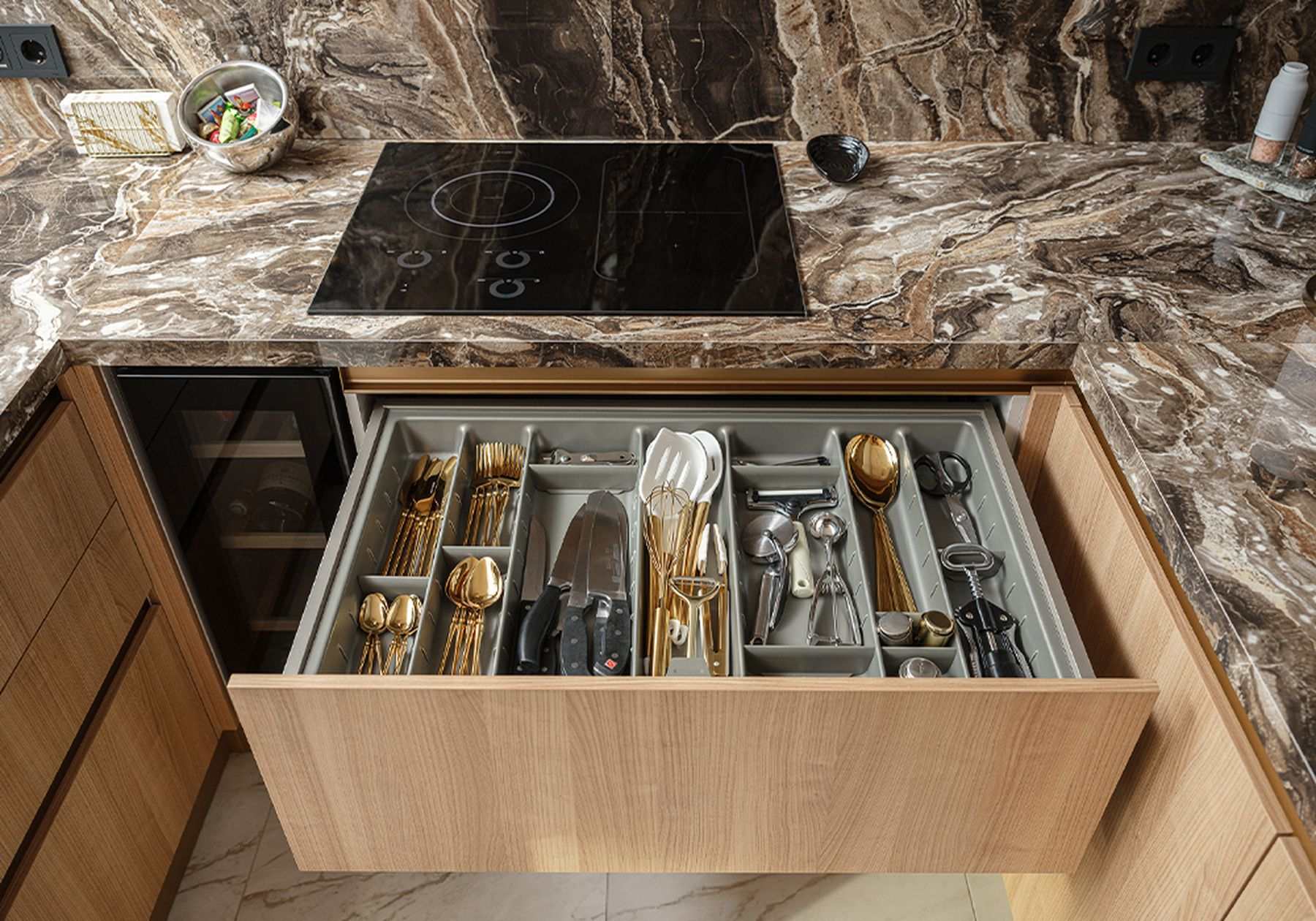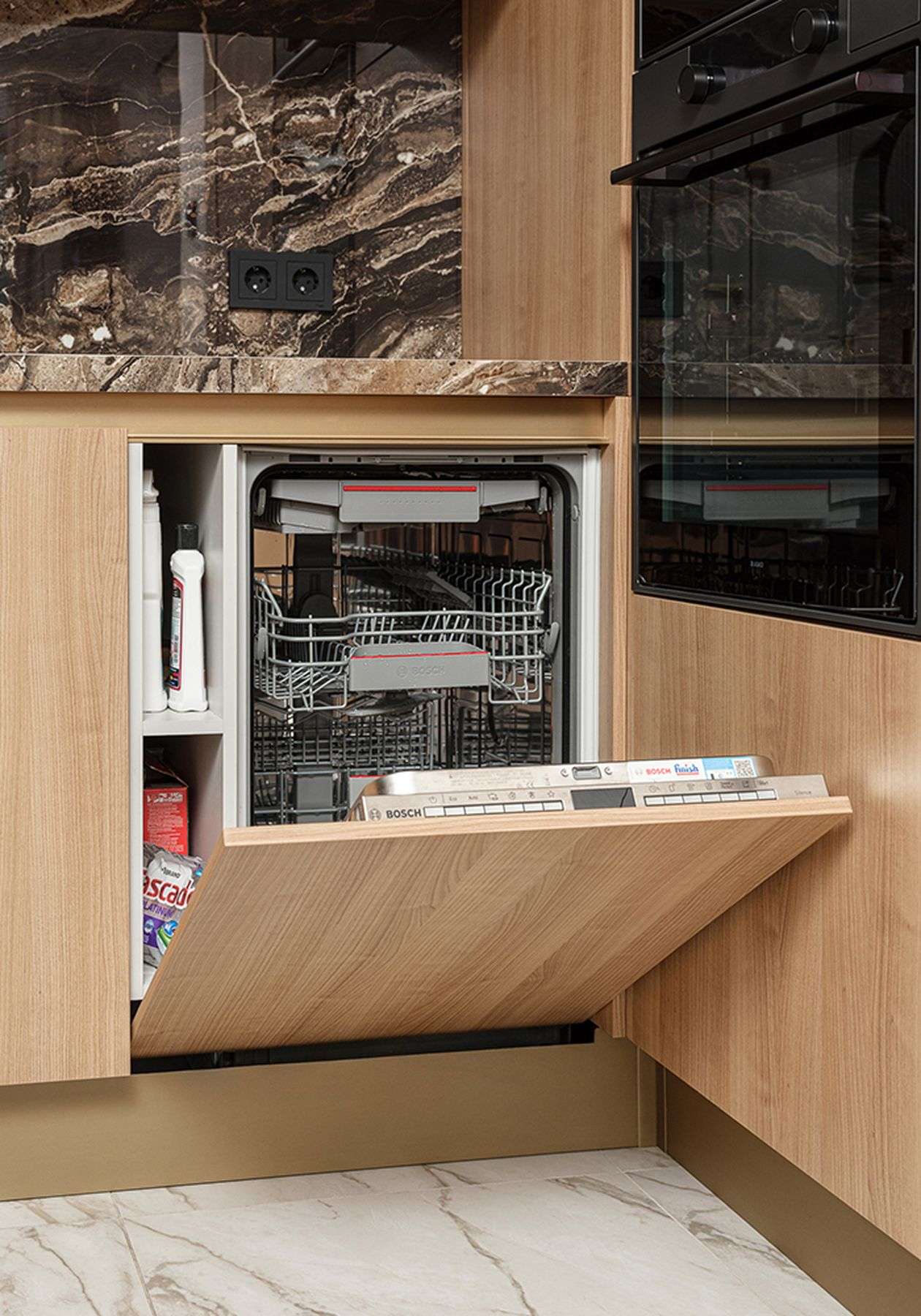 - Столешница: Роскошная столешница из кварца, чья фактура дополняет общую эстетику.