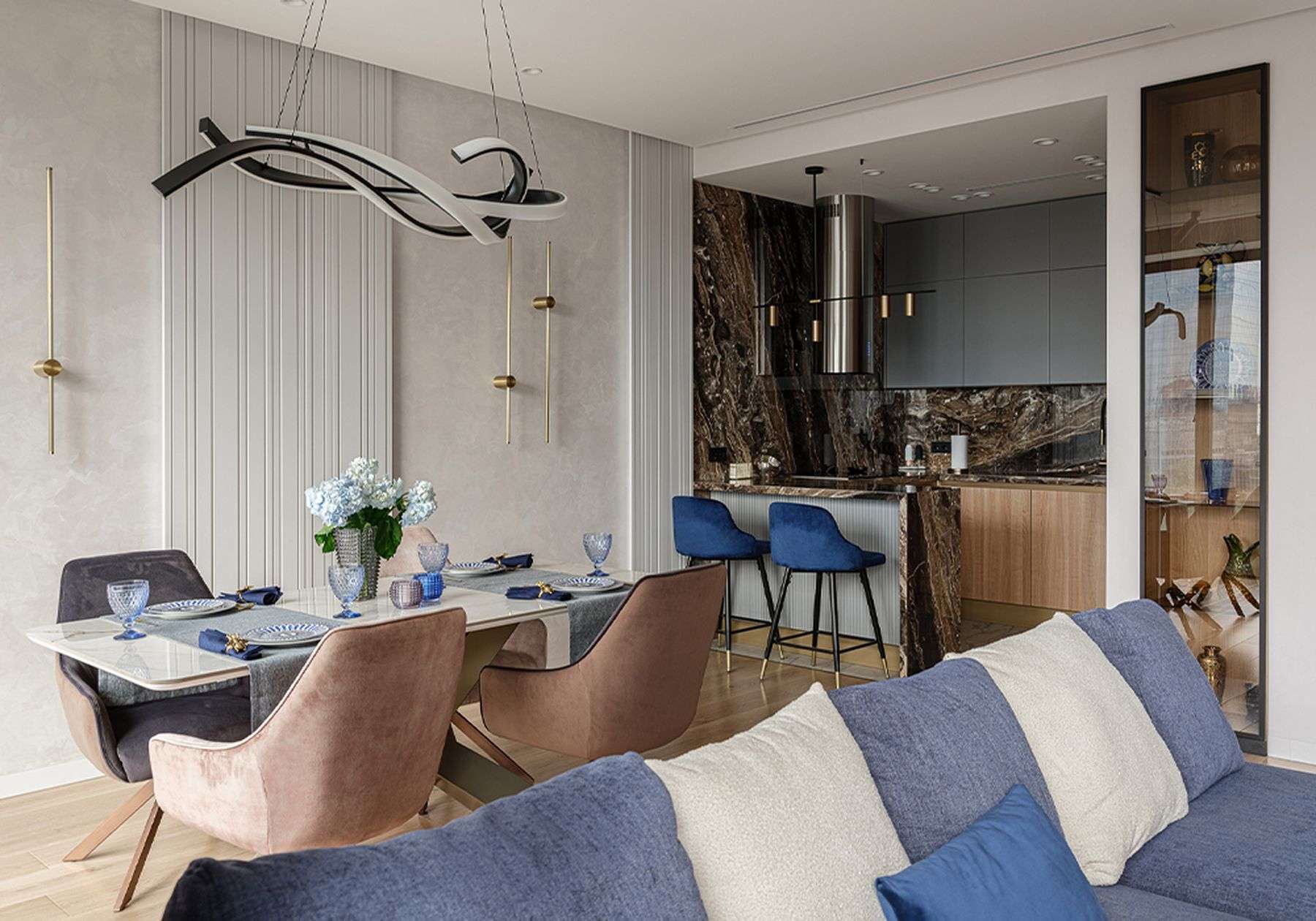 - Визуально отделить кухонную зону от гостиной, сохранив ощущение простора.