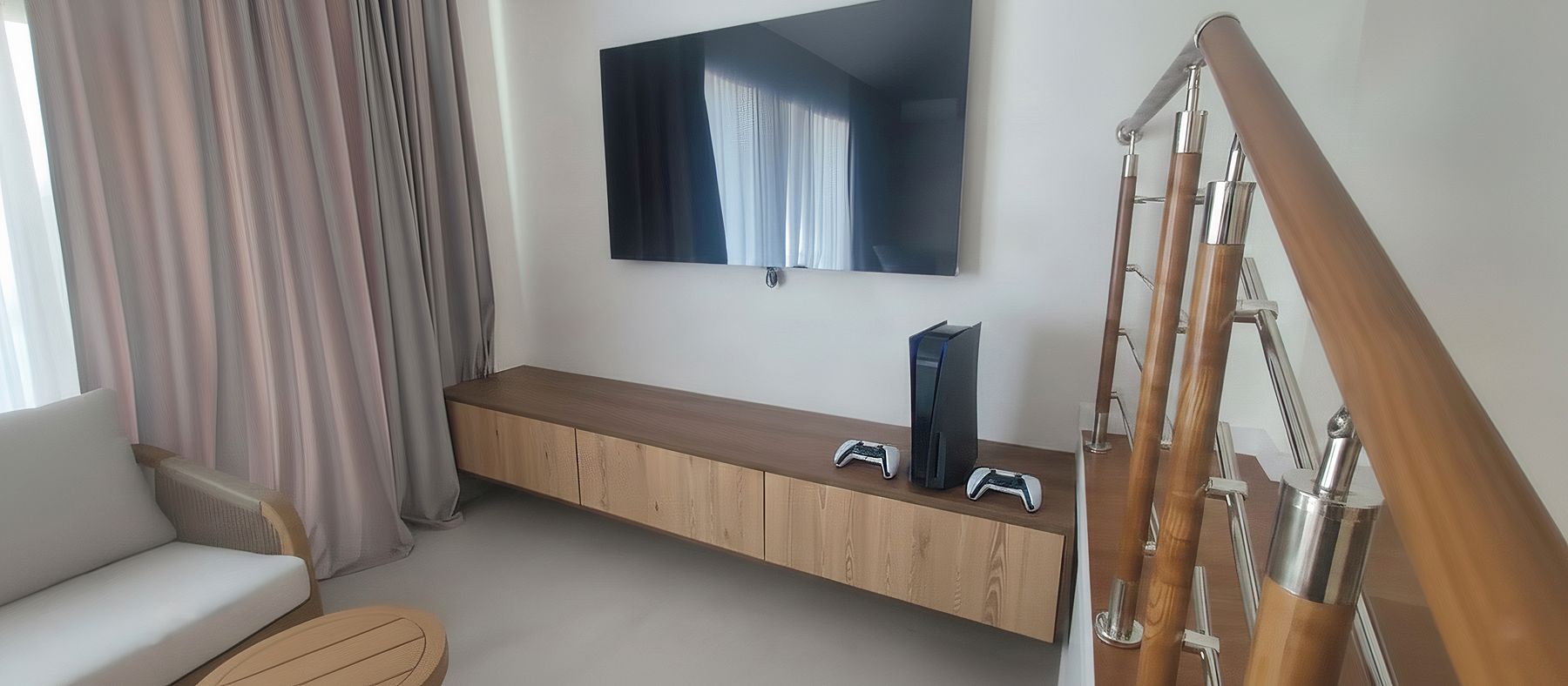 О проектеОписаниеЭтот проект решает задачи по созданию стильной ТВ-зоны для гостиной и организации практичного хранения мелочей. Нашим решением стал гармоничный комплект подвесных консолей, которые экономят пространство и поддерживают порядок.