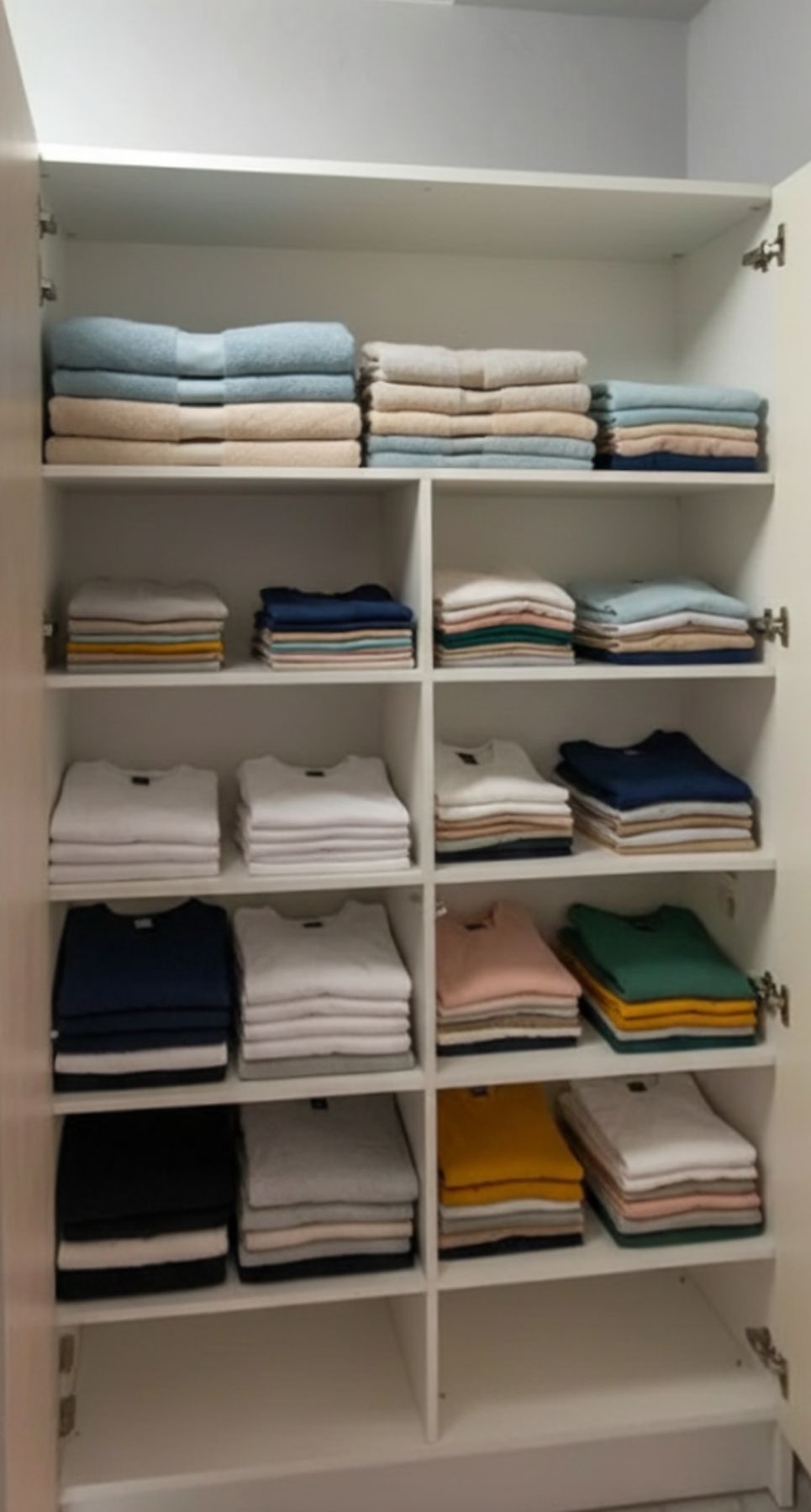 Шкаф имеет нестандартную глубину, что позволяет использовать выдвижные штанги для одежды, обеспечивая удобный доступ к вещам. Внутреннее наполнение включает достаточное количество полок для хранения различных предметов, а также сетки для обуви, что помогает поддерживать порядок и организованность.