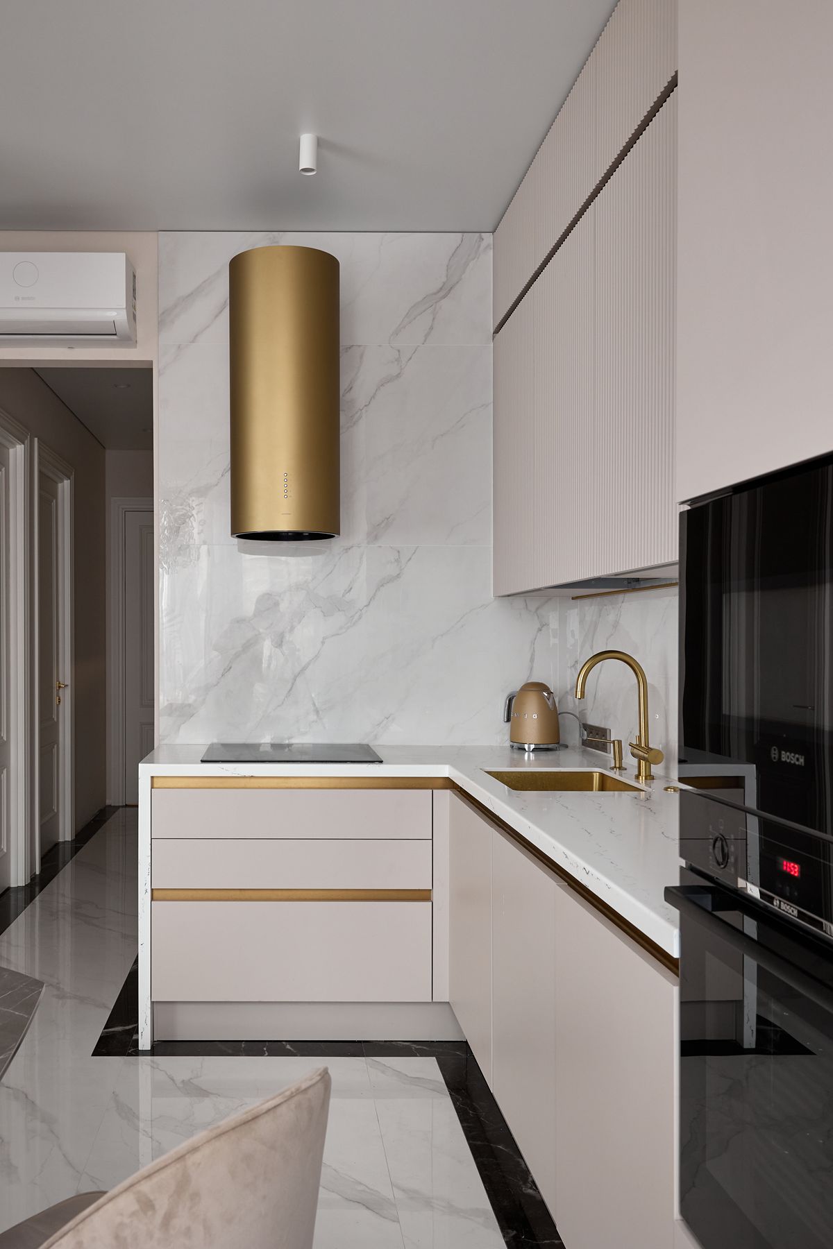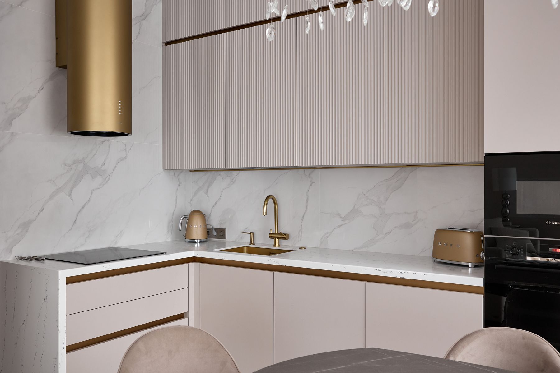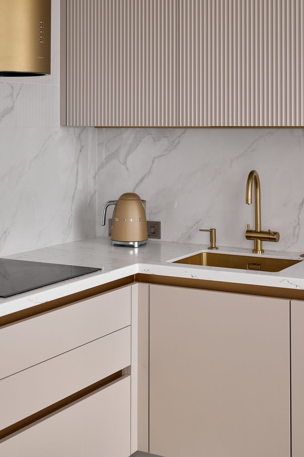 Столешница, изготовленная из искусственного камня с элегантным мраморным узором, предоставляет достаточно пространства для кулинарных экспериментов. Стильными акцентами интерьера стали золотые элементы, такие как вытяжка, профиль Gola, мойка и смеситель.