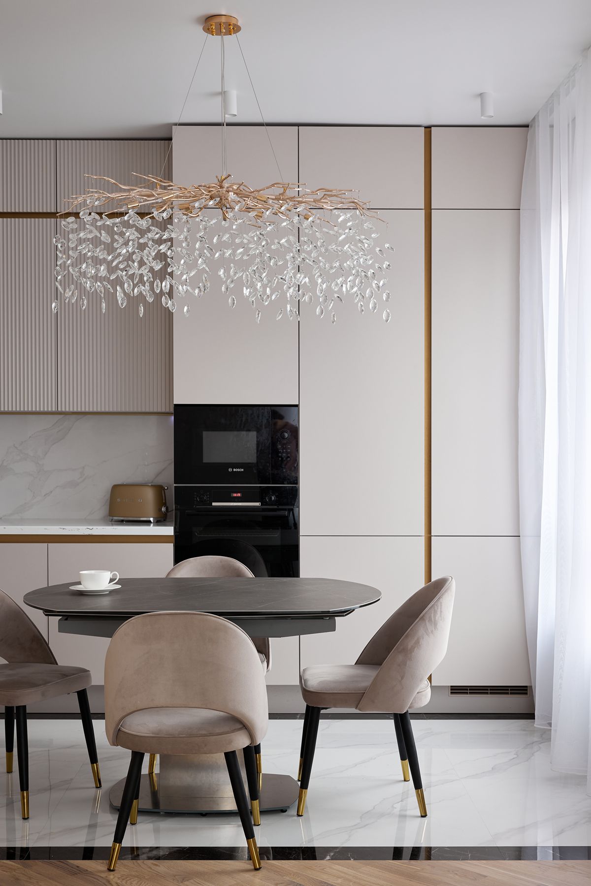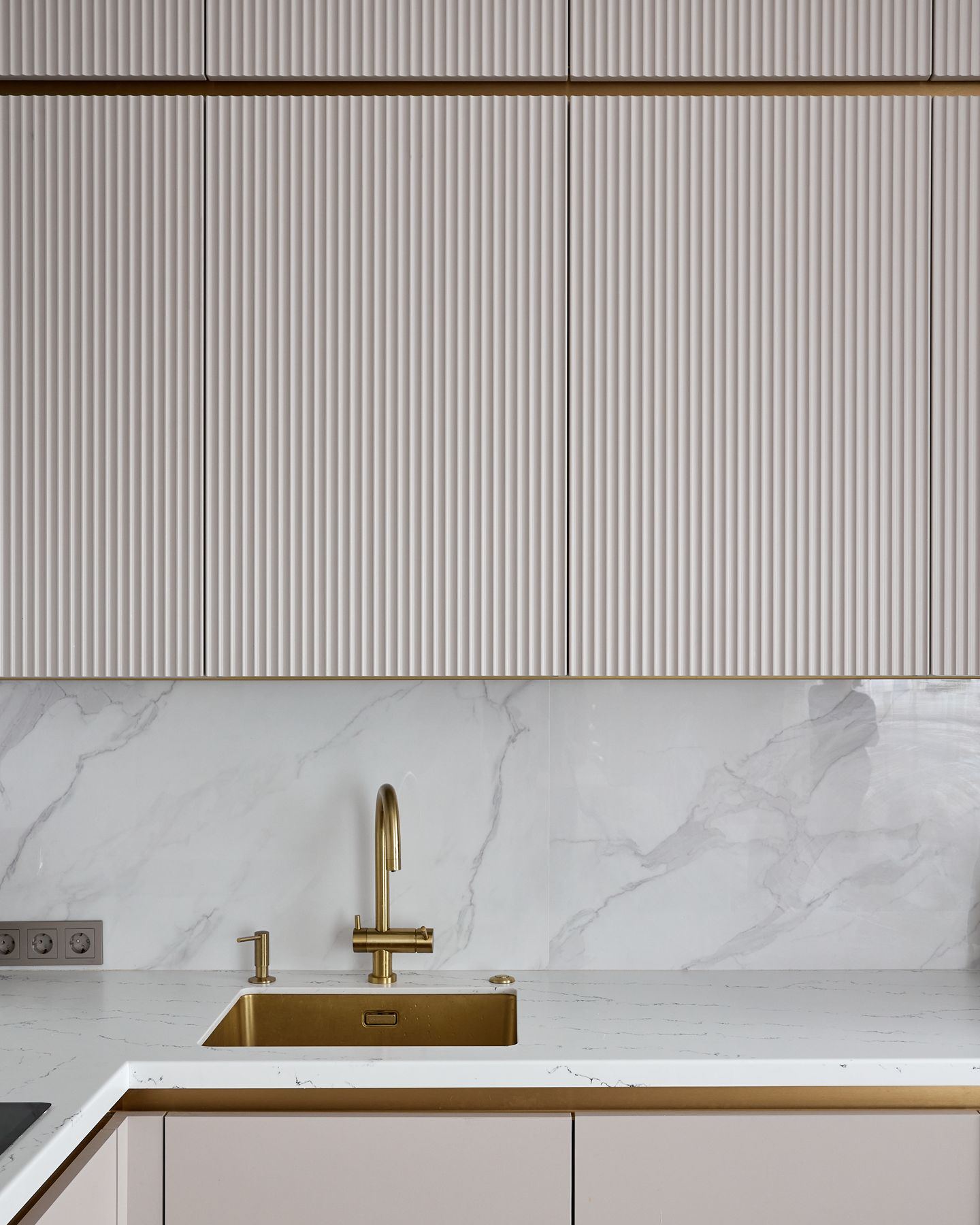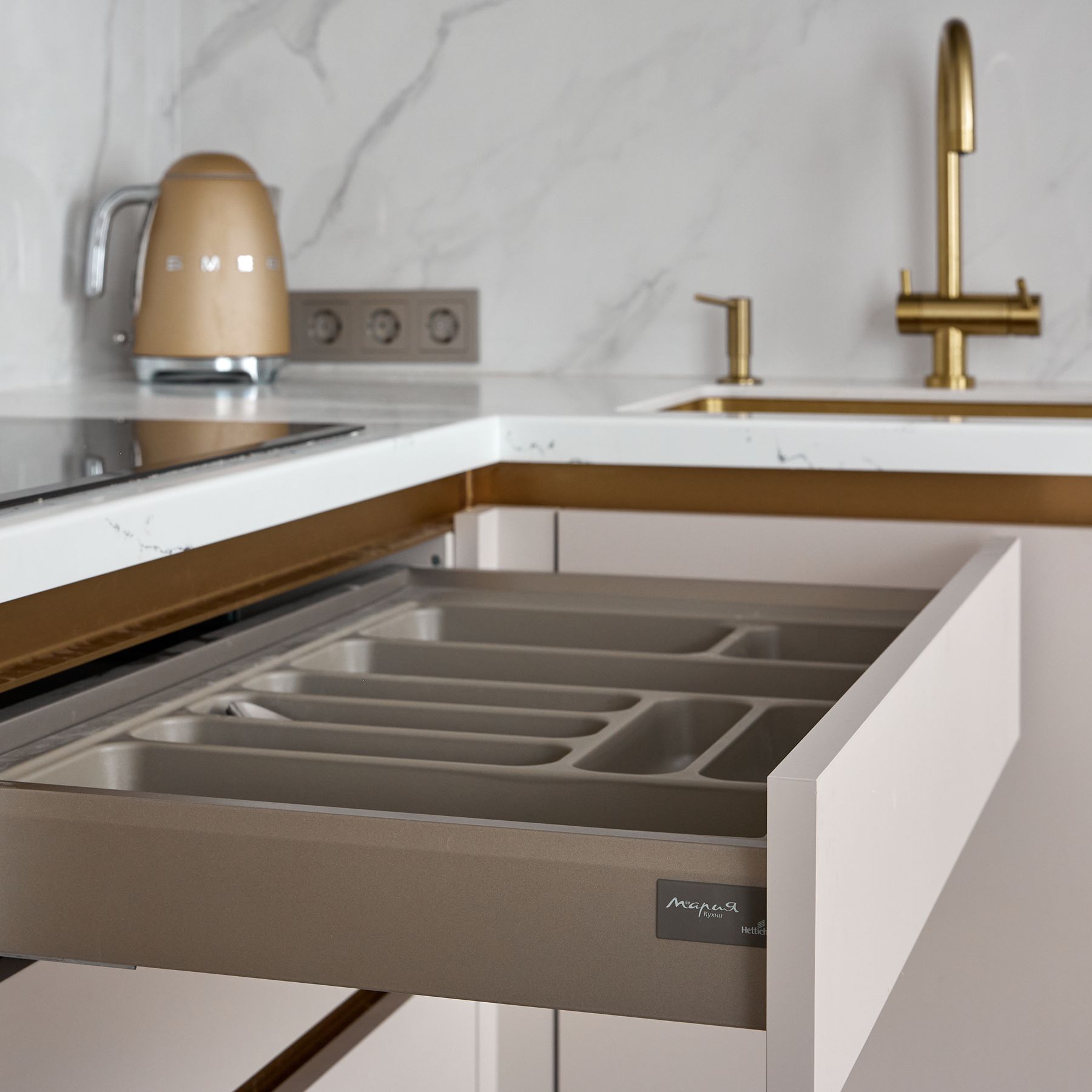 Столешница, изготовленная из искусственного камня с элегантным мраморным узором, предоставляет достаточно пространства для кулинарных экспериментов. Стильными акцентами интерьера стали золотые элементы, такие как вытяжка, профиль Gola, мойка и смеситель.