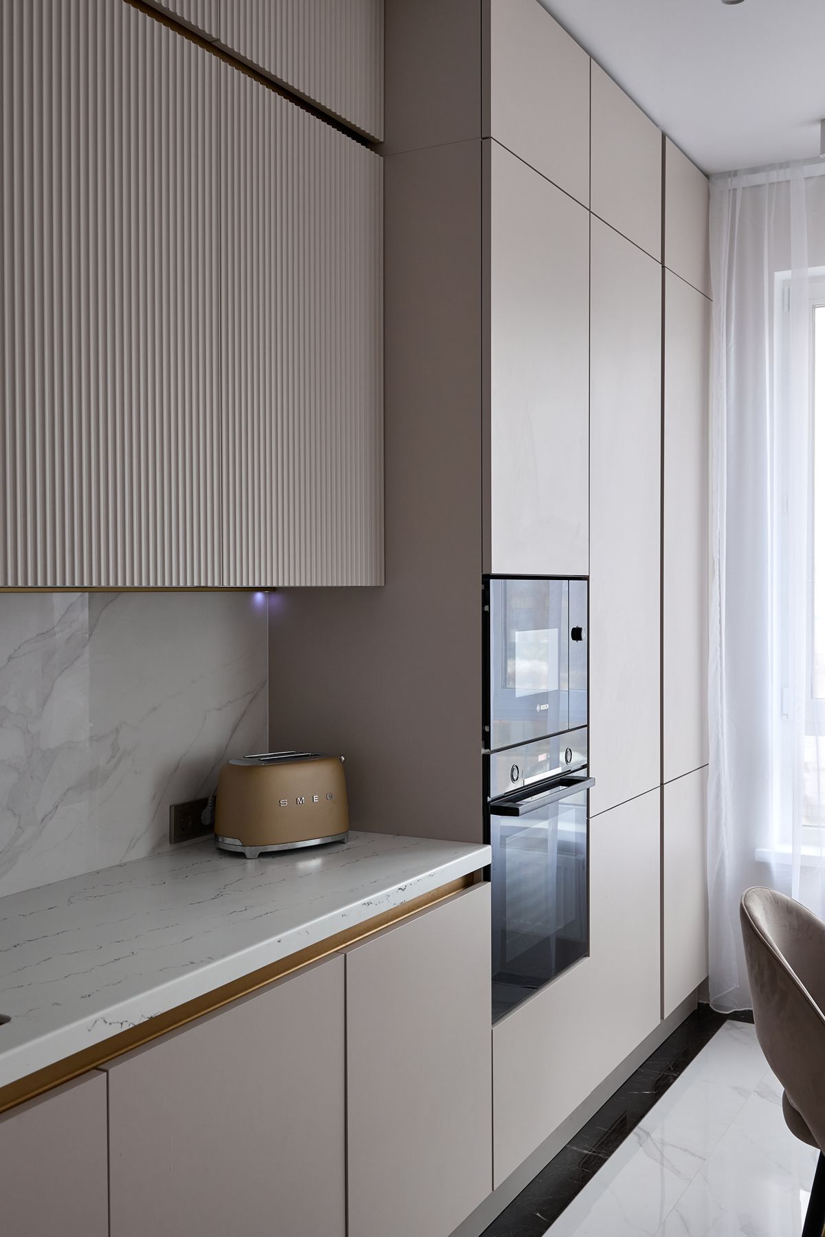 Дизайнер студии «Мария» помогла клиентке не только создать эстетически привлекательную, но и функциональную мебель. Она порекомендовала выбрать сдержанные фасады модели-бестселлера Mix 22 в популярном оттенке «кашемир», которые легко чистятся и сохраняют идеальный вид даже при активном использовании. Рифленые фасады Teramo стали актуальным дополнением, придающим кухне современный вид.
