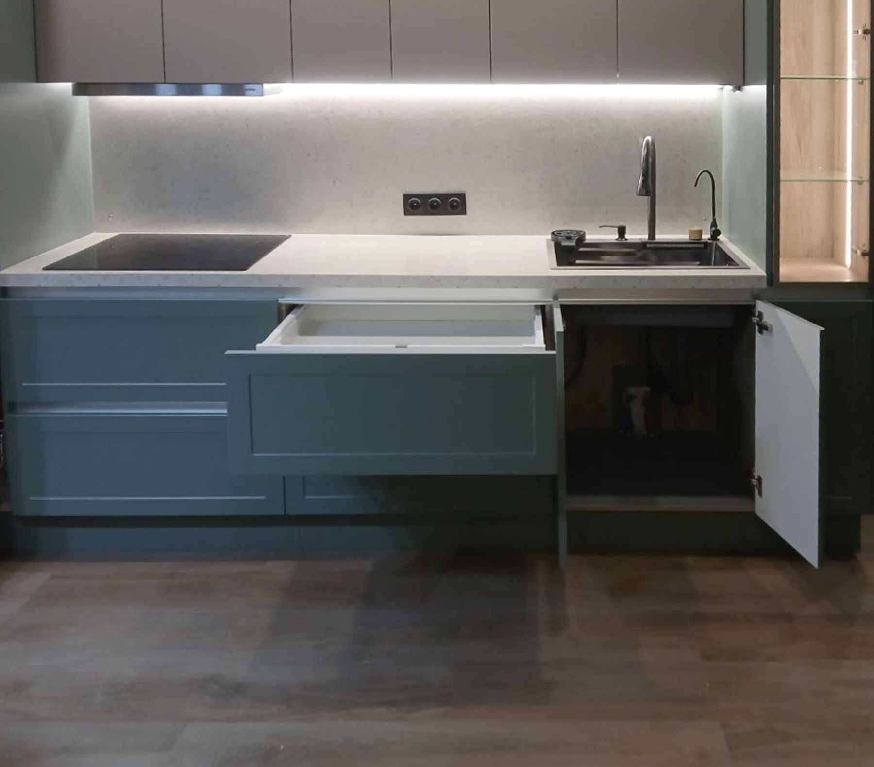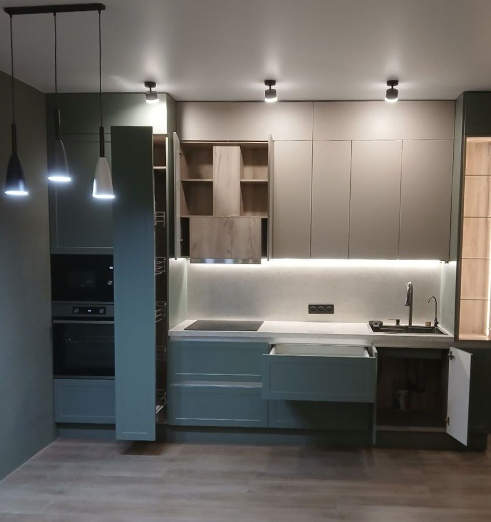 О проектеОписаниеКухня выполнена в моделях Sole и Urbano в серо-зелёном и глиняном сером цвете, c витриной, использующей рамку Novara в серебре и стекло stopsol серый. Столешница изготовлена из ДСП в цвете Вайт кашемир глянец. Кухня выполнена под потолок с фальш-фасадами.