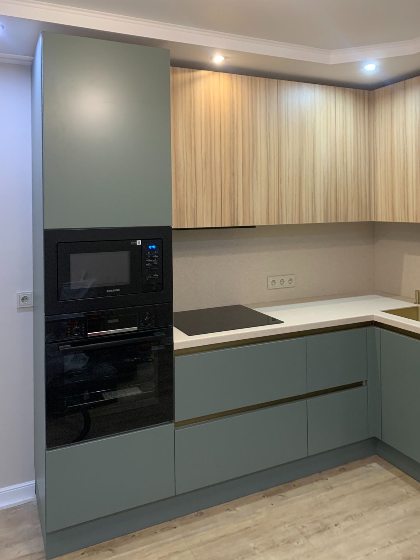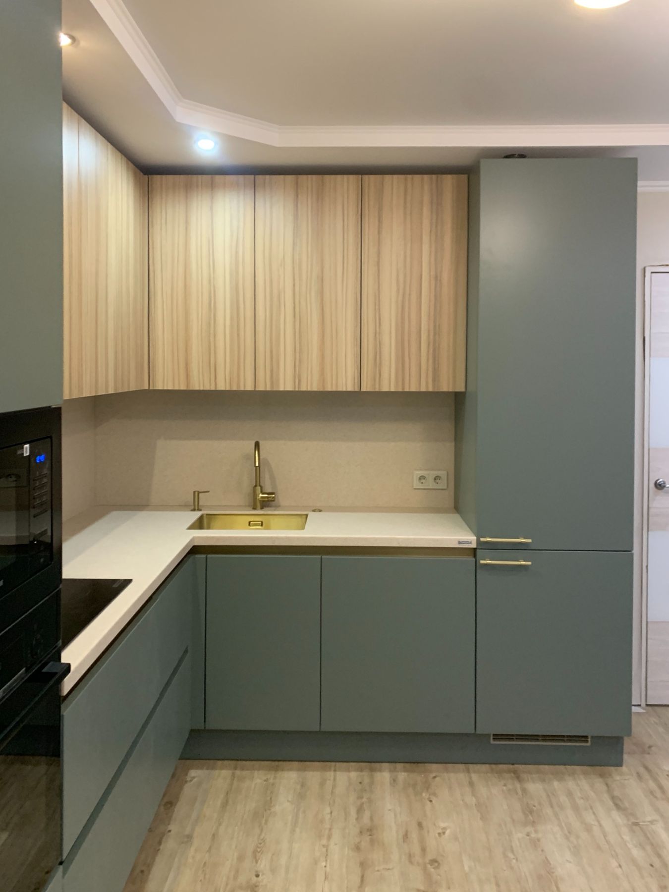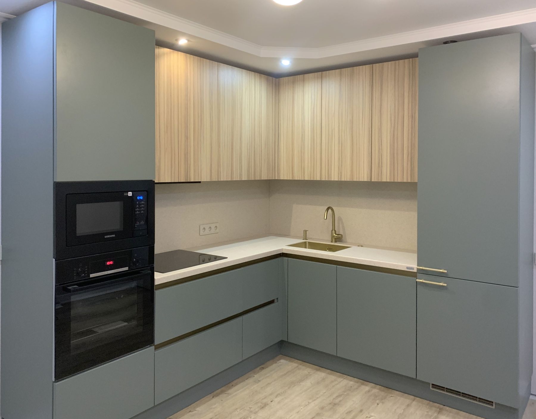О проектеОписаниеСоединение моделей Teramo в цвете "Серо-зеленый" и Mix 22 в цвете "Кокоболо натуральный" позволило сделать очень красивую, нежную кухню. Золотые элементы в виде профиля Gola, ручек на пенале со встроенным холодильником, врезной мойки и смесителя добавили изящности.