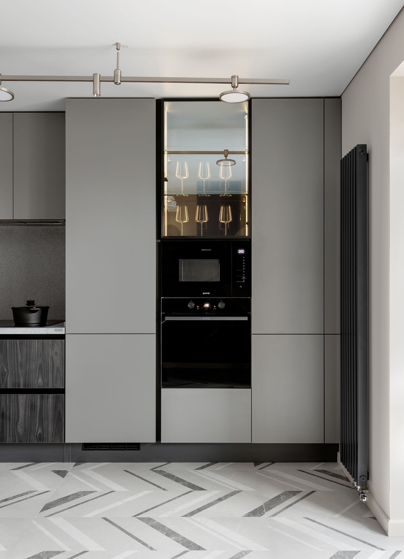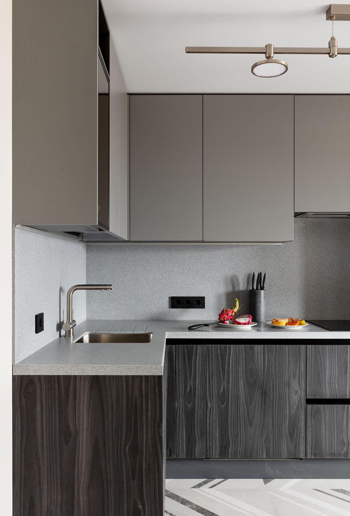 Фасады верхних шкафов и колонн модели Mix 22 выполнены в холодном сером цвете, а нижние фасады модели Spark имитируют фактуру тёмного дерева. Контраст между цветами фасадов придаёт помещению выразительность и глубину. Витрины с затемнённым стеклом эффектно подсвечены изнутри. Интегрированные ручки подчёркивают строгость дизайна и чистоту линий.