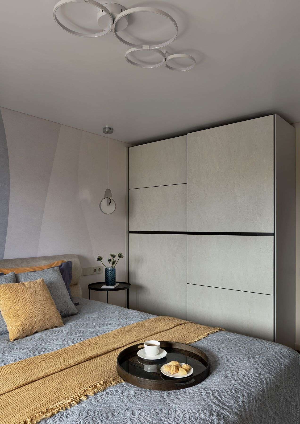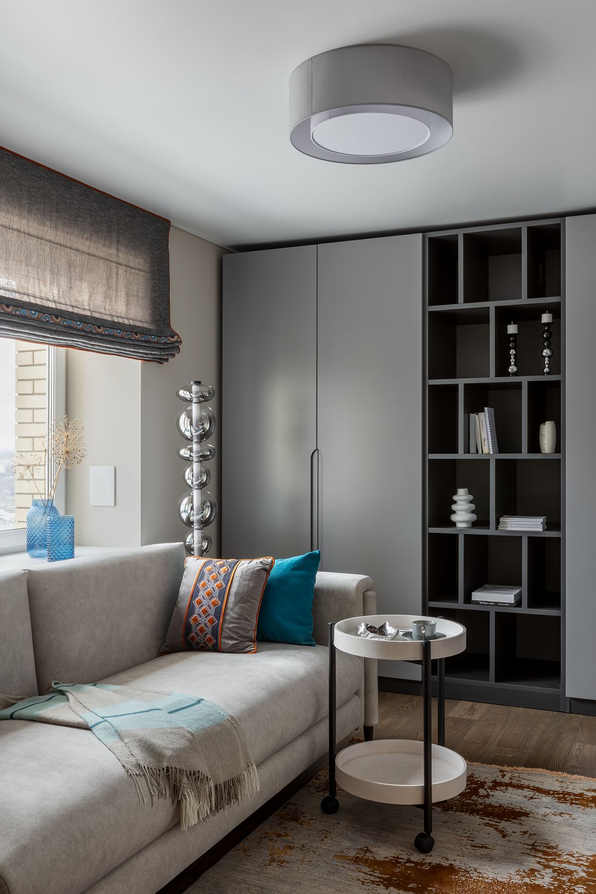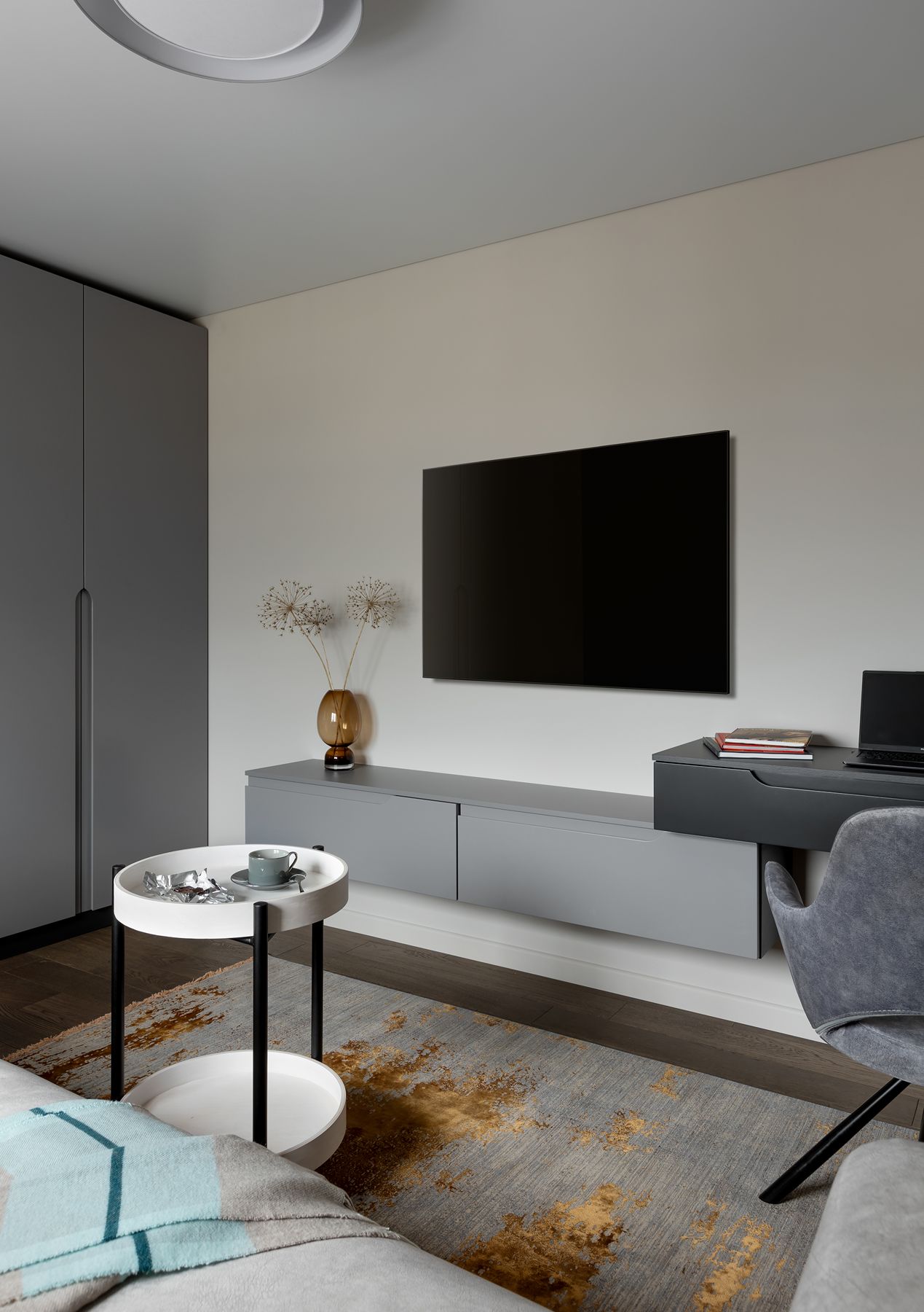Интерьер гостиной выдержан в том же сдержанном стиле. Акцент сделан на серый шкаф с открытыми полками и лёгкие консоли модели Integrato. В спальне тёплые оттенки текстиля смягчили строгость интерьера, поэтому шкаф-купе и модули living-зоны модели Spark не кажутся такими брутальными. Входная зона со шкафами и стеновыми панелями модели Mix 22 получилась приветливой и комфортной, поддержав при этом сдержанный и лаконичный дизайн квартиры.