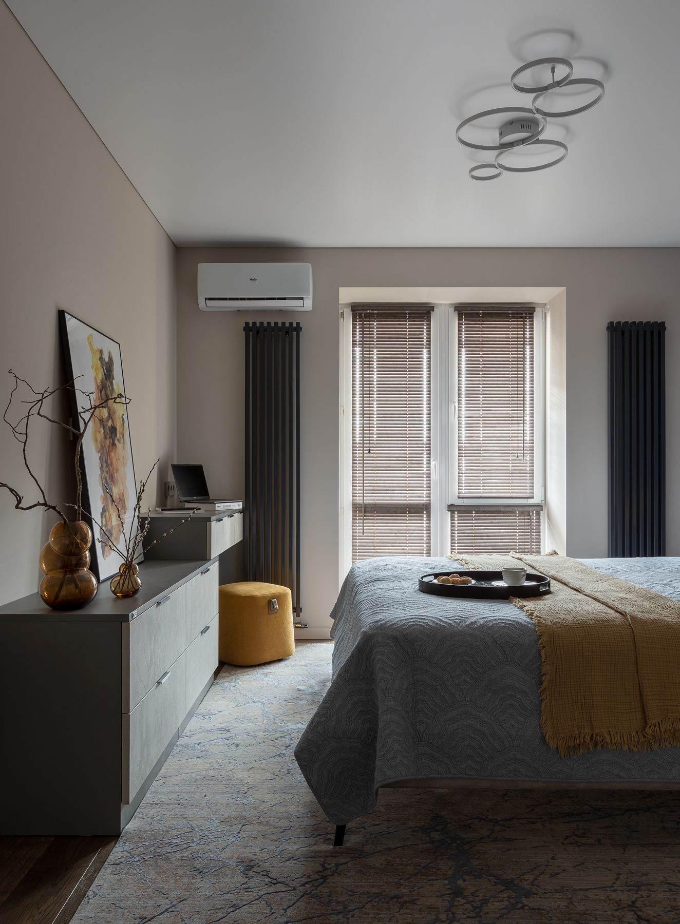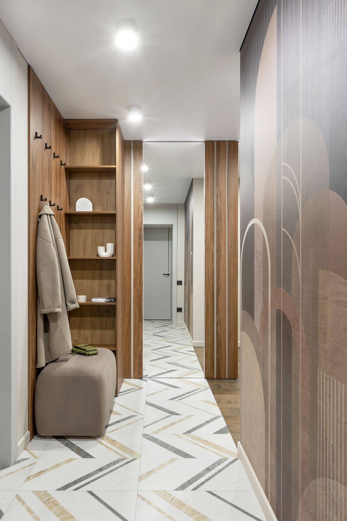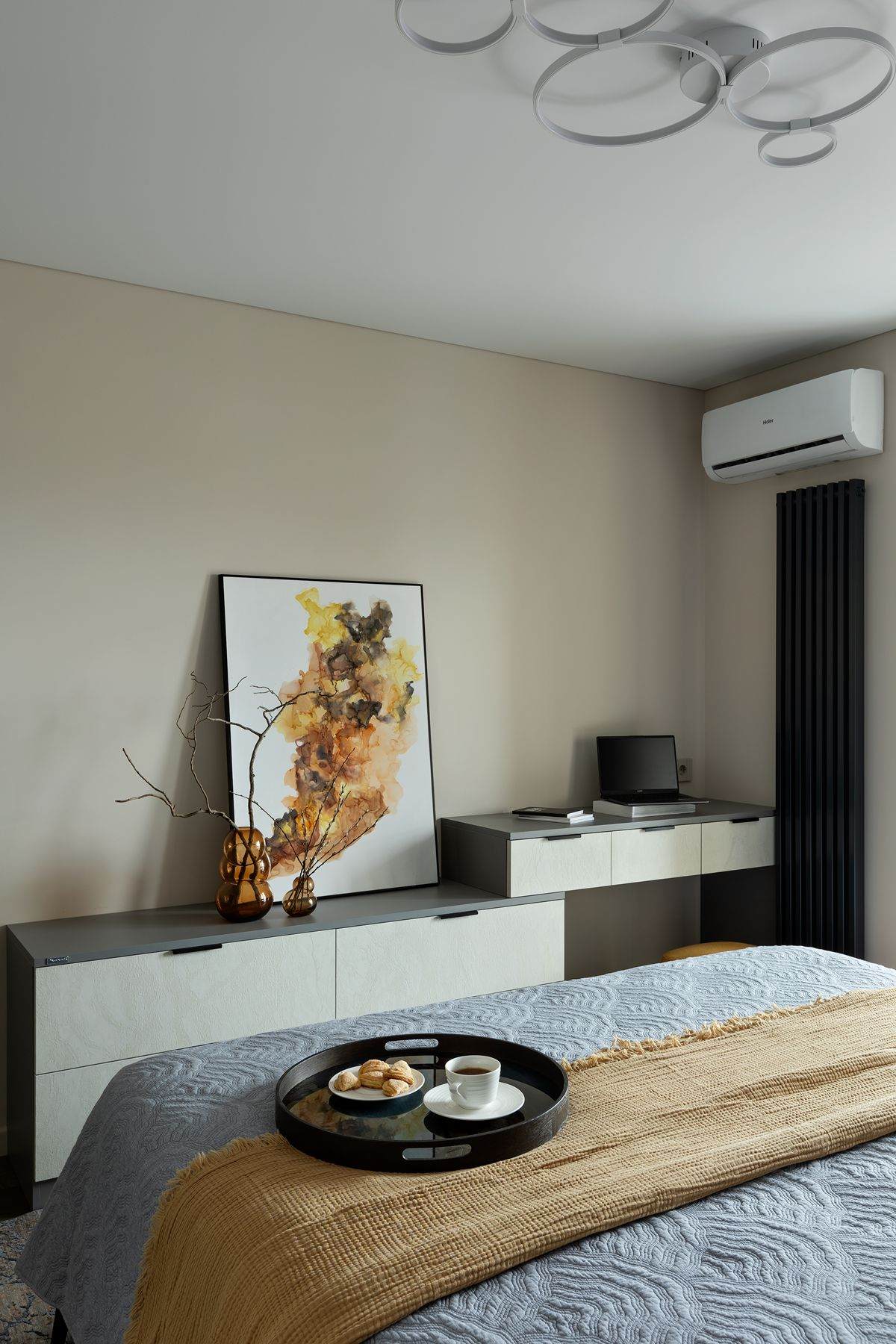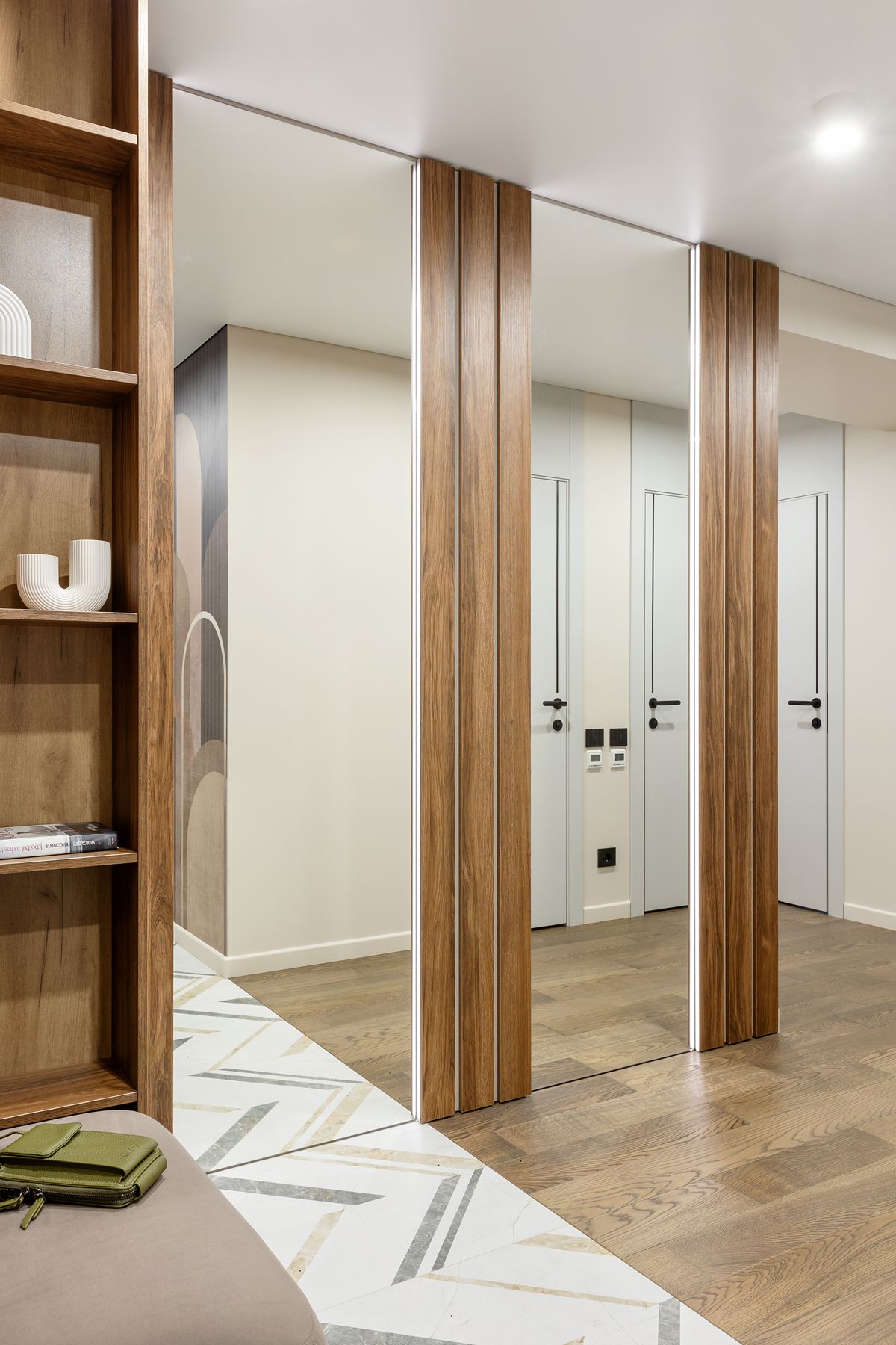 Интерьер гостиной выдержан в том же сдержанном стиле. Акцент сделан на серый шкаф с открытыми полками и лёгкие консоли модели Integrato. В спальне тёплые оттенки текстиля смягчили строгость интерьера, поэтому шкаф-купе и модули living-зоны модели Spark не кажутся такими брутальными. Входная зона со шкафами и стеновыми панелями модели Mix 22 получилась приветливой и комфортной, поддержав при этом сдержанный и лаконичный дизайн квартиры.