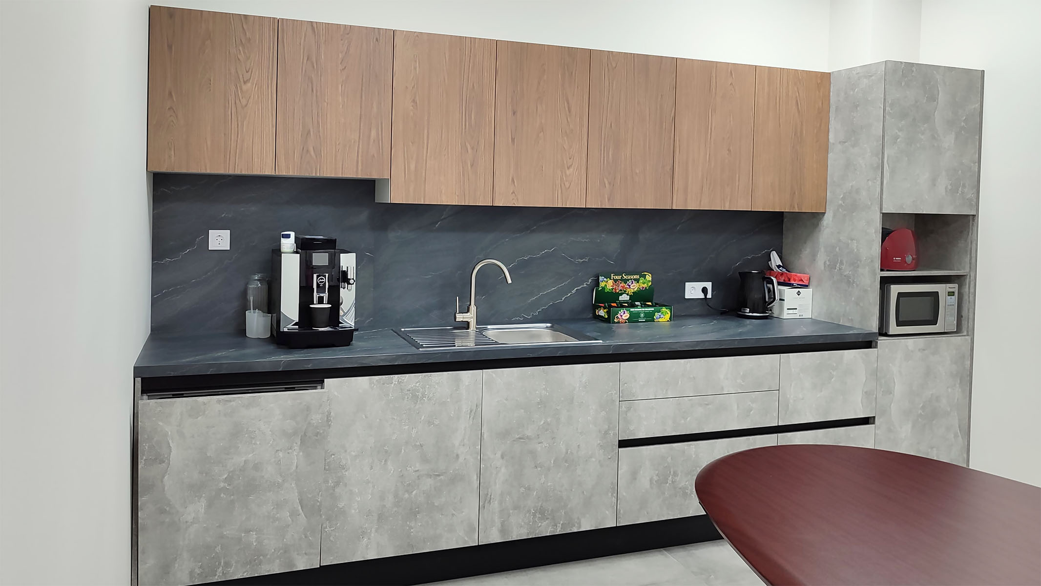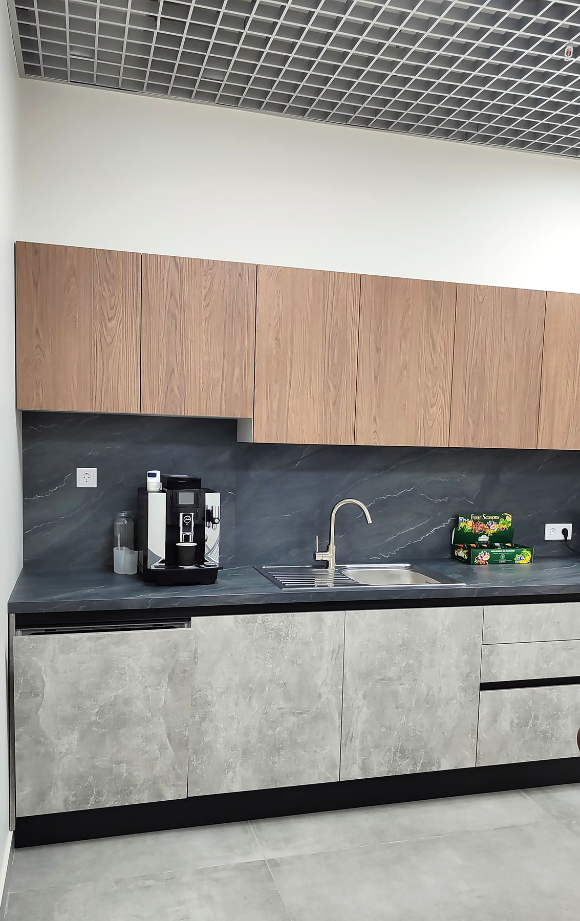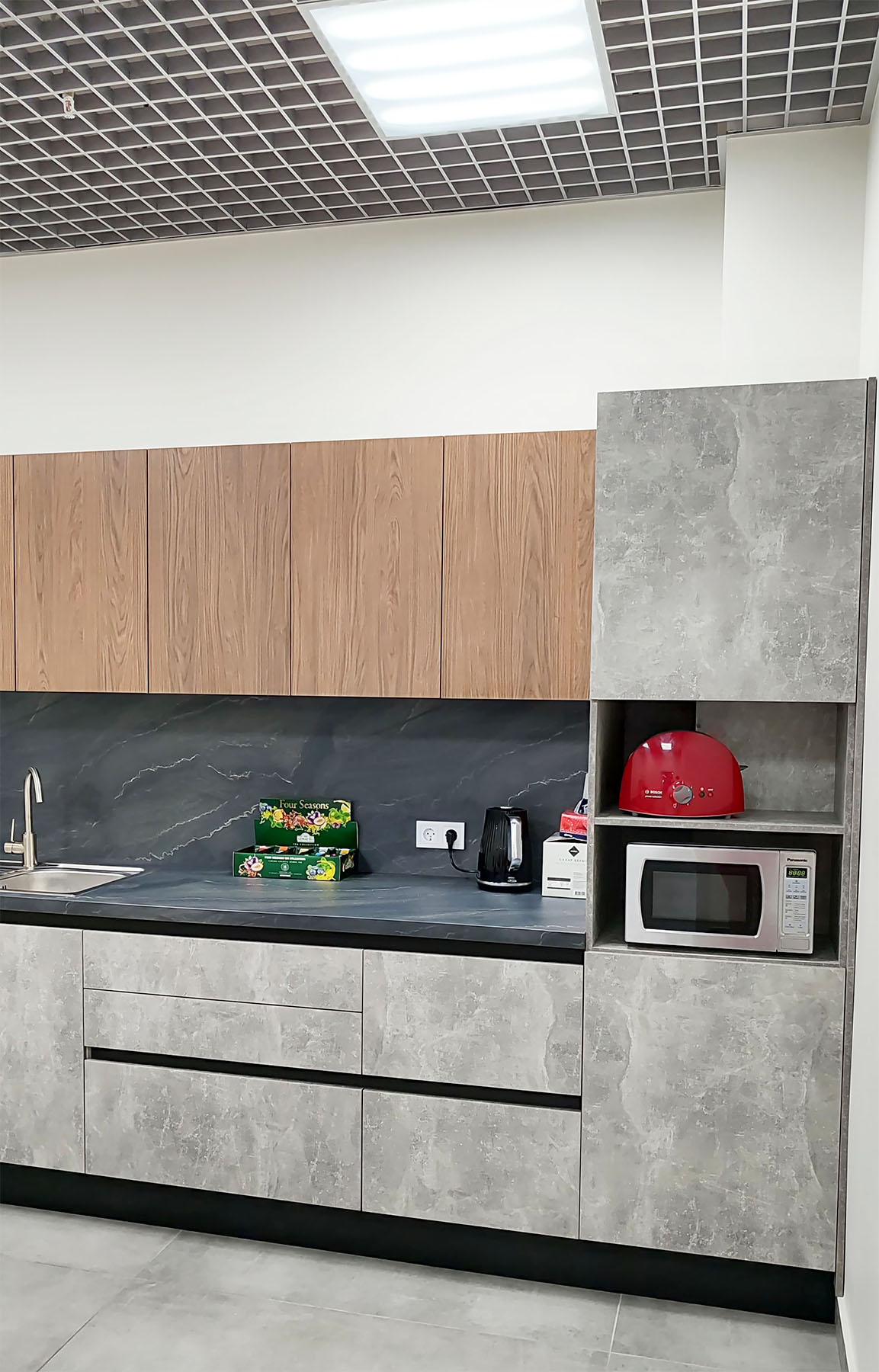 О проектеОписаниеКухня в офисе сделана качественно и стильно. Корпус собран из австрийского ЛДСП 16 мм двух цветов: нижняя часть светло-серого ("Ателье светлое"), верх — натурального дерева ("Дуб каселла"). Поверхность стола прочная, толщиной 40 мм, глубокого черного цвета ("Черный Лазурит").