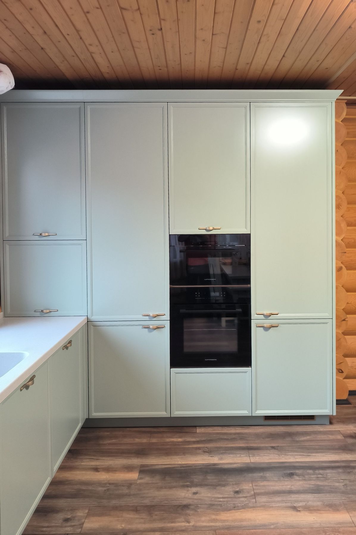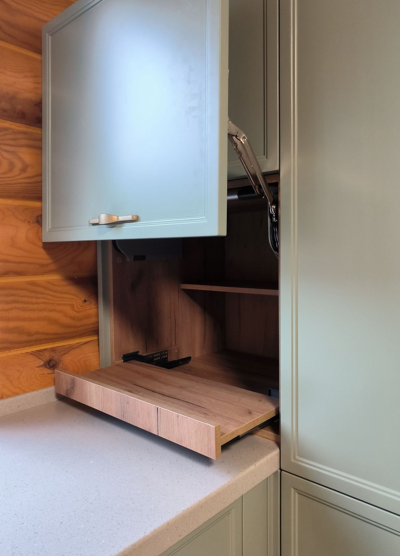 О проектеОписаниеКлиенту сильно понравился цвет кухни, которая стояла в студии, и появилось желание воплотить ее у себя дома. Основной задачей было сделать достаточно места для хранения, но не перегружать кухню шкафами. Снизу все выдвижные ящики с фурнитурой Hettich, угловая выдвижная система Inoxa Ellite, комплект Тандем Сайд от Kessebohmer.