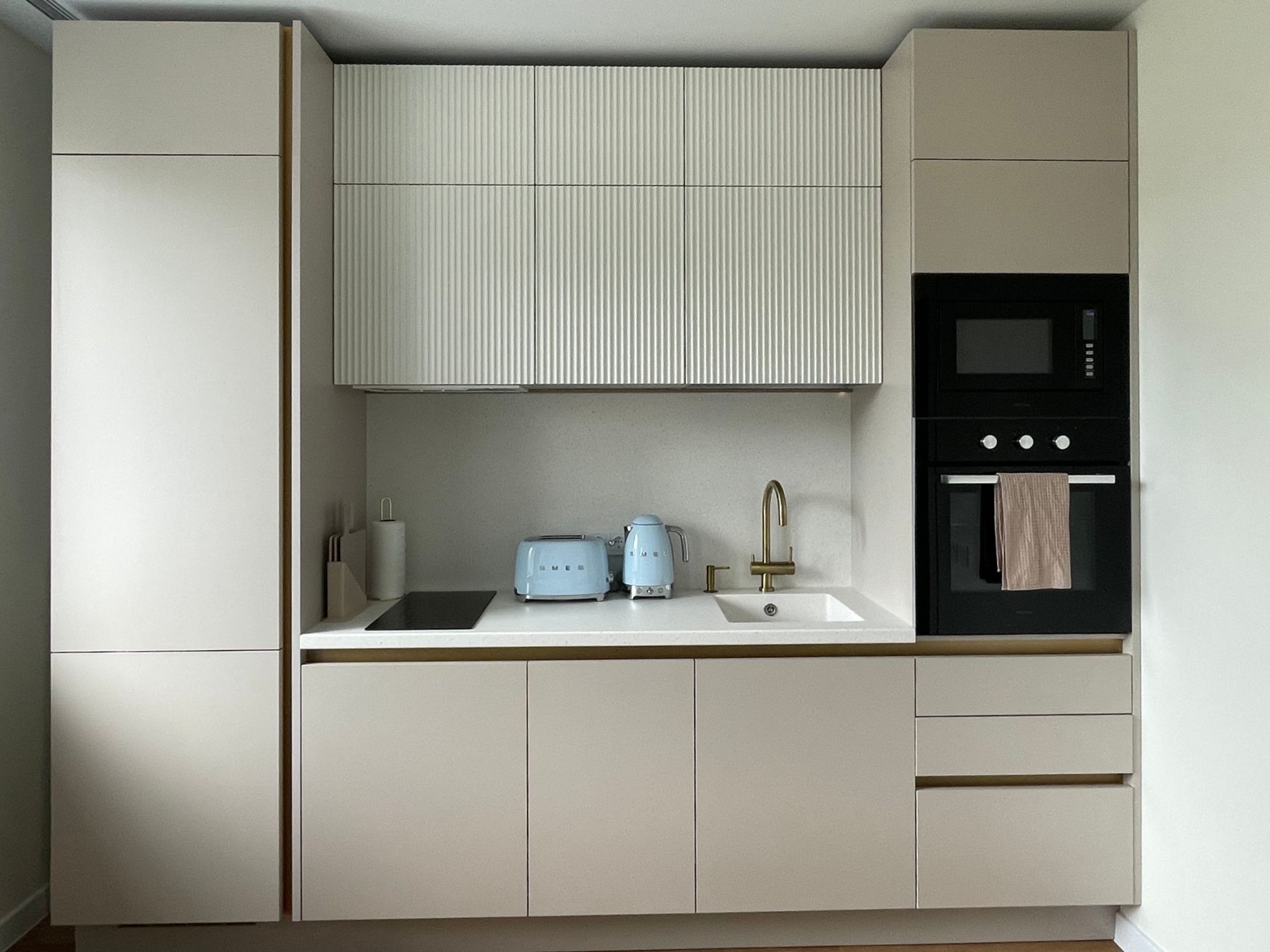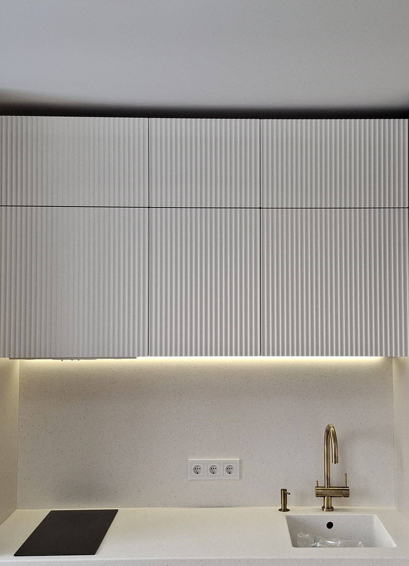 О проектеОписаниеЭта кухня для молодой девушки представляет собой пространство, где функциональность и стиль переплетаются в единое целое, отражая индивидуальность своей владелицы. Светлые тона создают ощущение простора и легкости, визуально расширяя небольшую площадь. Рифленые фасады добавляют текстуры и глубины, играя со светом и тенью и придавая кухне изысканность и современный вид.